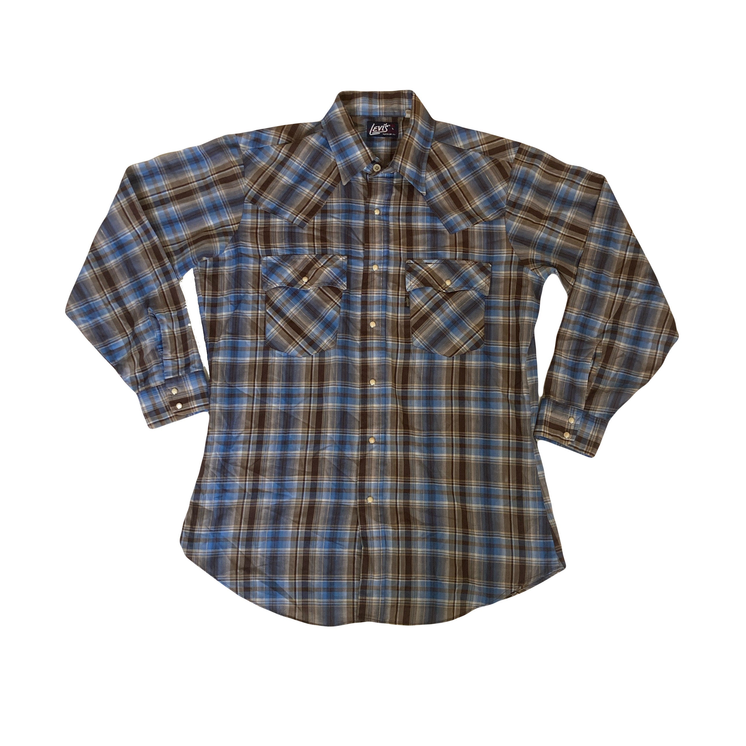 Vintage 80s Levis beige blue brown cotton check plaid western cowboy rancher shirt size large