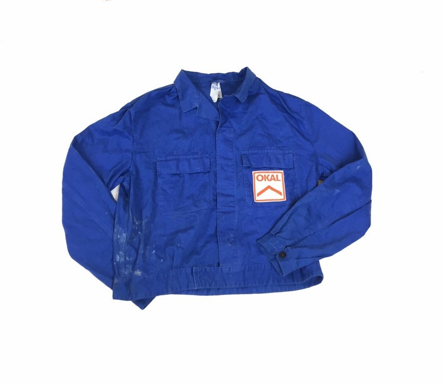 Vintage 80s mid blue workers chore herringbone cotton distressed and paint stained button jacket size large