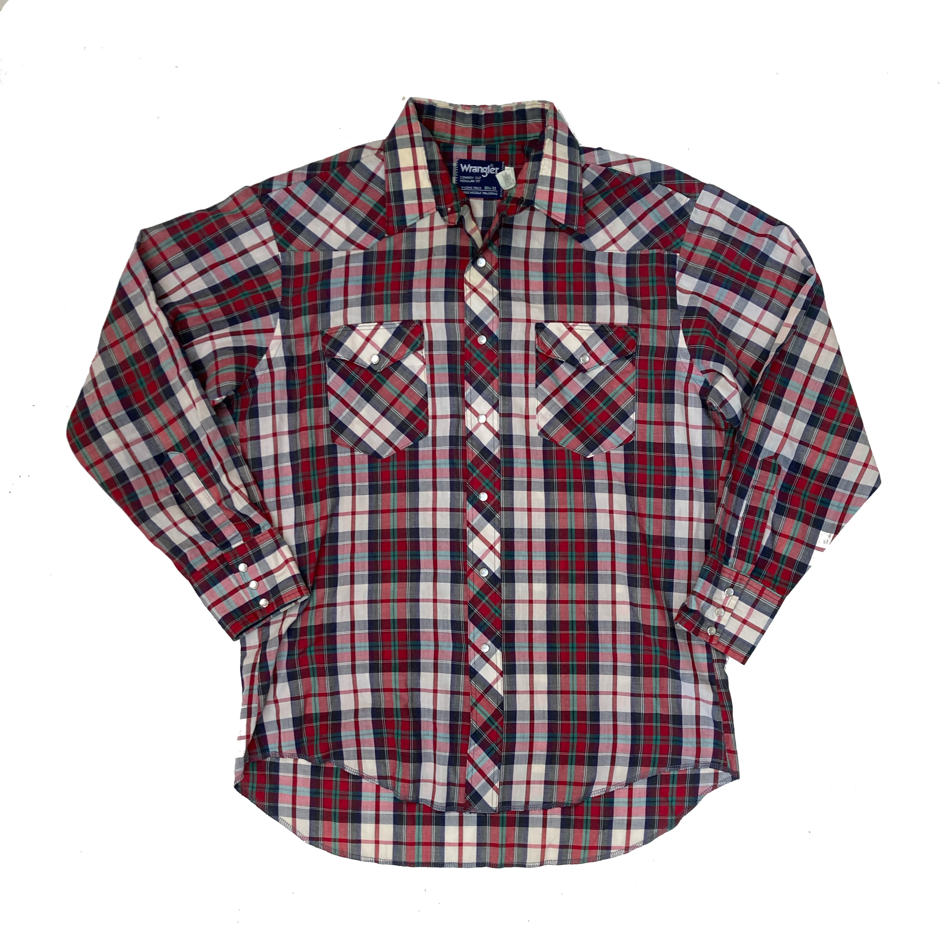 Vintage 80s red grey check western cowboy shirt size large by Wrangler - fine cotton tablecloth check with teal pinstripe in grey/red check