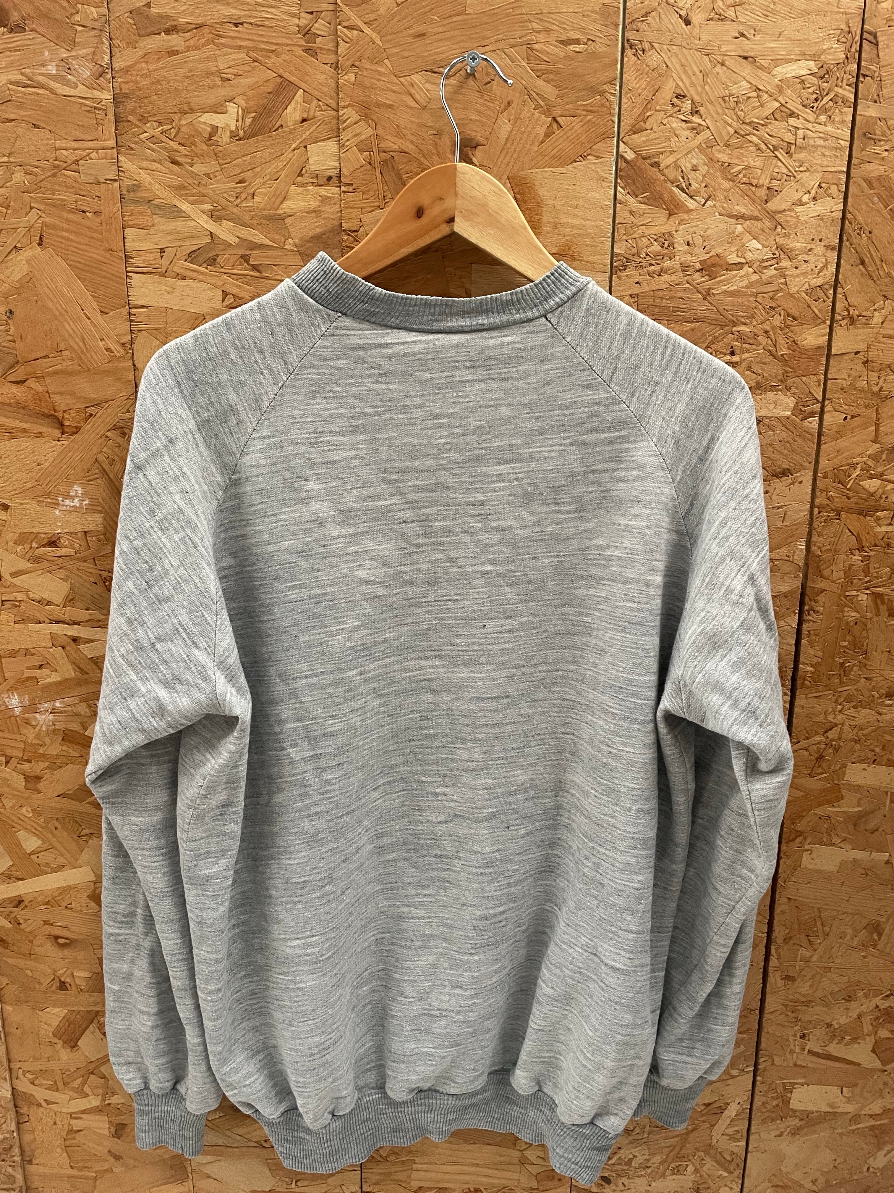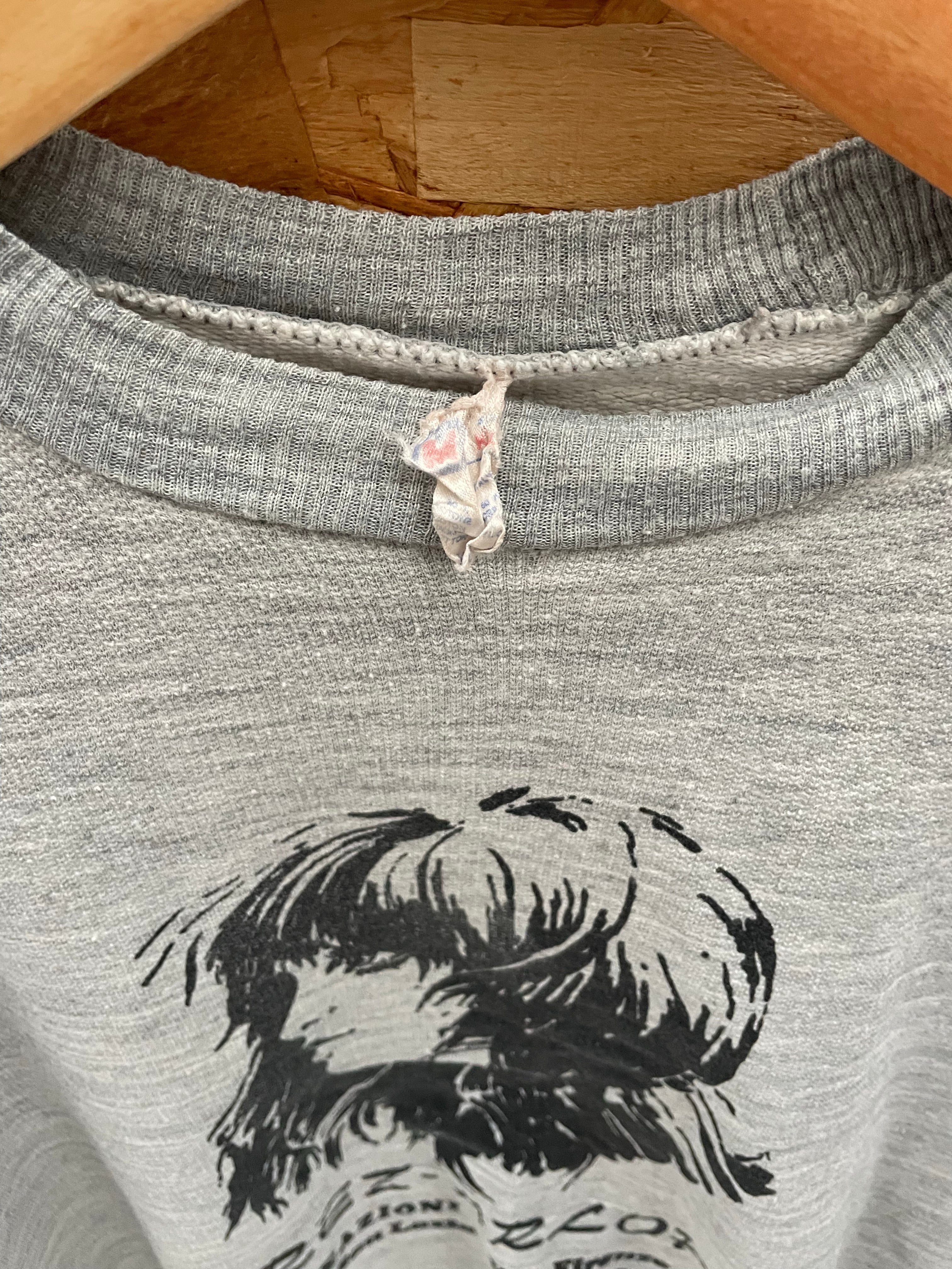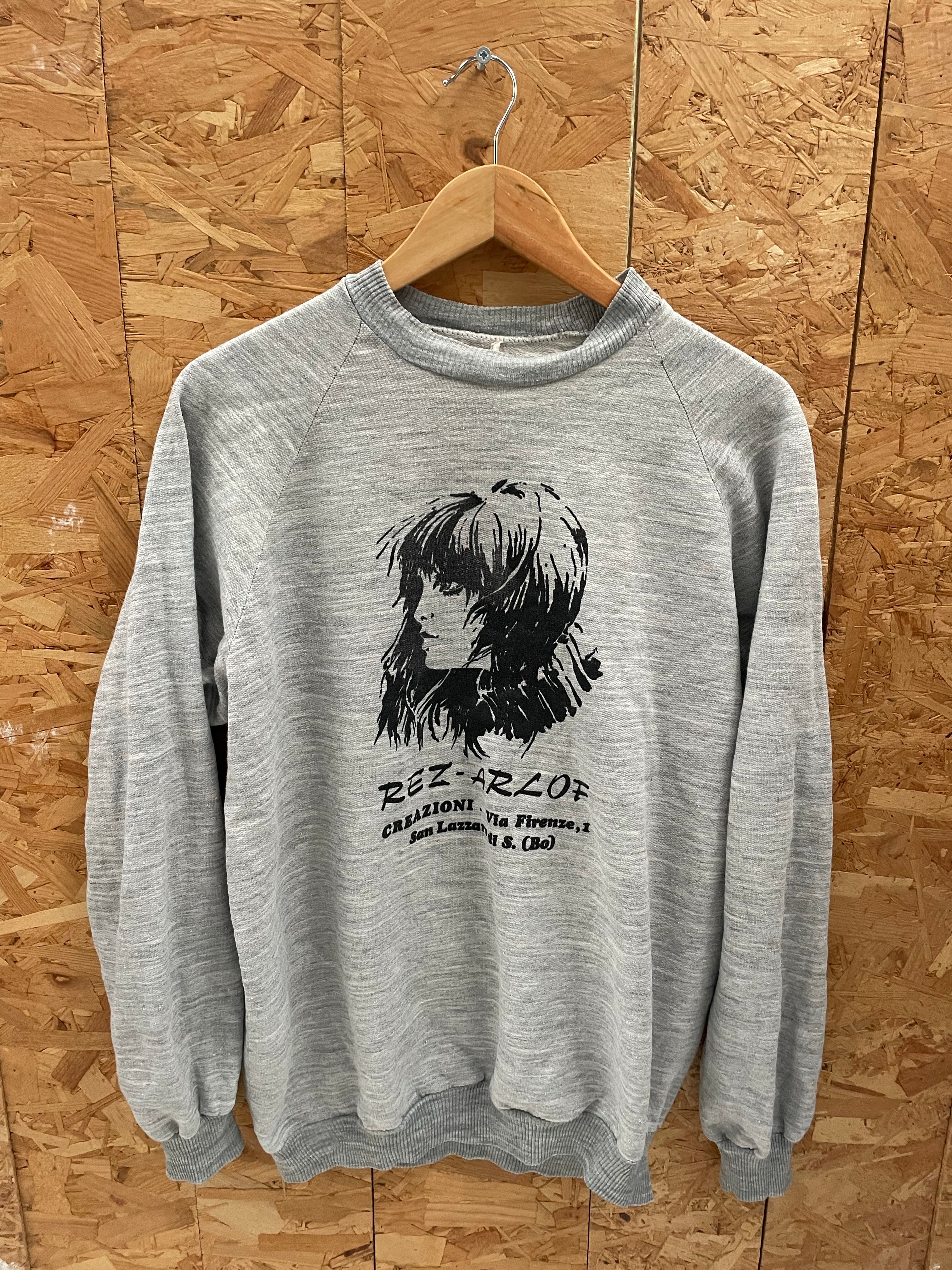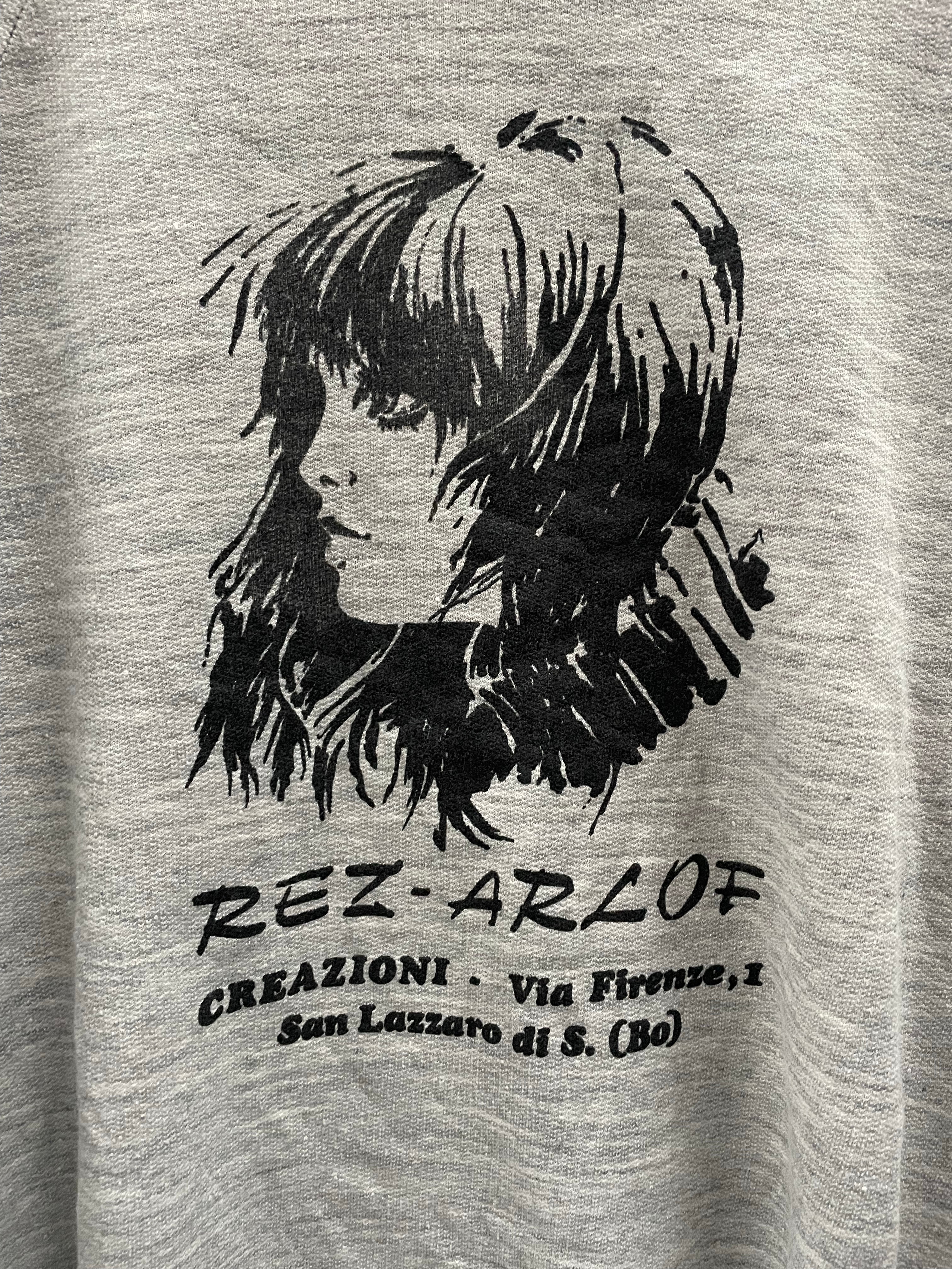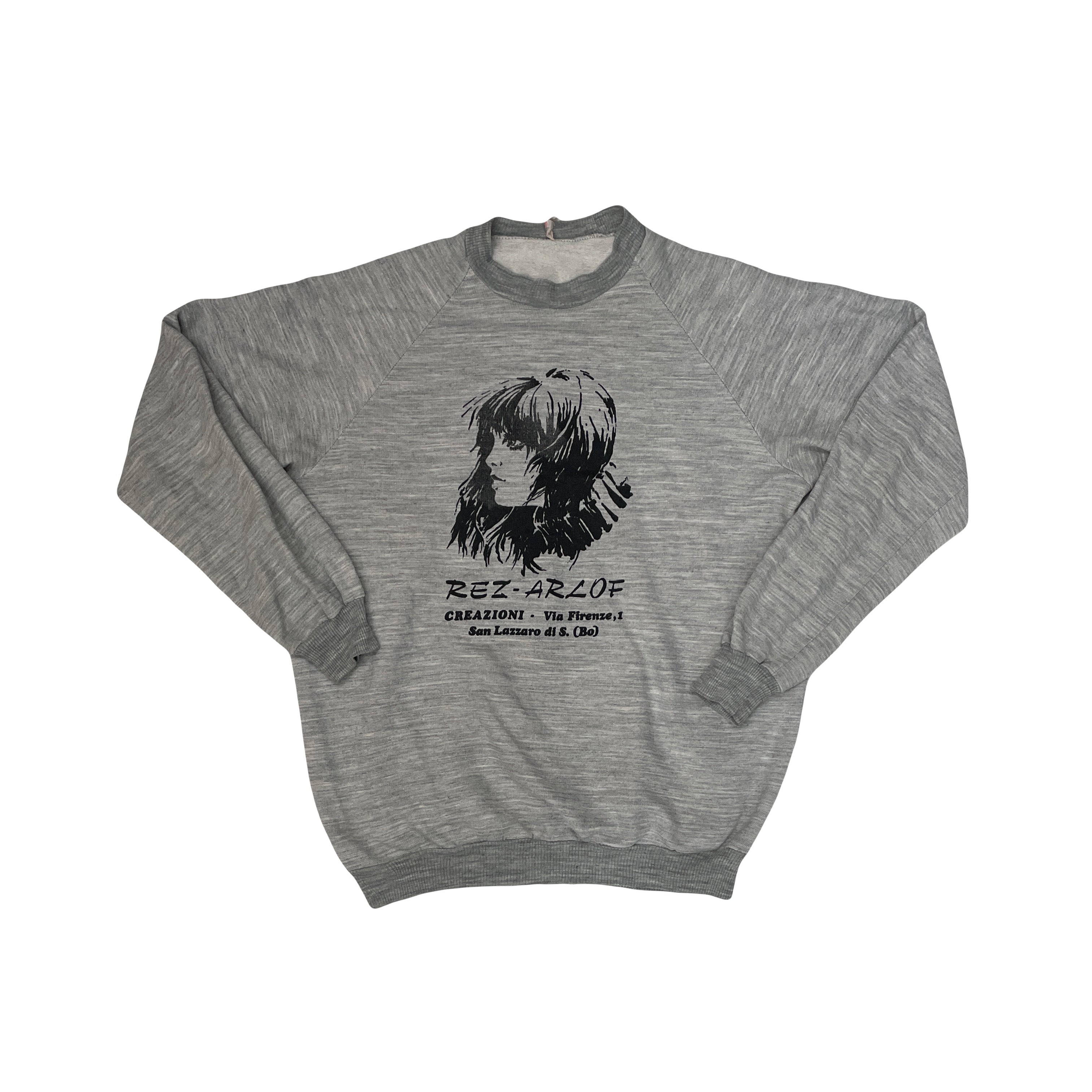 Vintage Rez-Arlof graphic sweatshirt. Features a crewneck and long sleeves. The front has a striking black graphic of a face with the text "REZ-ARLOF CREAZIONI - Via Firenze, 1 San Lazzaro di S. (Bo)". Made from a soft, heathered grey fabric. Perfect for