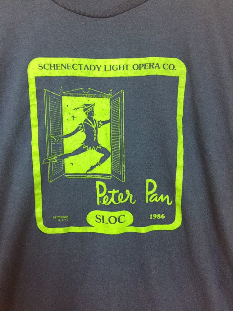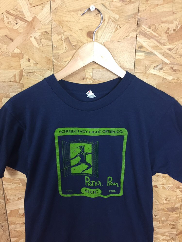 Really cool Vintage 80s Schenectady Light Opera Co Peter Pan 1986 theatre production. USA navy blue t shirt size Medium