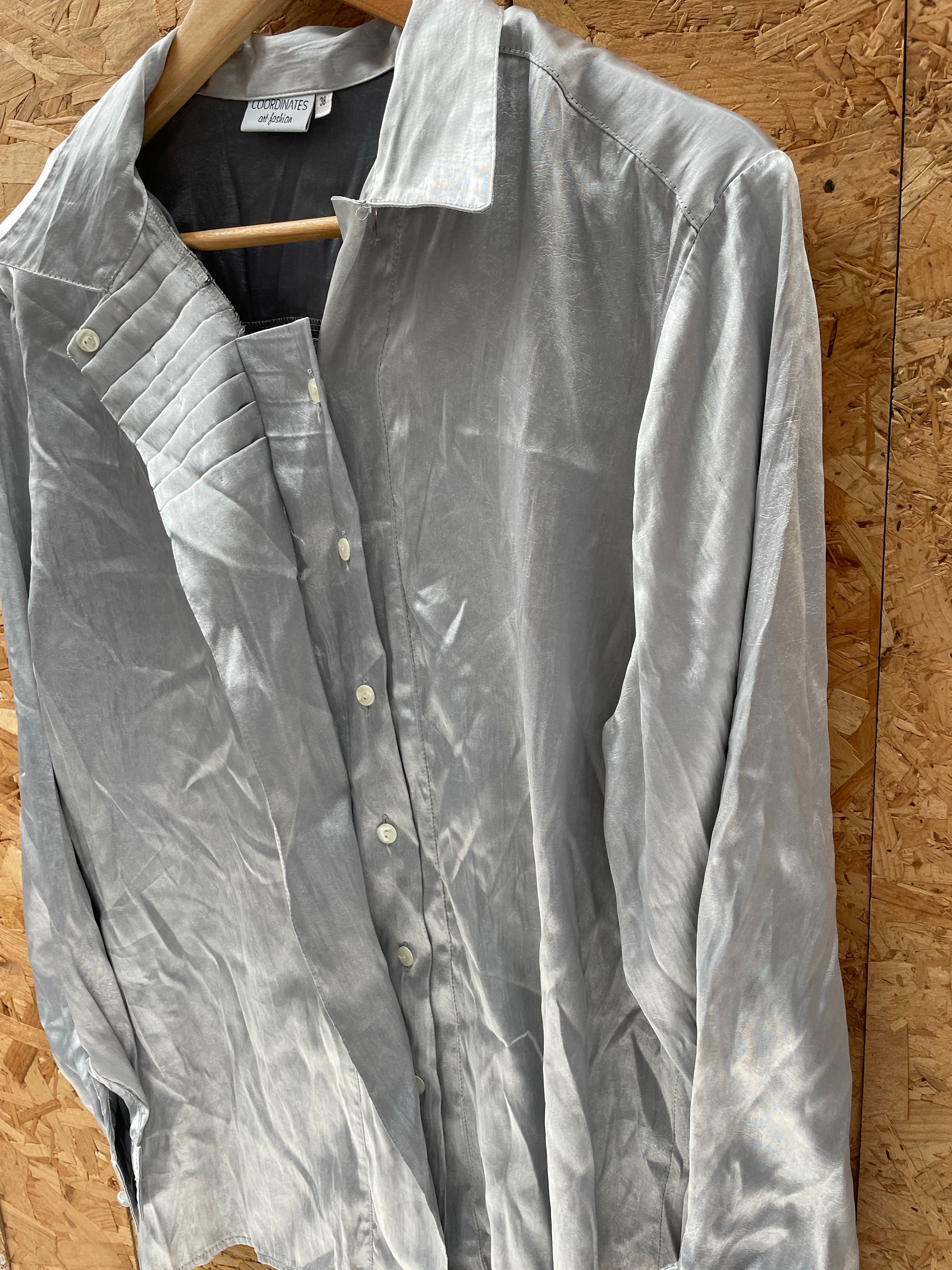 Vintage COORDINATES silver satin long sleeve button up shirt blouse. Size label 38, fits as a large. Excellent condition. Features pleated detail at collar and hidden buttons Color: Silver.