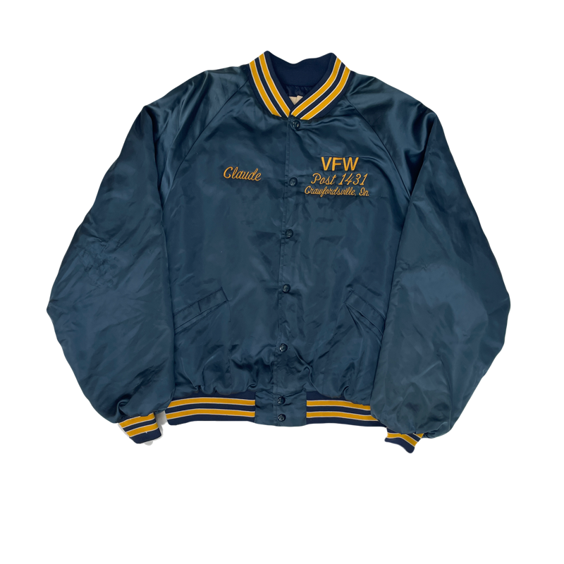 Vintage VFW Post 1431 satin baseball jacket. Dark blue with gold and navy stripes. Embroidered with 'Claude' and VFW Post details. Pre-owned, shows some wear. USA made size label is XL fits as large