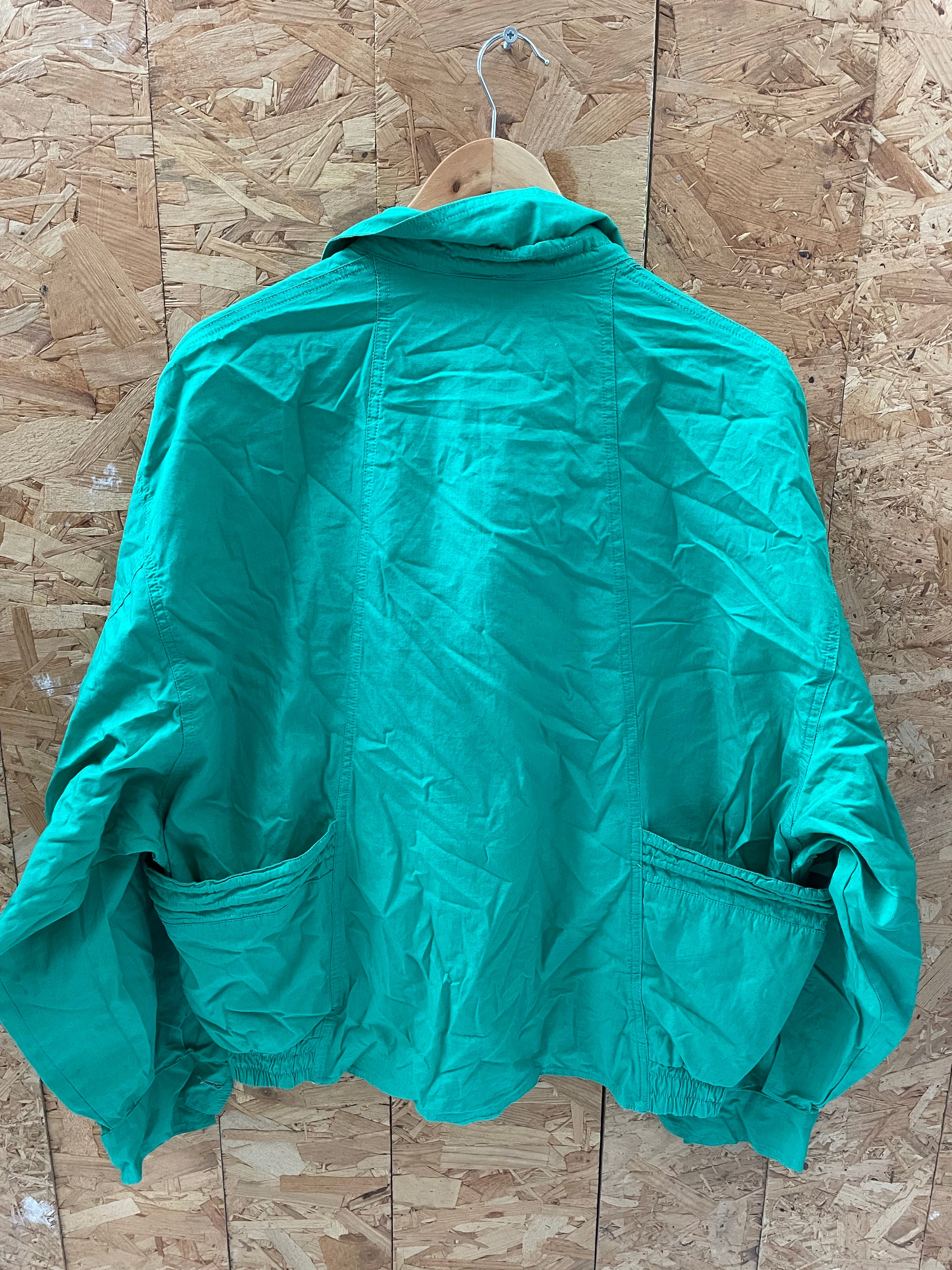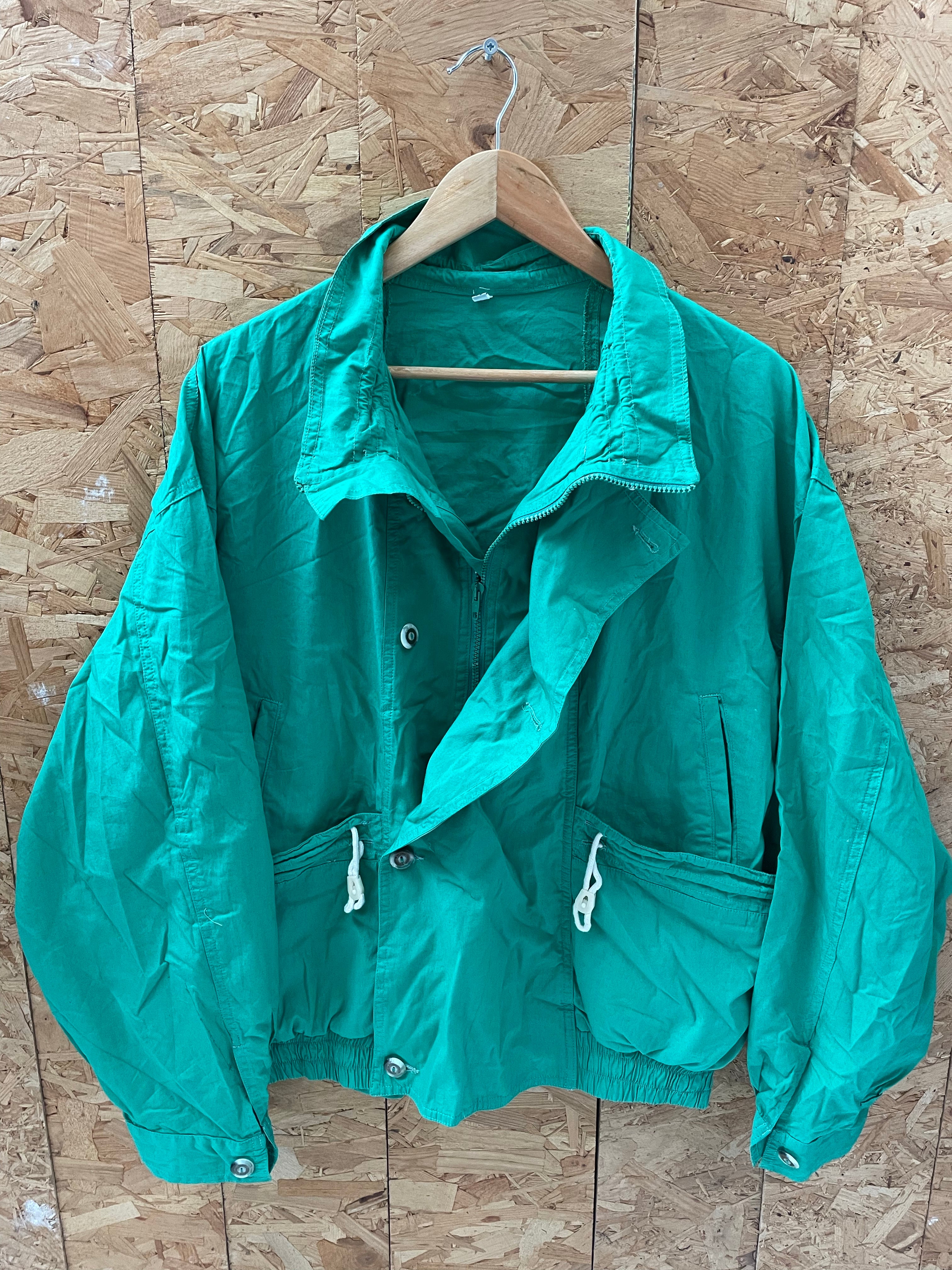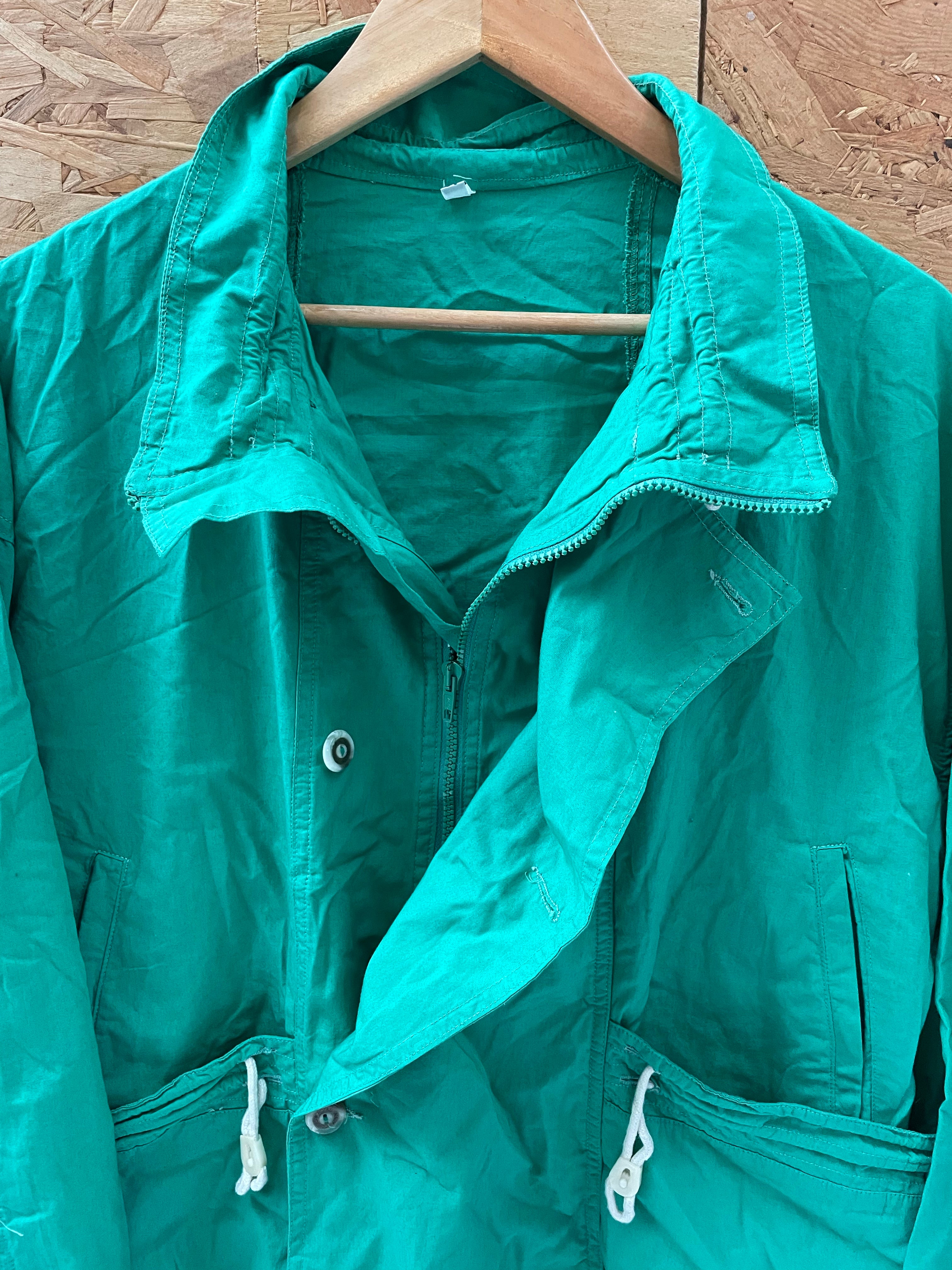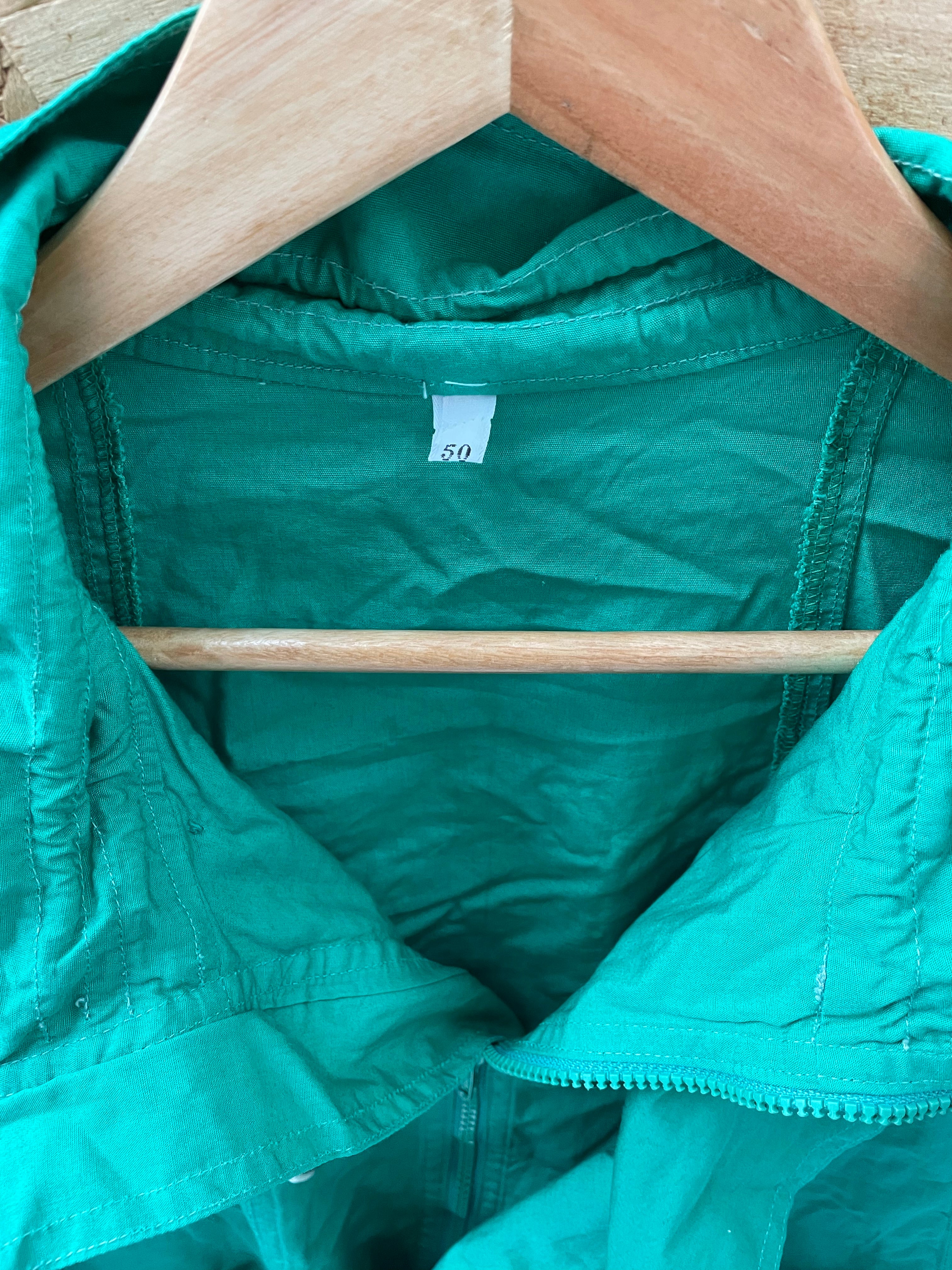 Vintage green jacket. Size says 50, fits as a large. Features a zip-up front, button closure, and multiple pockets and a utilitarian or nautical quirky vibe. Great condition. Lightweight and comfortable. Color: Green.