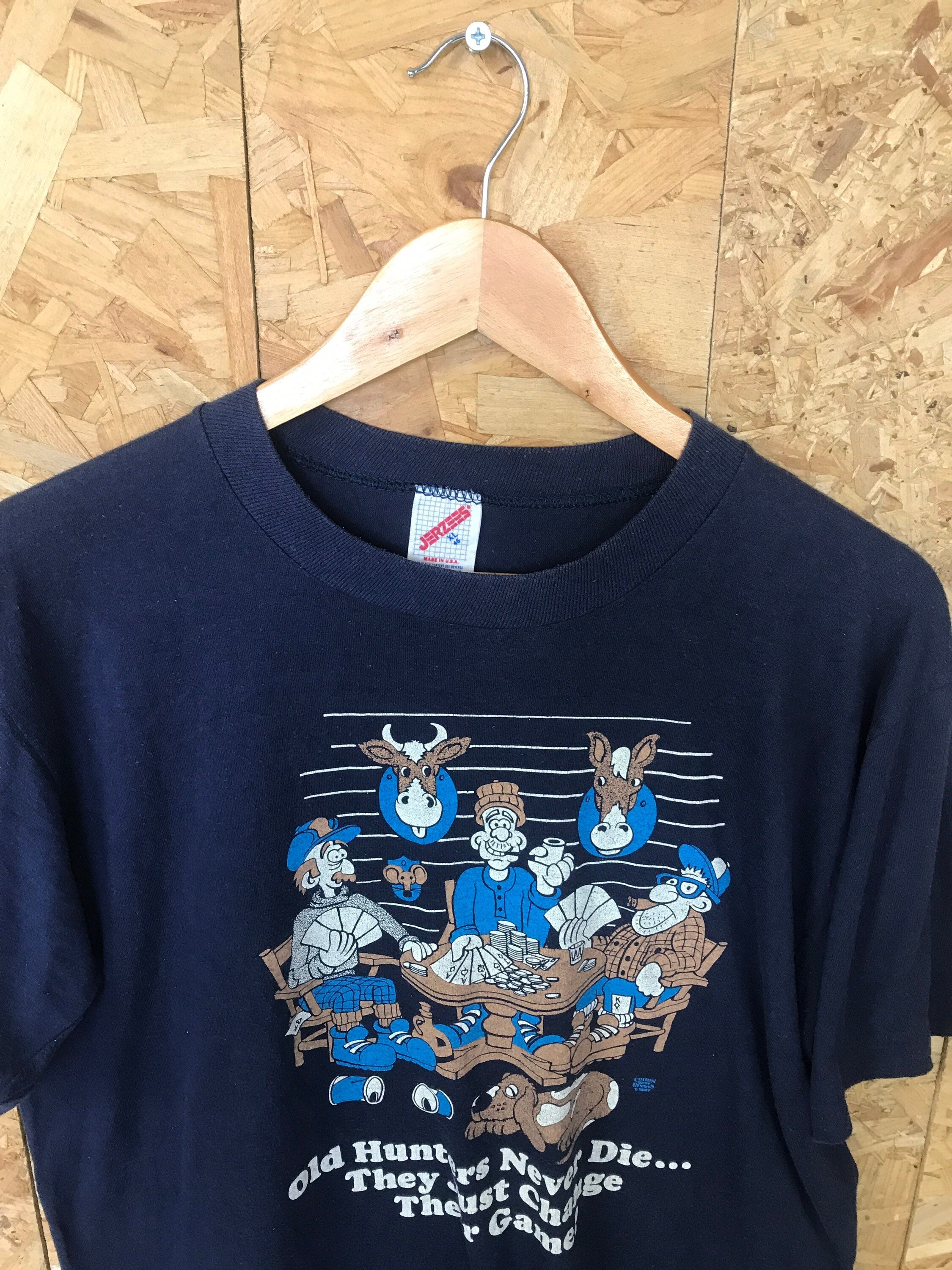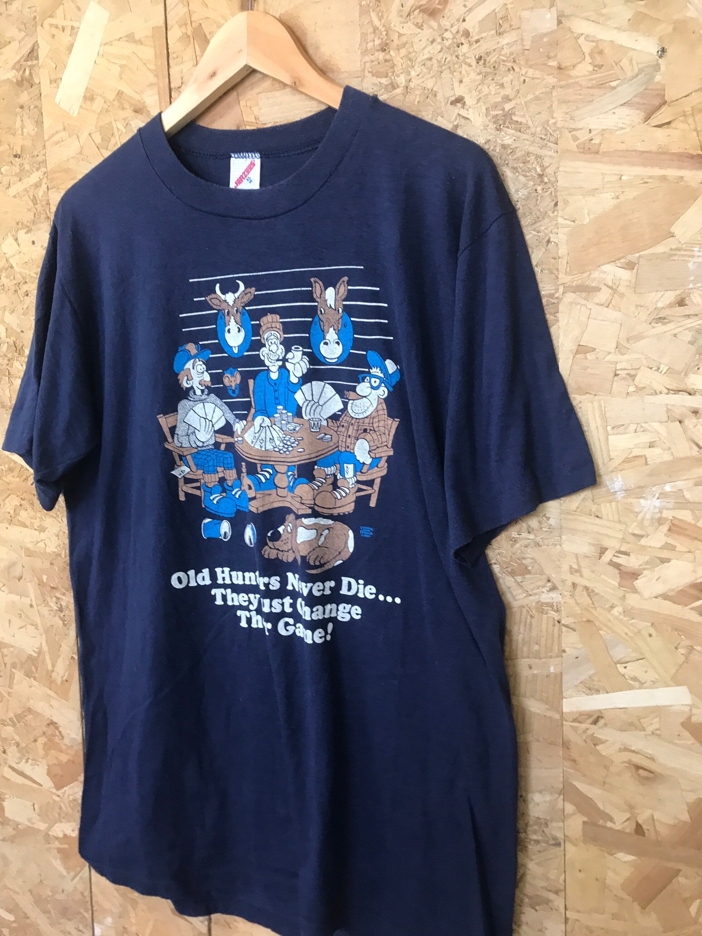 Vintage 87 old hunters never die, they just change their game USA souvenir navy blue t shirt size XL
