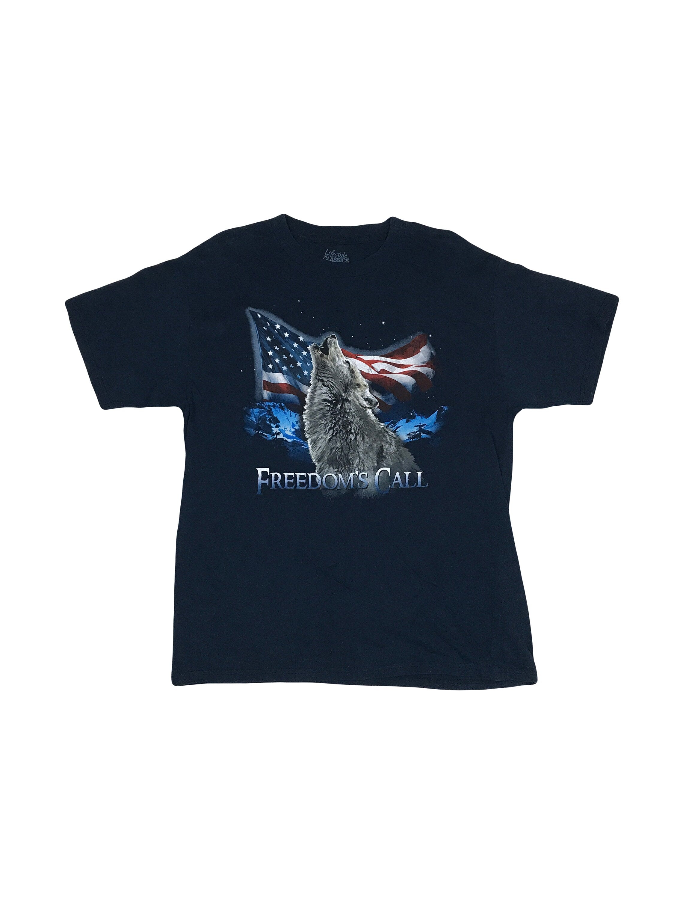 Vintage 90s 'Freedom Calling' American Flag howling wolf USA souvenir nature print blue quirky patriotic t-shirt size large