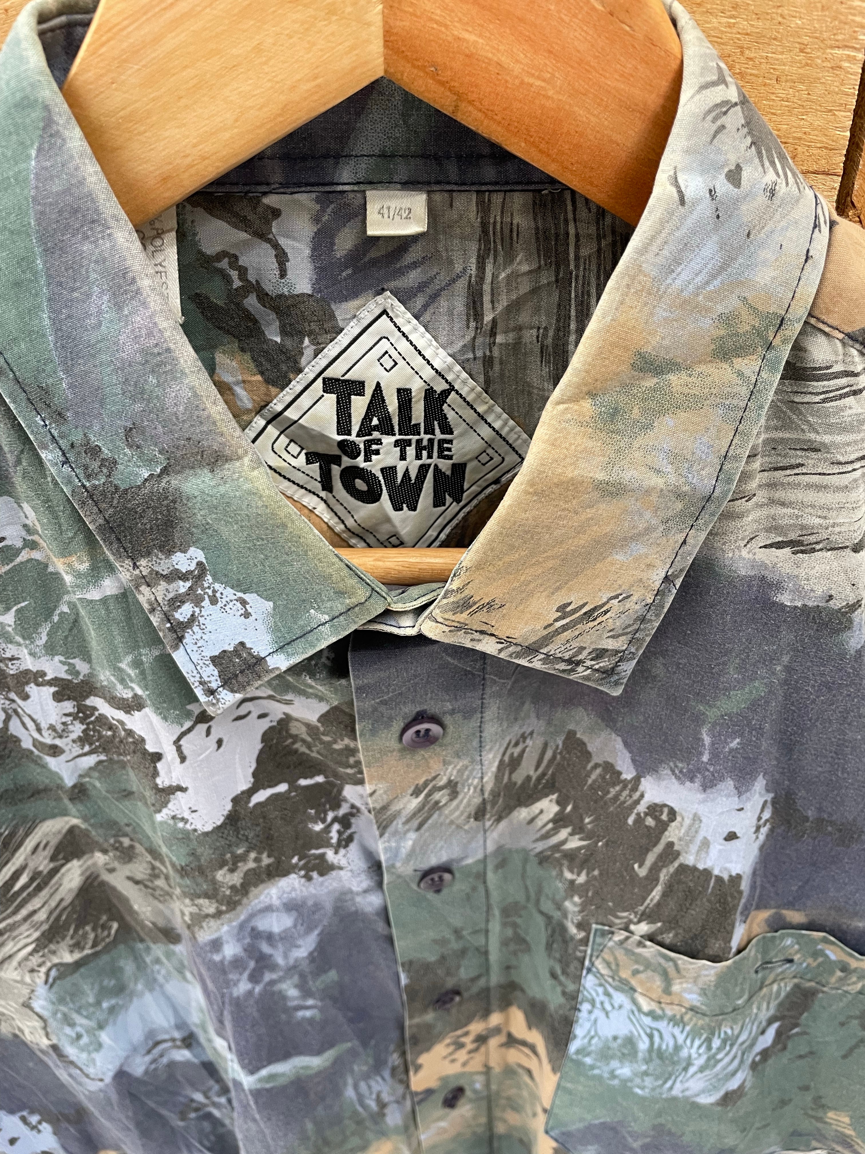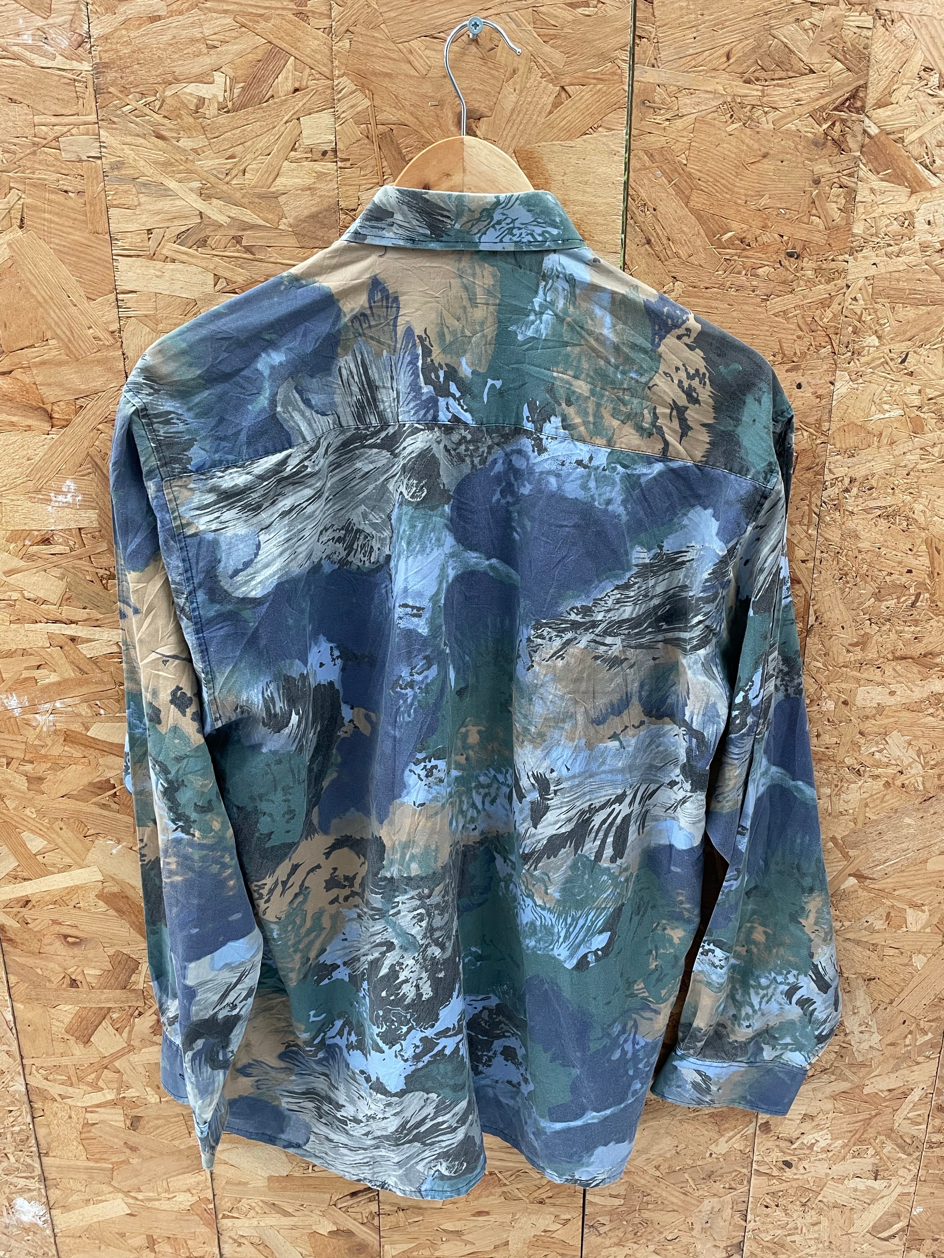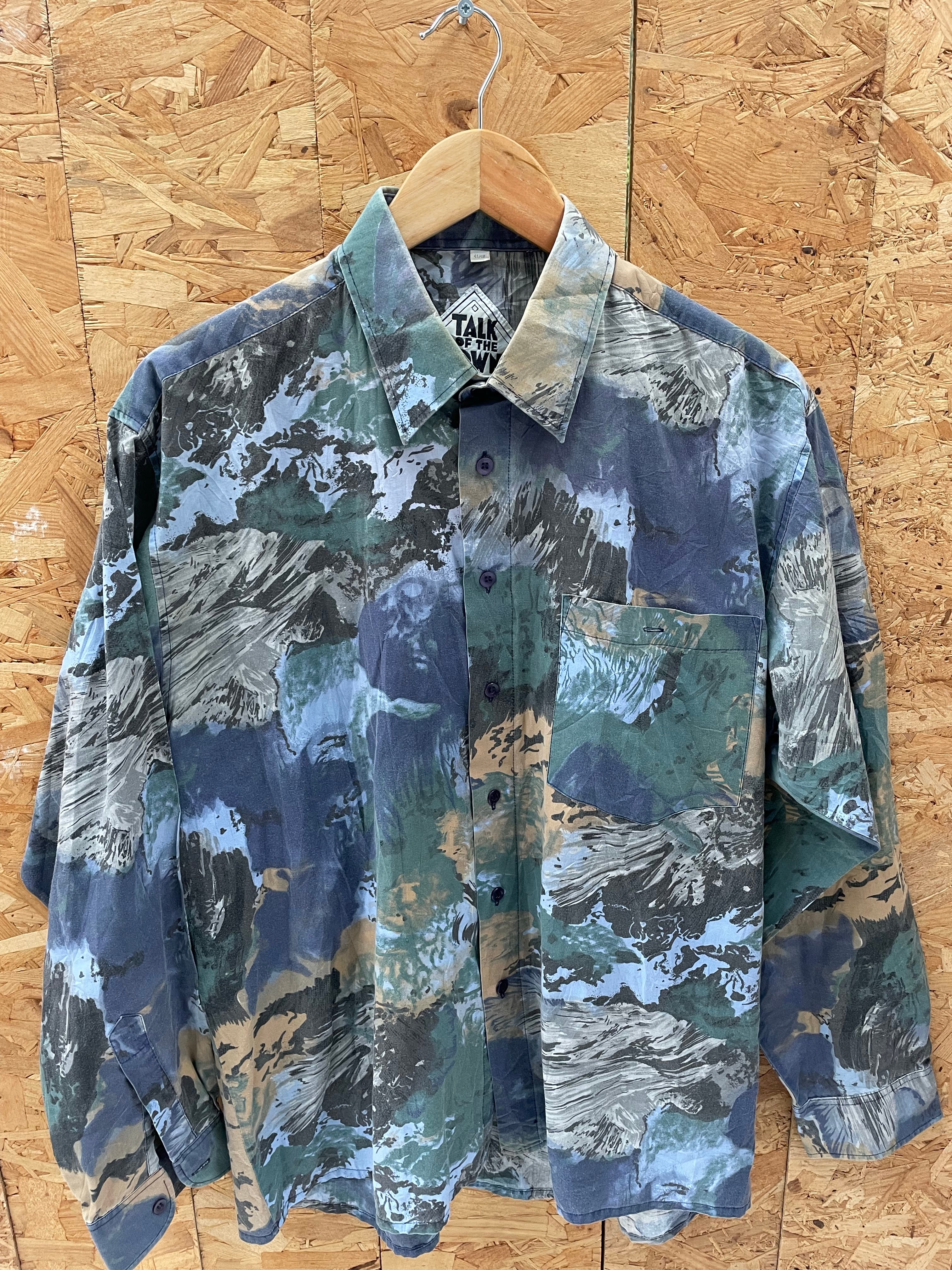 Talk of the Town long sleeve button up shirt. Features an abstract print in blues, greens, and tans. Size L. Excellent pre-owned condition. size label is 41/42 Color: Multicolor.