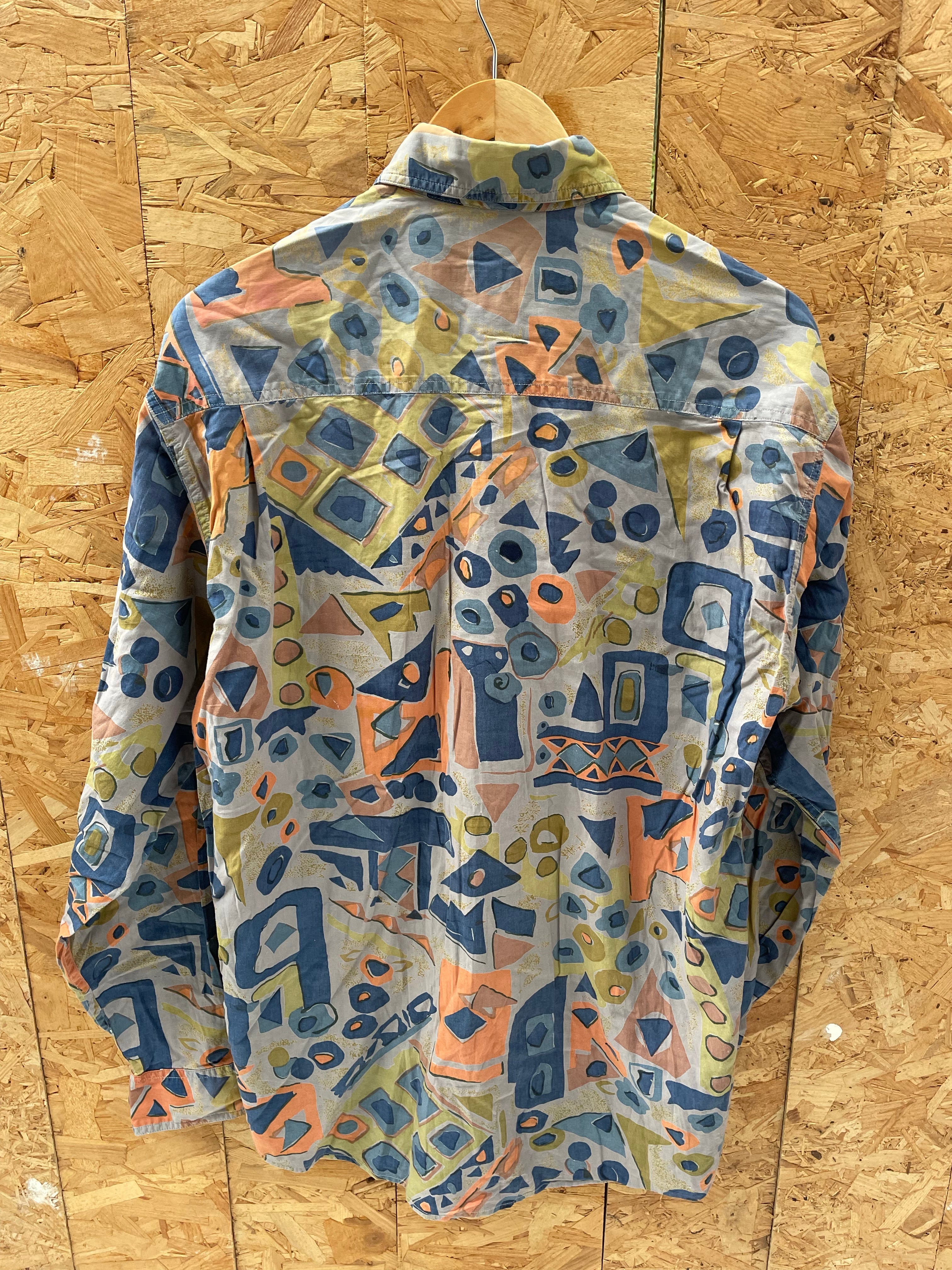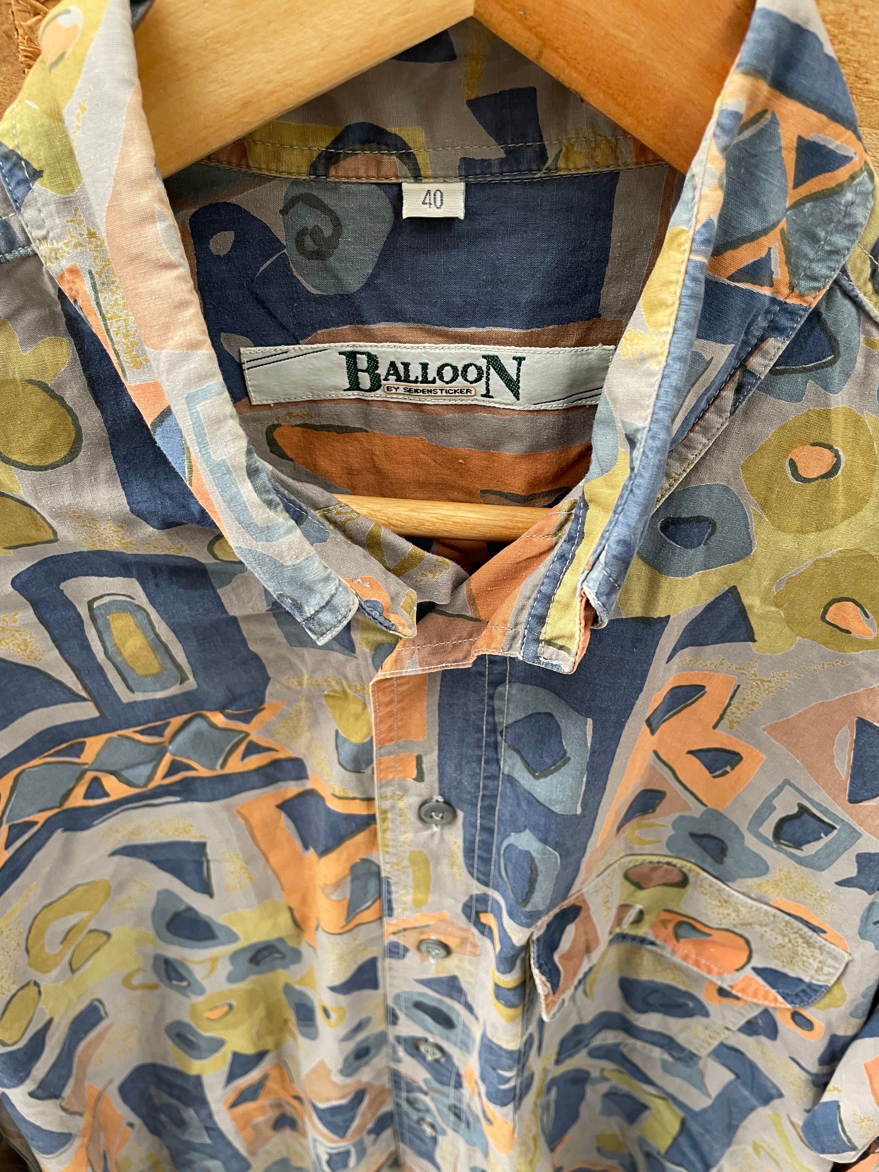 Vintage Balloon long sleeve button-up shirt. Features an abstract geometric print in muted blues, oranges, and beige. Size 40. Excellent pre-owned condition. Color: Multicolor.