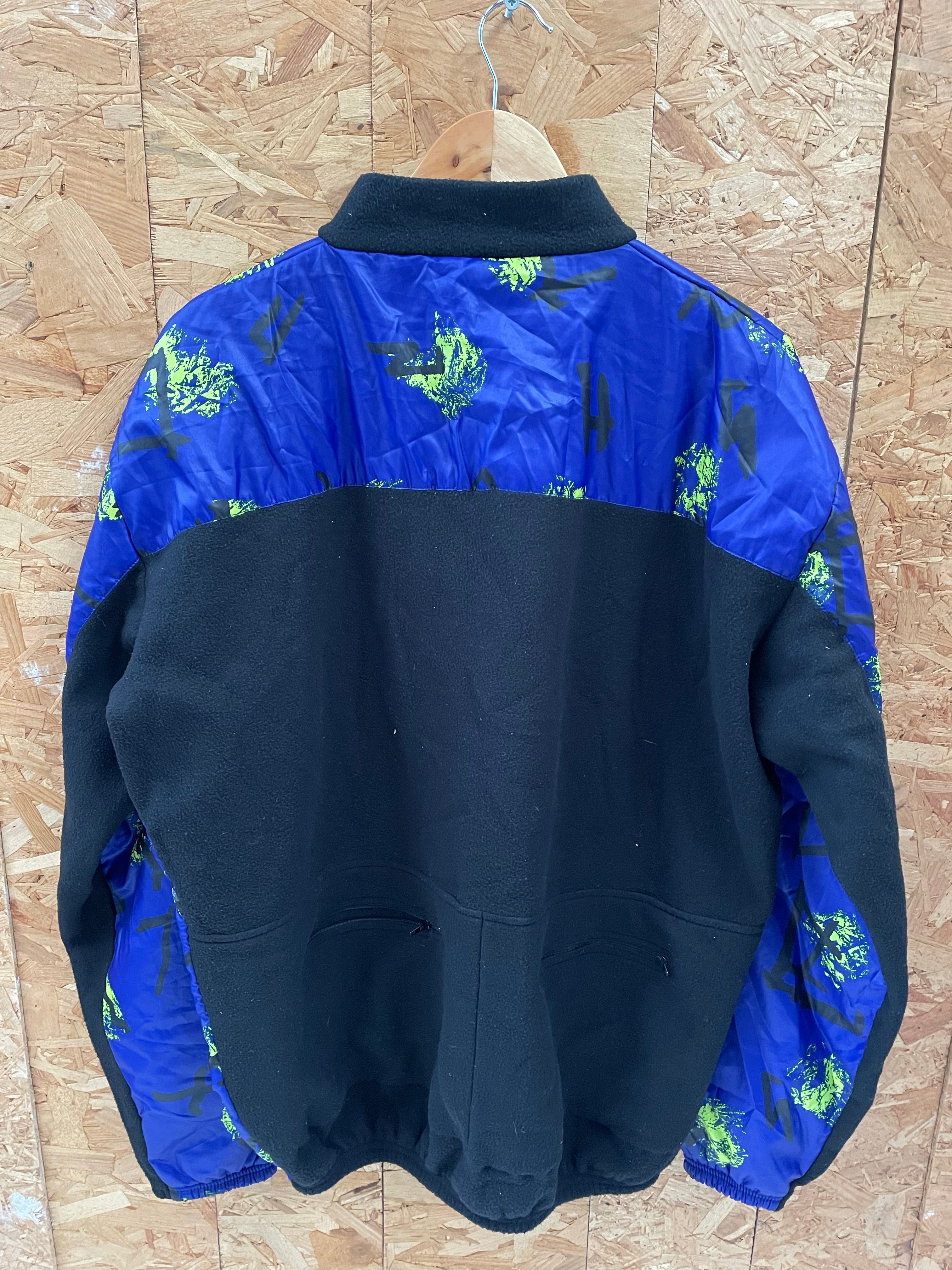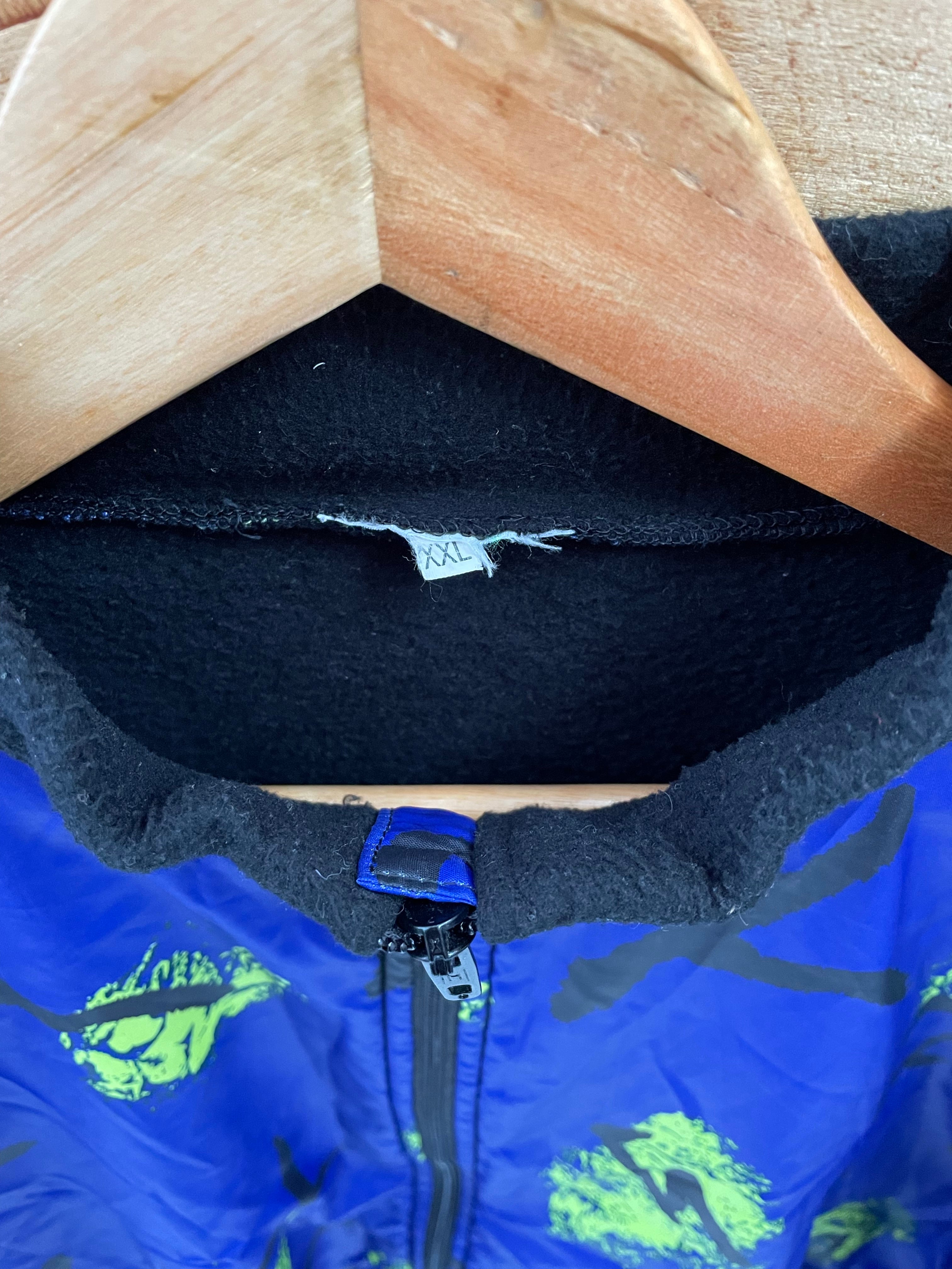 Vintage cycling jacket featuring a vibrant blue base with a bold neon yellow and black graphic print. This full-zip jacket has black ribbed cuffs and hem, and a comfortable black fleece lining. Perfect for a retro winter ride Color: Blue. Size: XXL