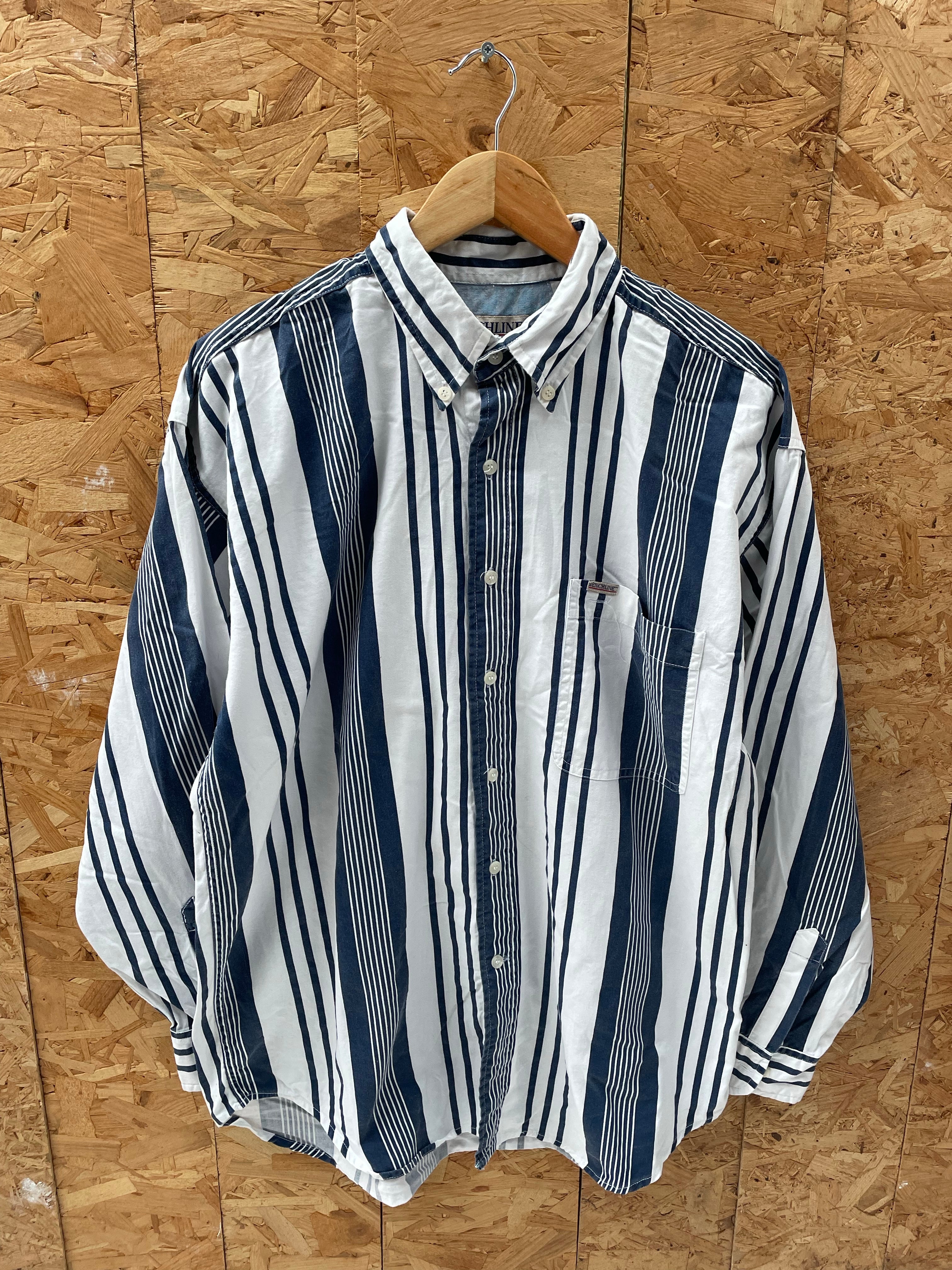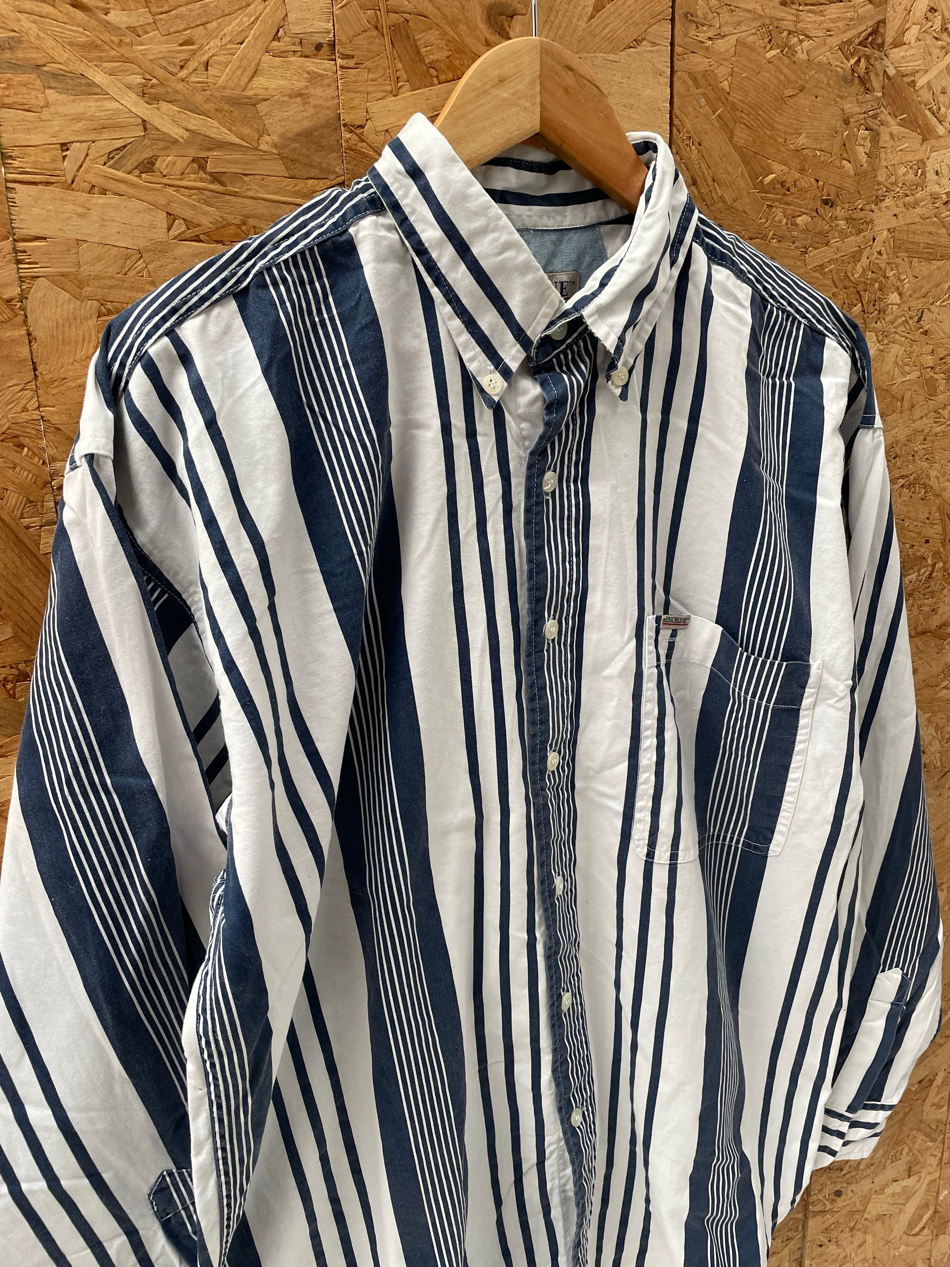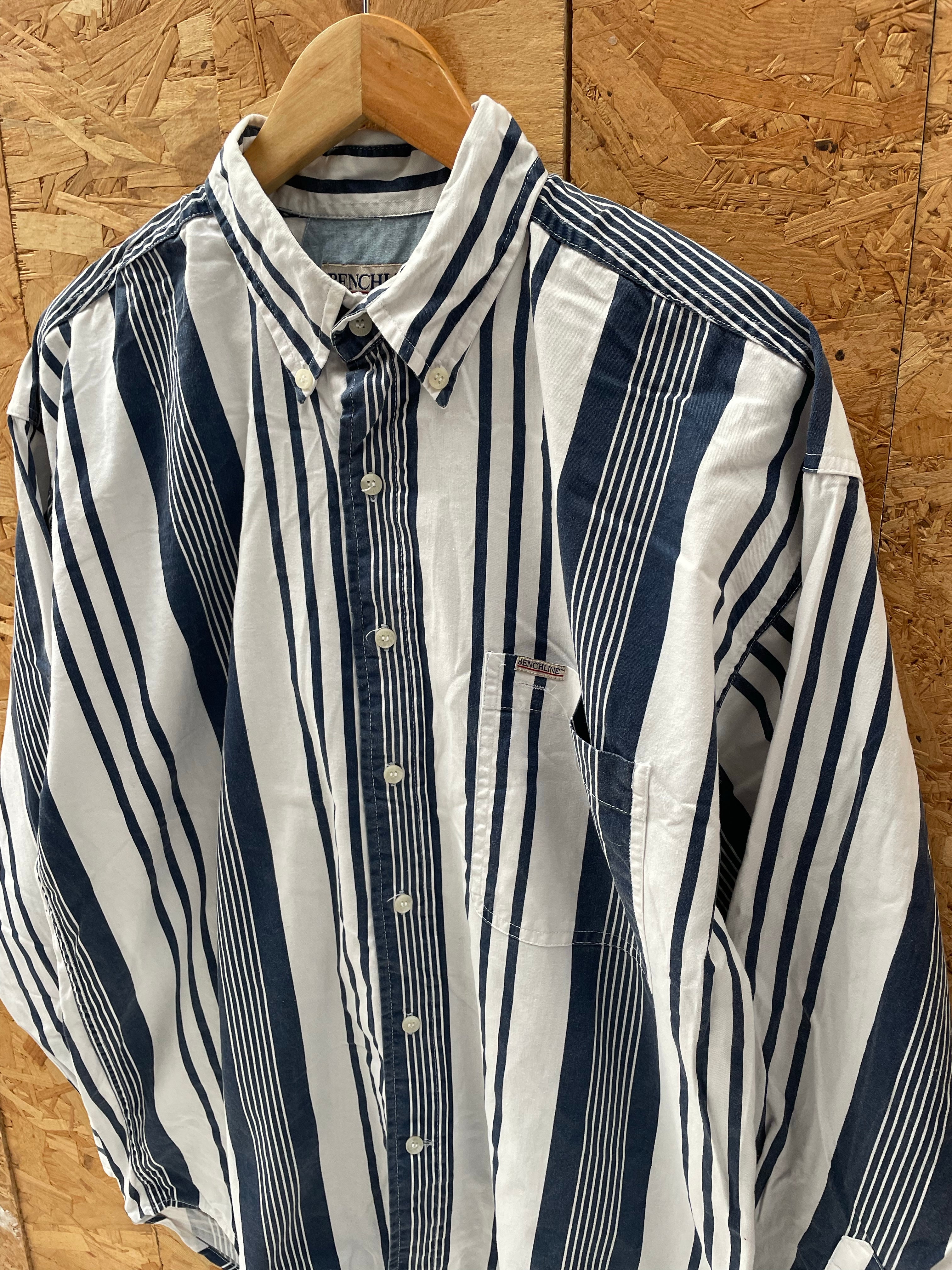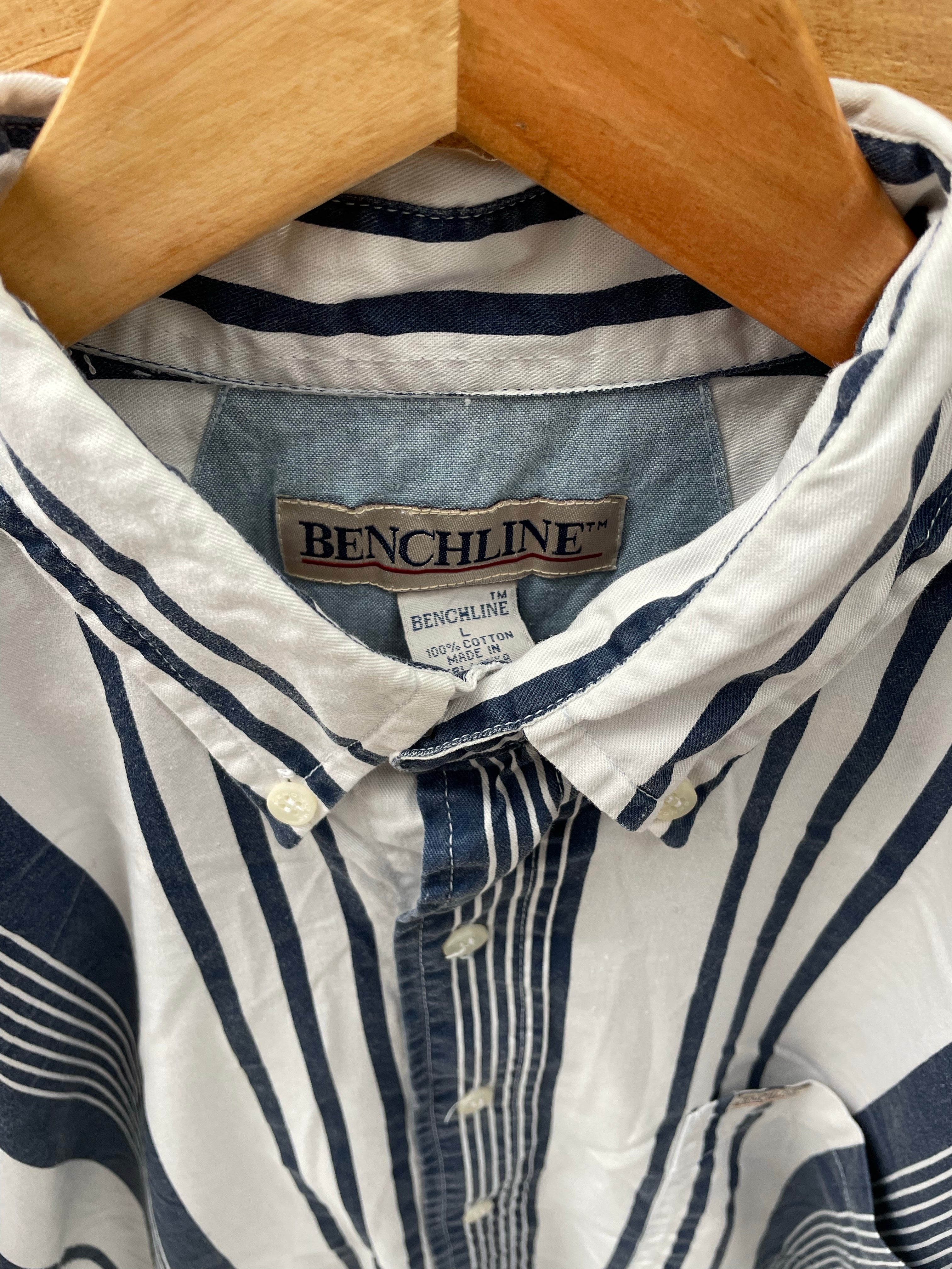 Vintage Benchline men's long sleeve button-up shirt. Features a classic blue and white striped pattern. Size L. Great condition. Color: Blue & White.