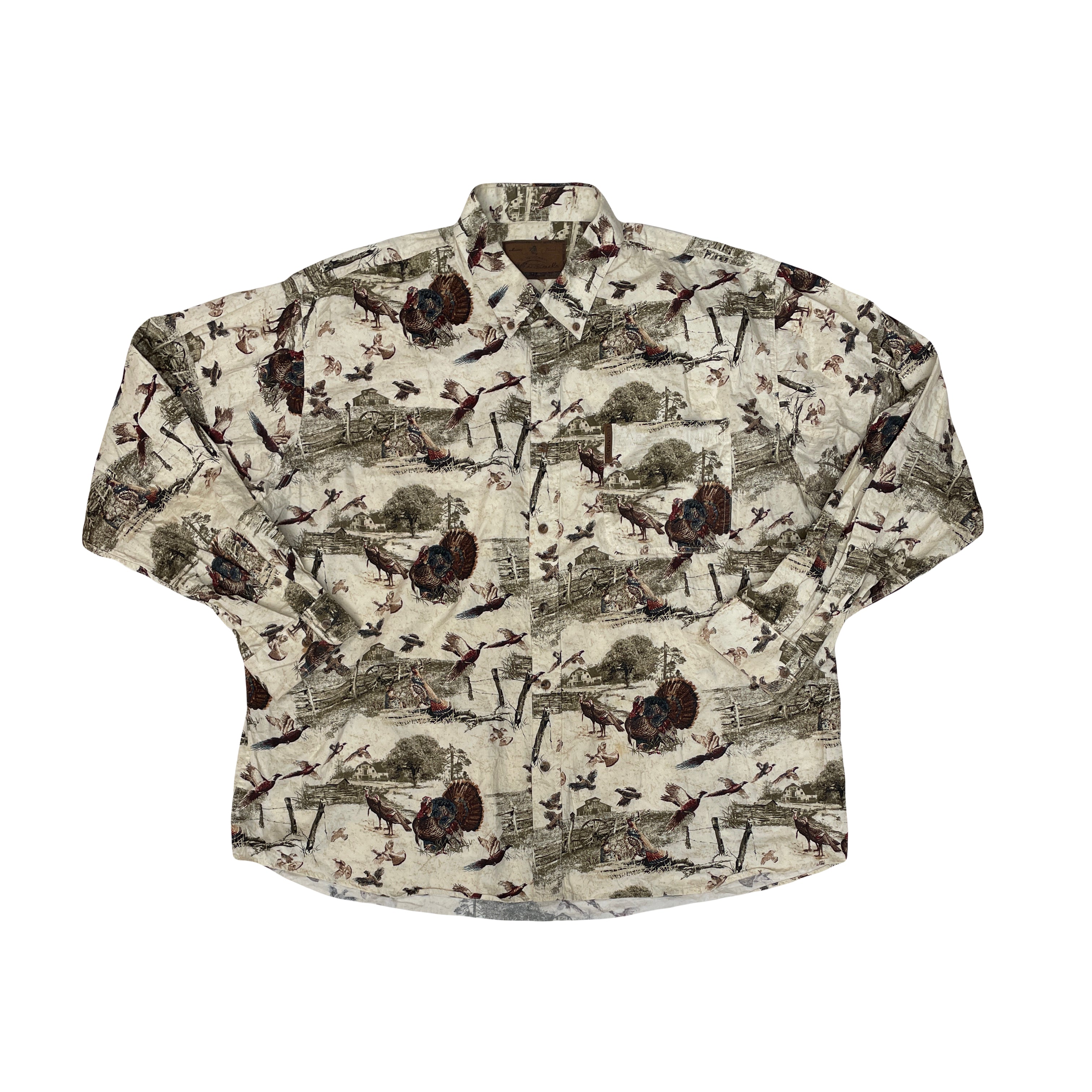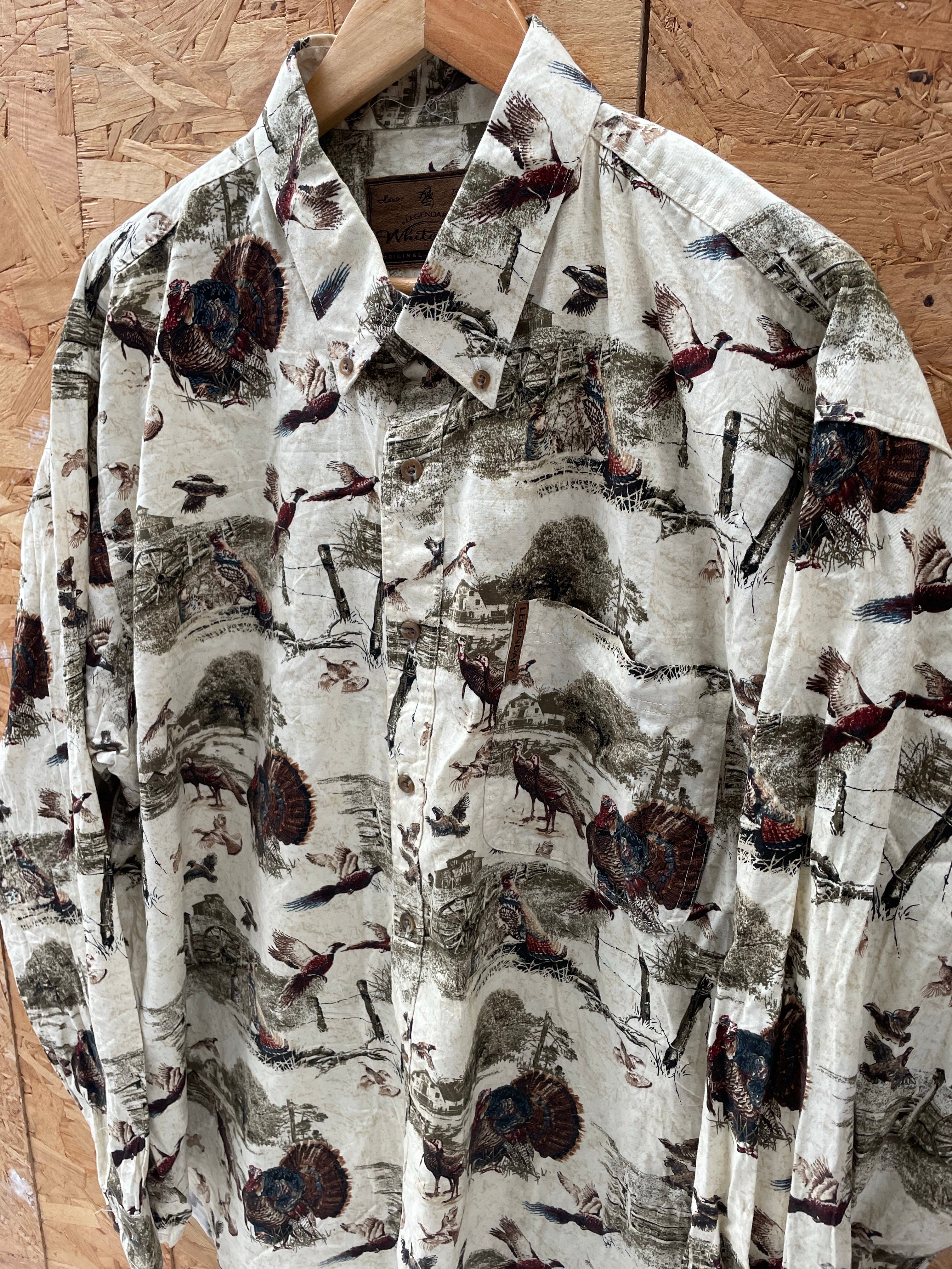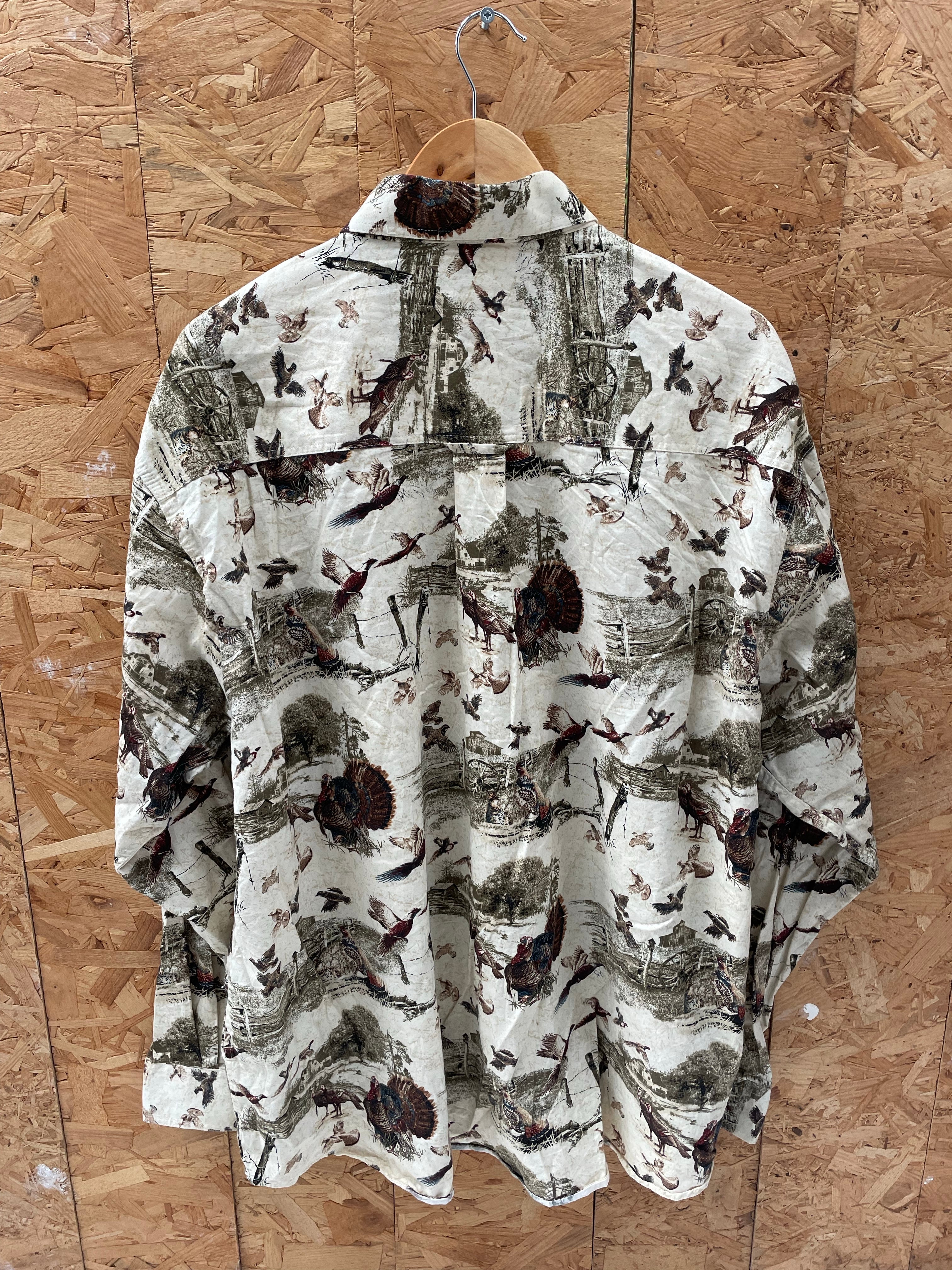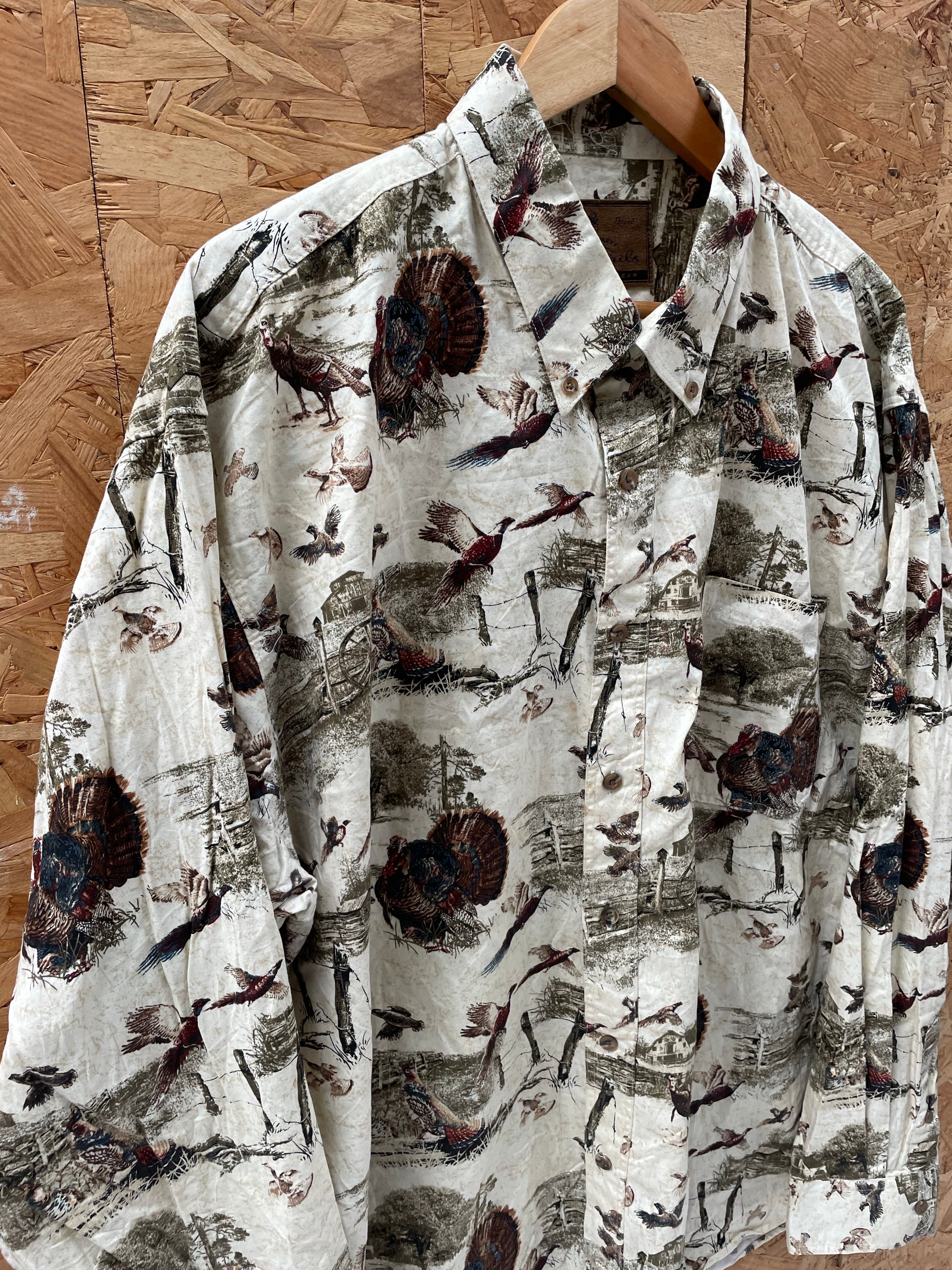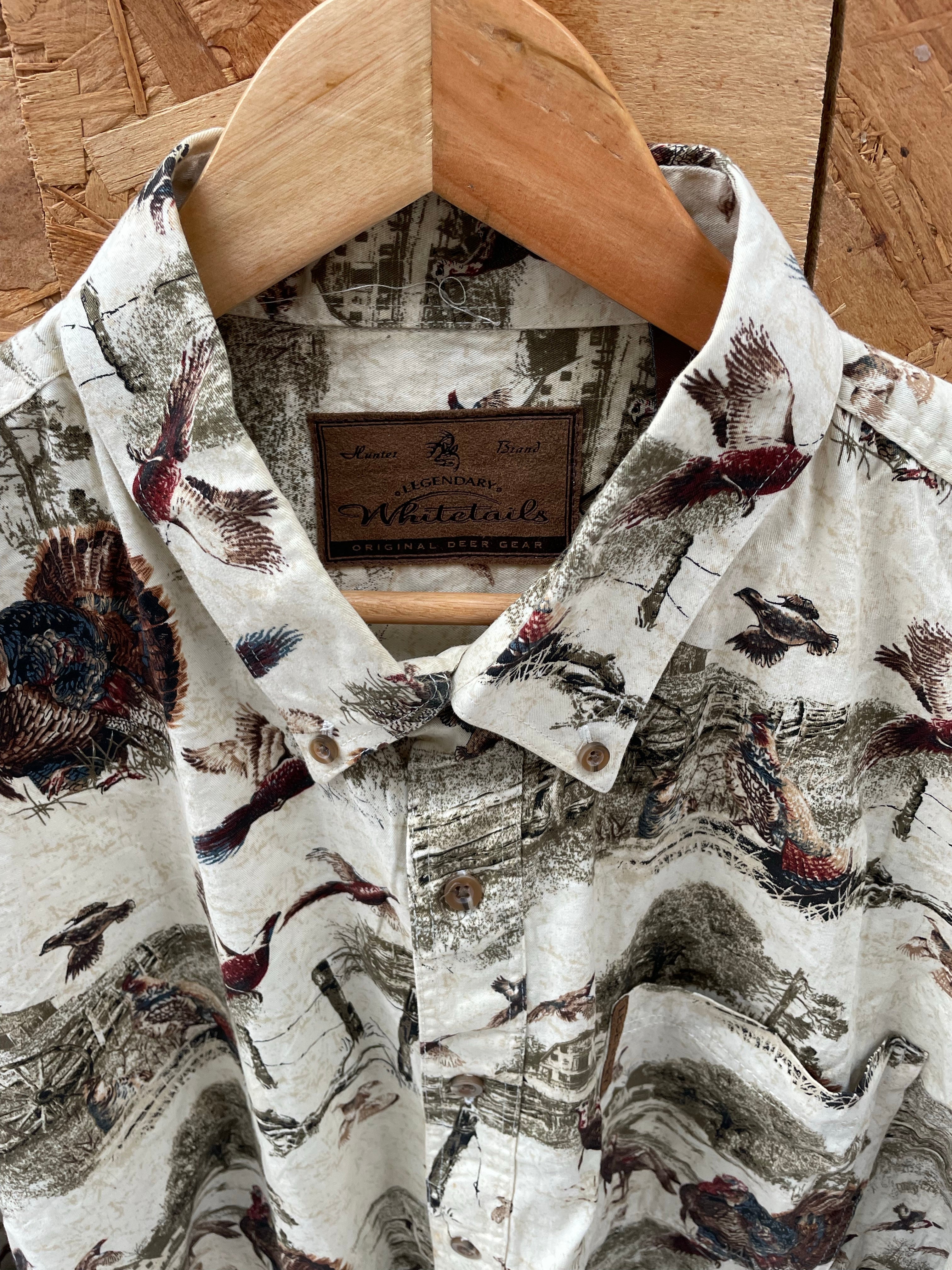 Whitetails men's long sleeve button-up shirt. Features an all-over bird and hunting print on a beige background. Soft brushed cotton feel. Great for outdoorsmen! Size XXL Color: Beige, Green, Brown.