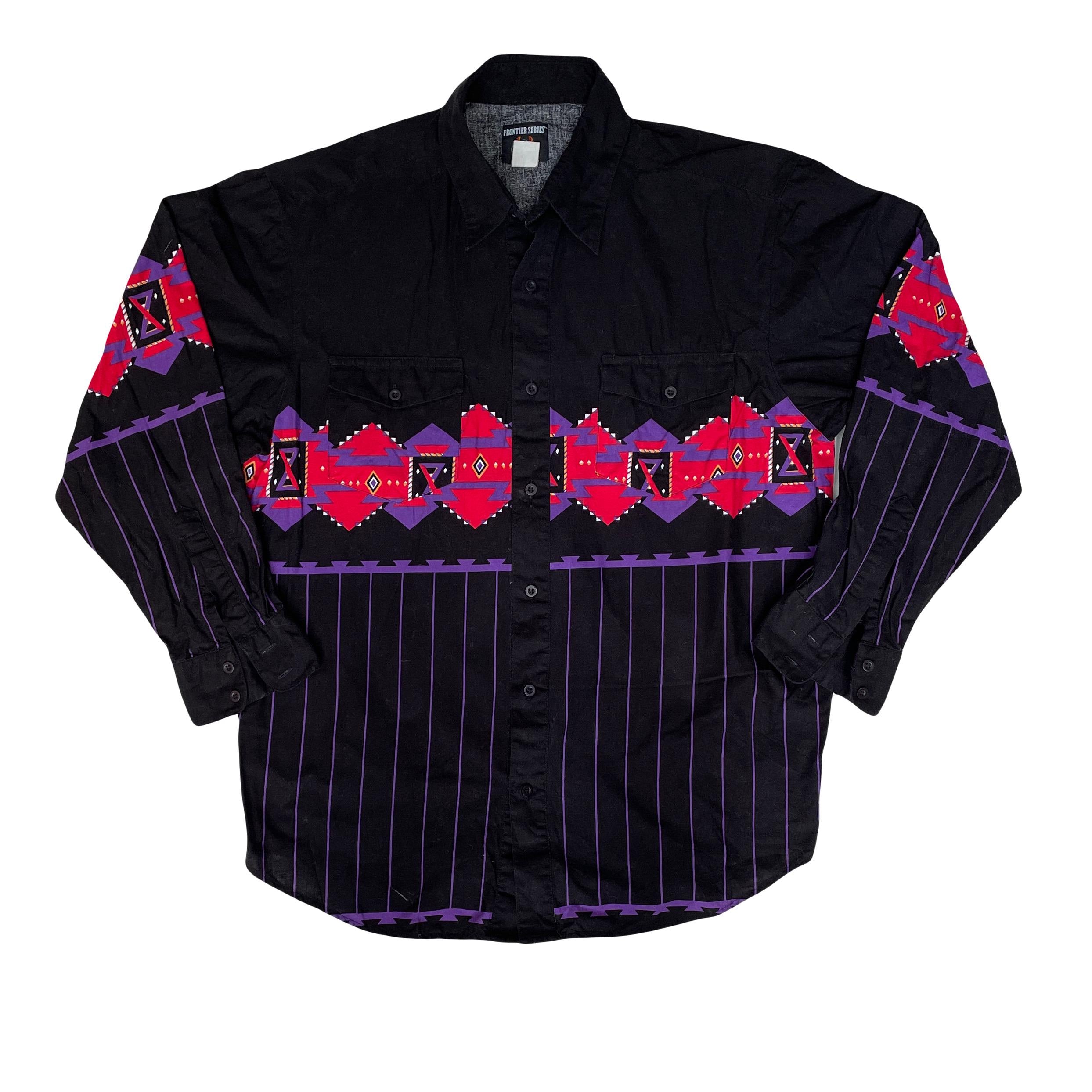 Vintage 90s black cotton western shirt with purple Aztec Navajo chest band pattern size large by Frontier Series