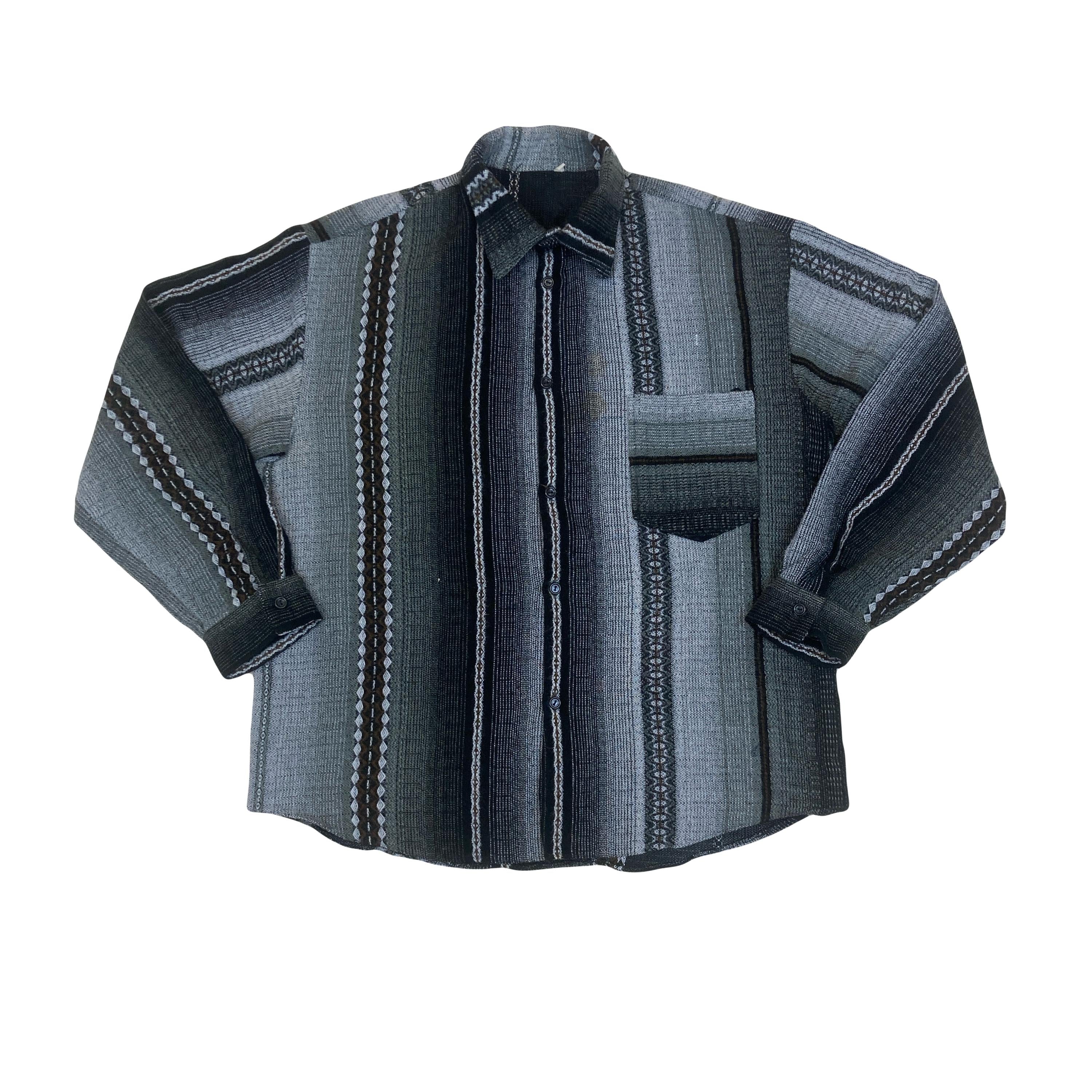 Vintage 90s black grey brown ethnic Navajo Aztec stripe wool mix men’s long sleeve shirt size large