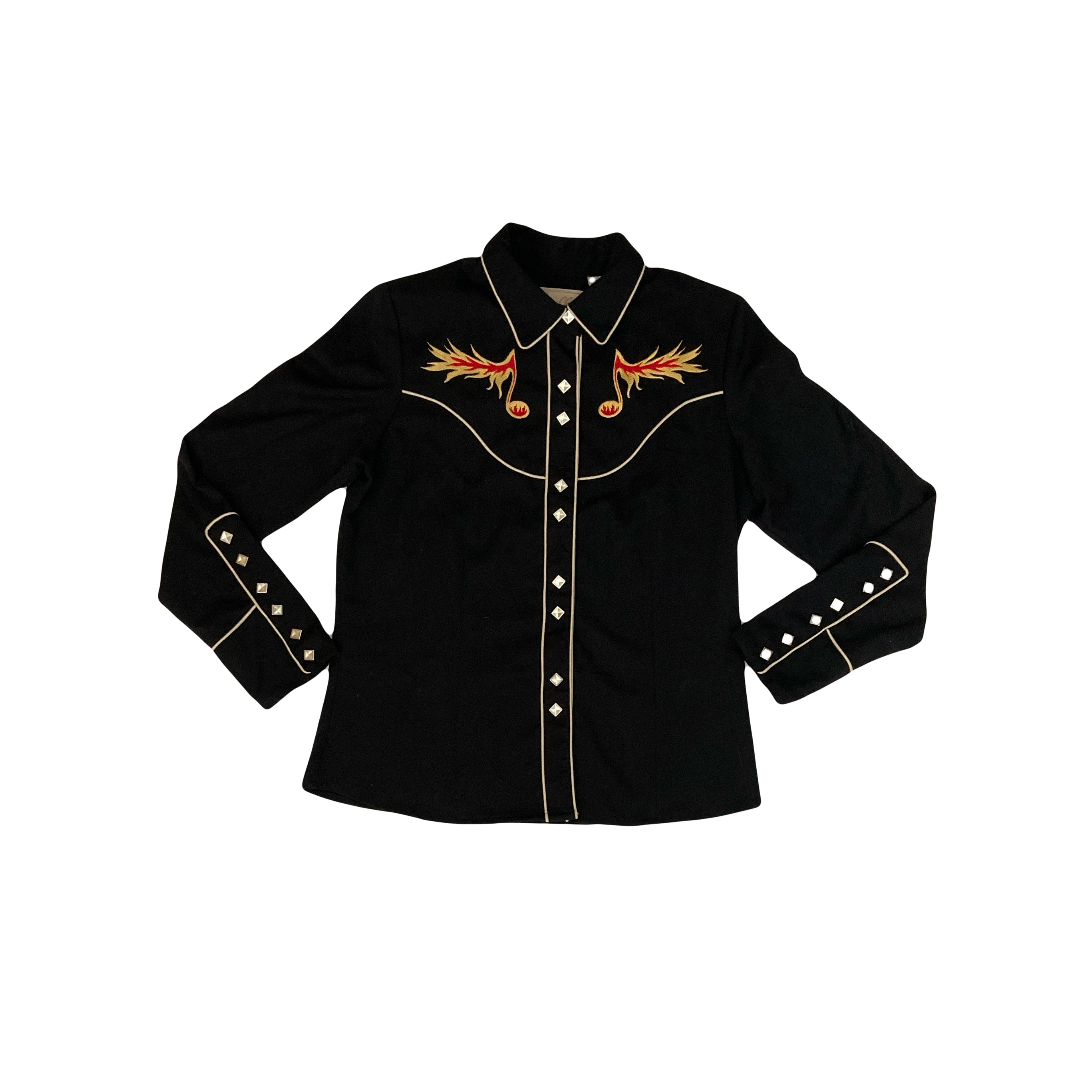 Vintage 90s black musical notes western cowgirl show shirt size small by iconic western outfitters Scully - gorgeous embroidered flaming notes on front and back, flawless piping detail and square popper buttons throughout.