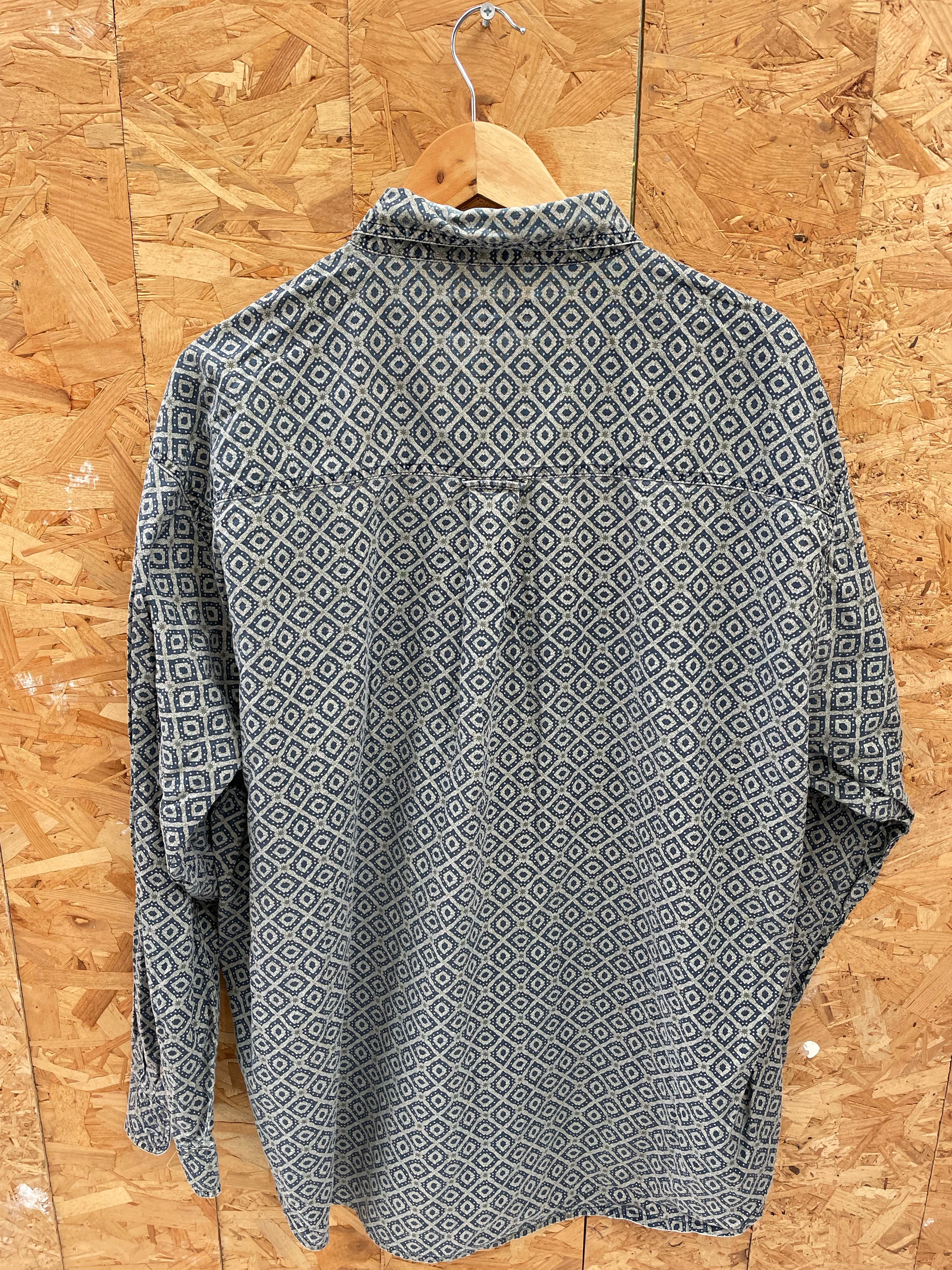 Vintage Sedgefield men's long sleeve button down shirt. Size XXL. Features a blue and gray geometric pattern. 100% cotton. Excellent condition. Color: Gray.