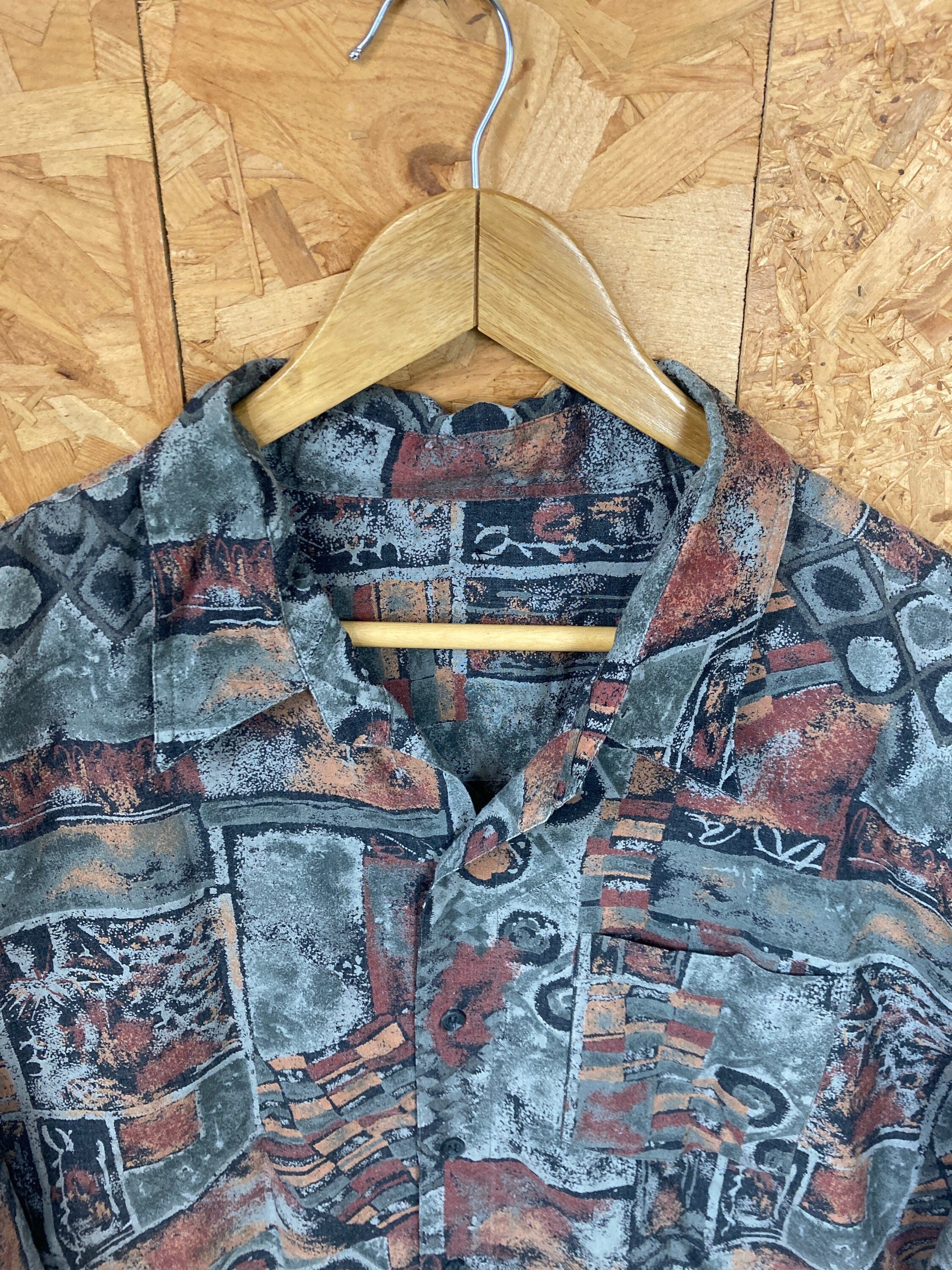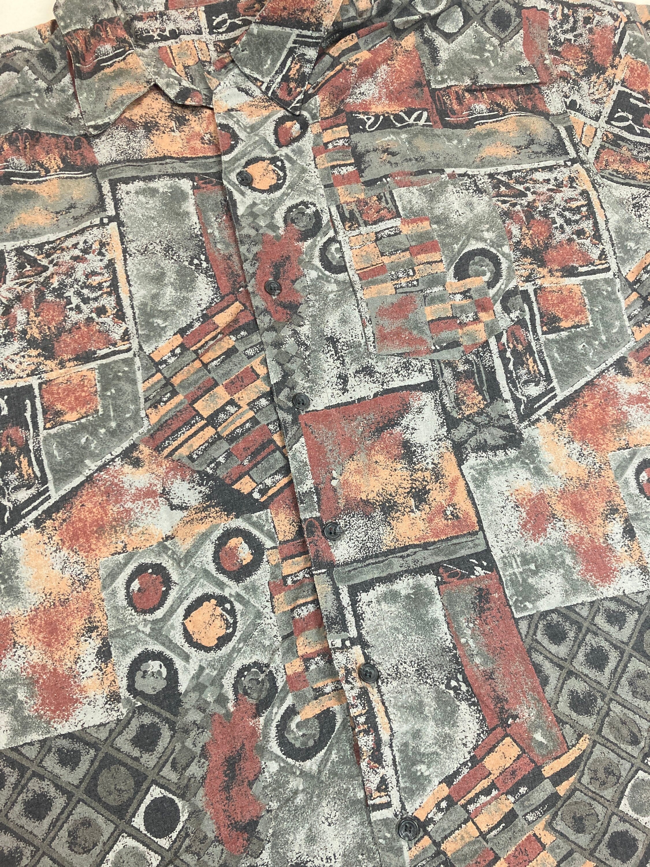 Vintage 90s brown grey grungy ugly pattern sketchbook print party summer mens short sleeve shirt size XL