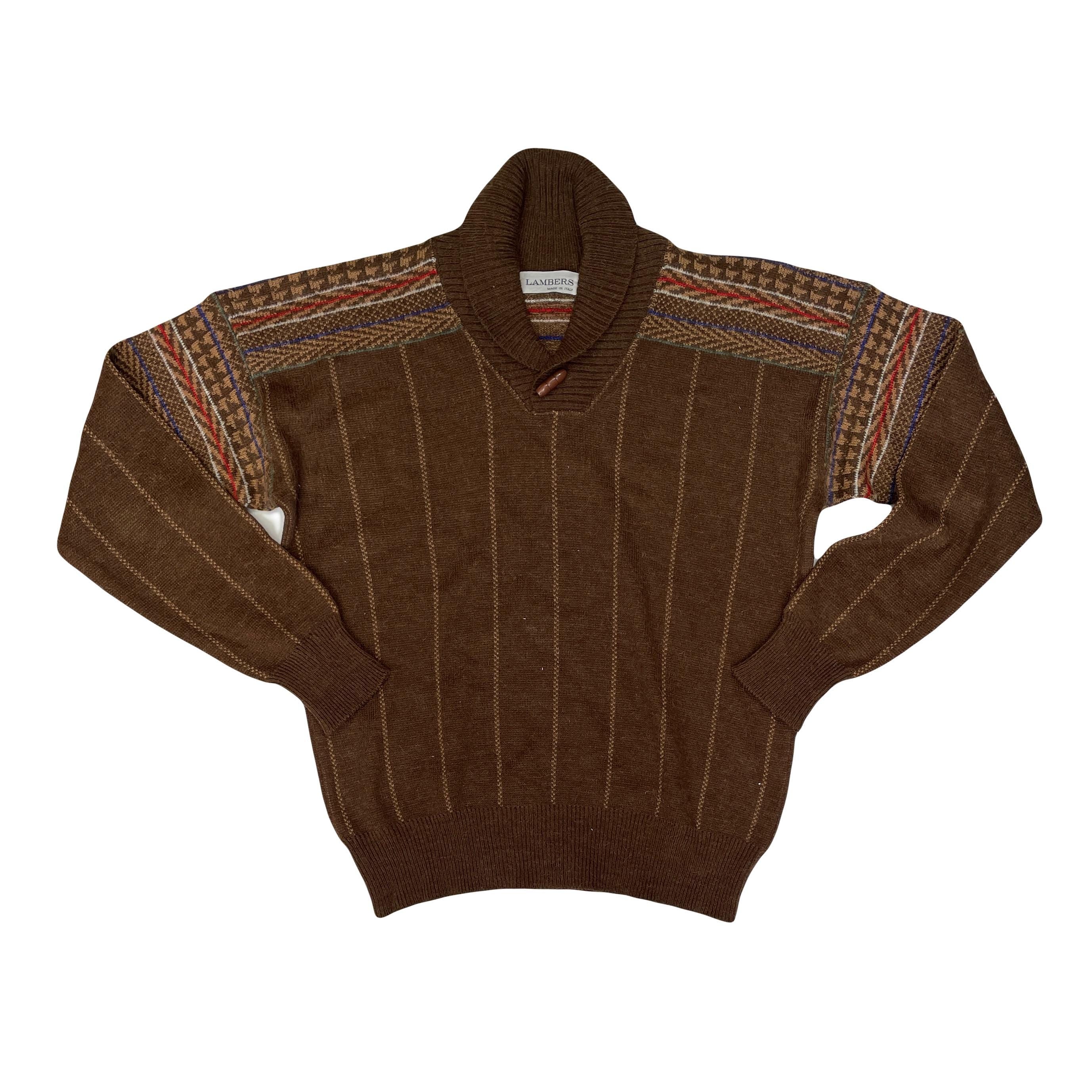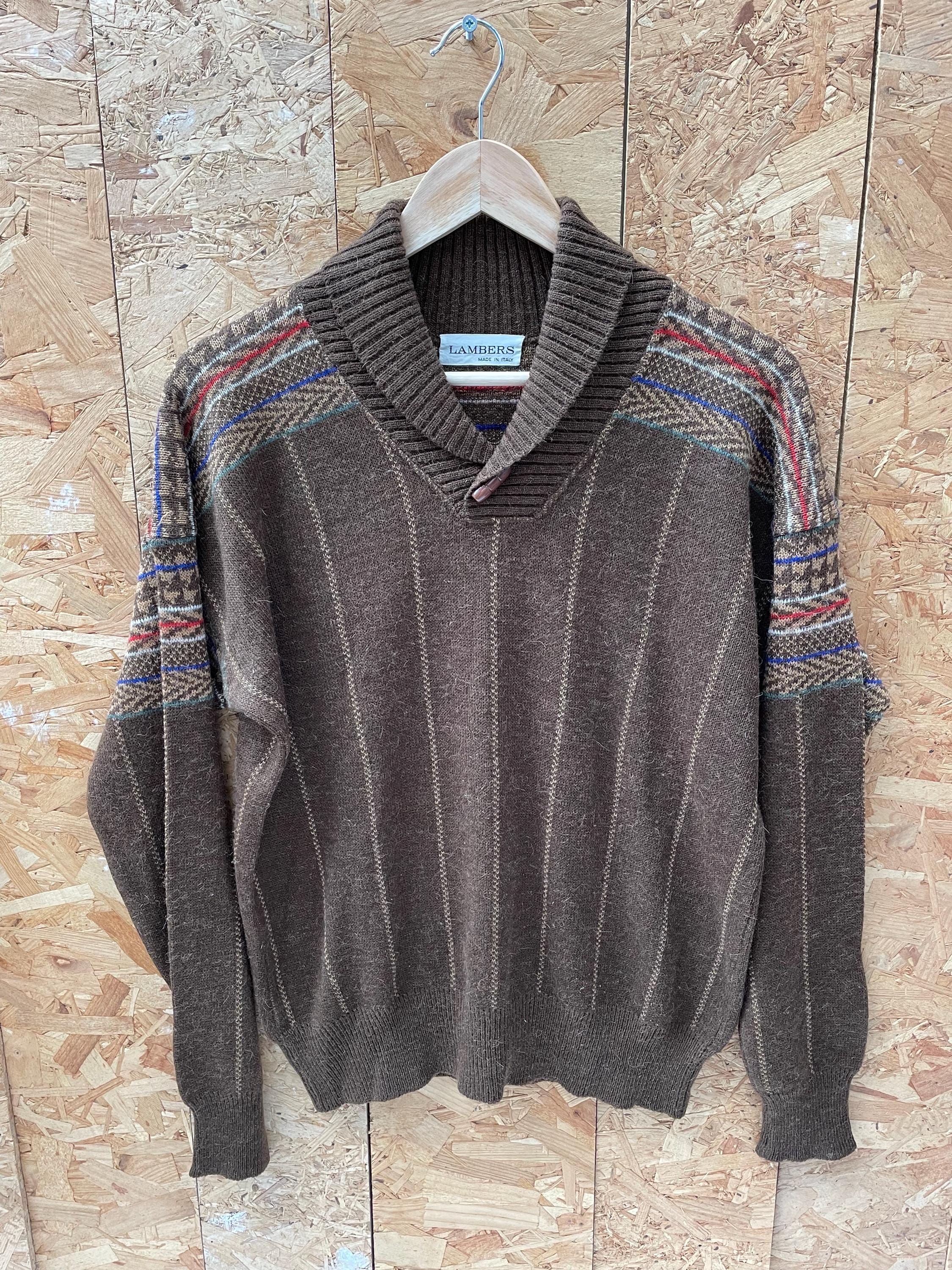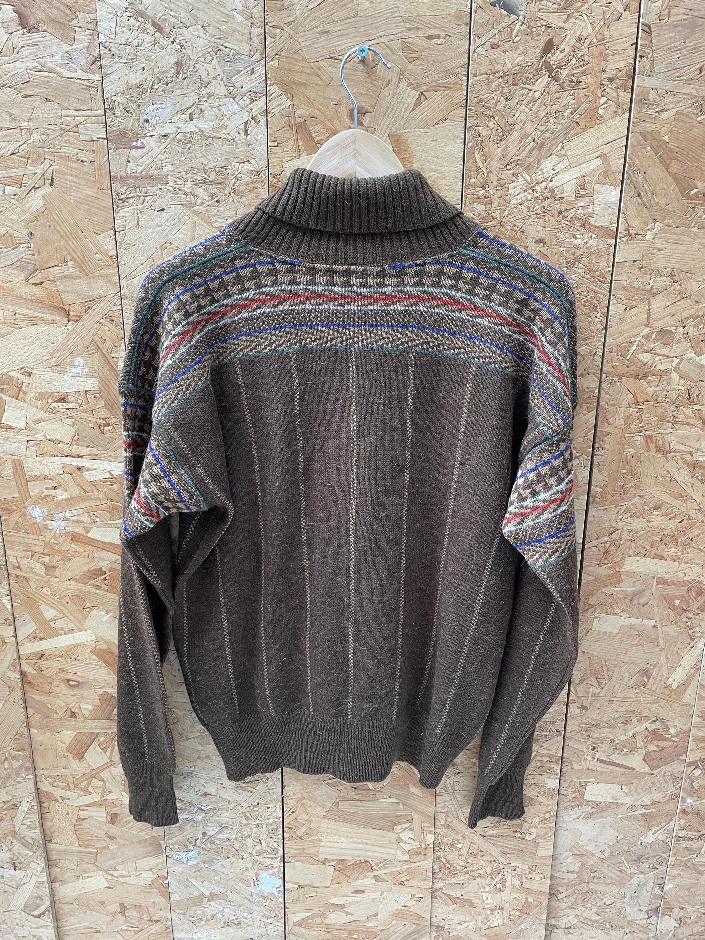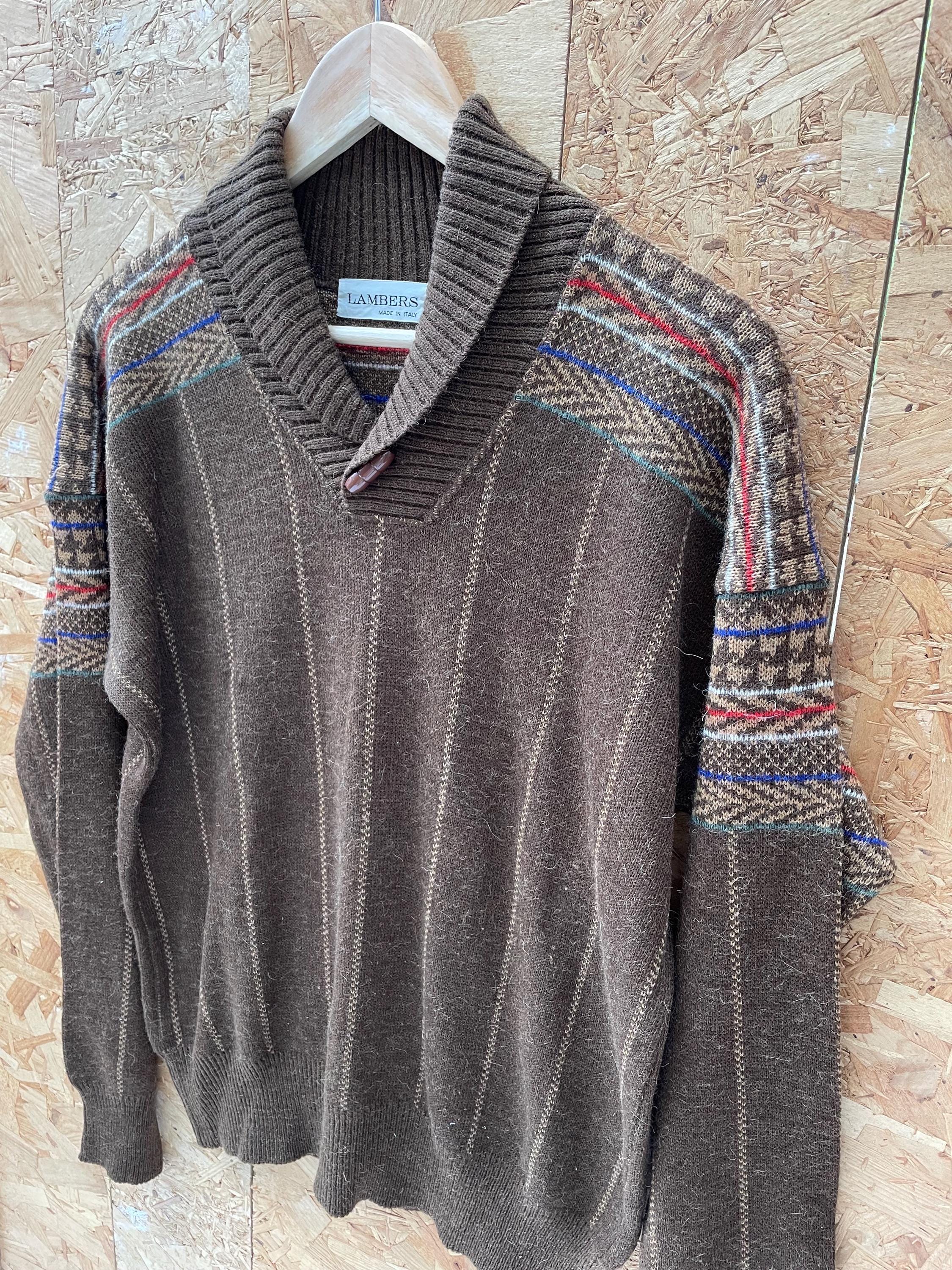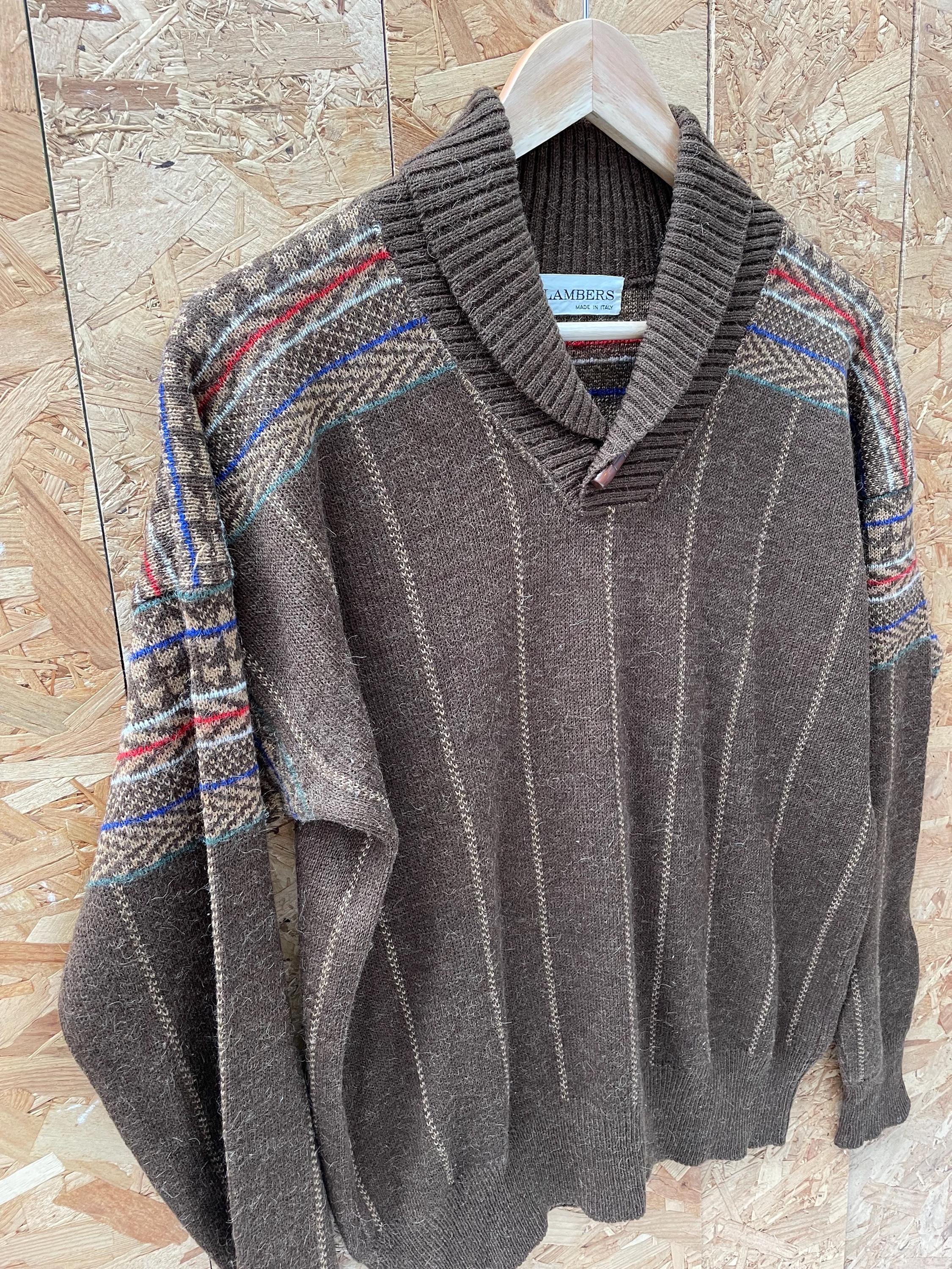 Vintage 90s brown striped grandad roll v-neck acrylic pattern slouchy jumper pullover size 50 medium