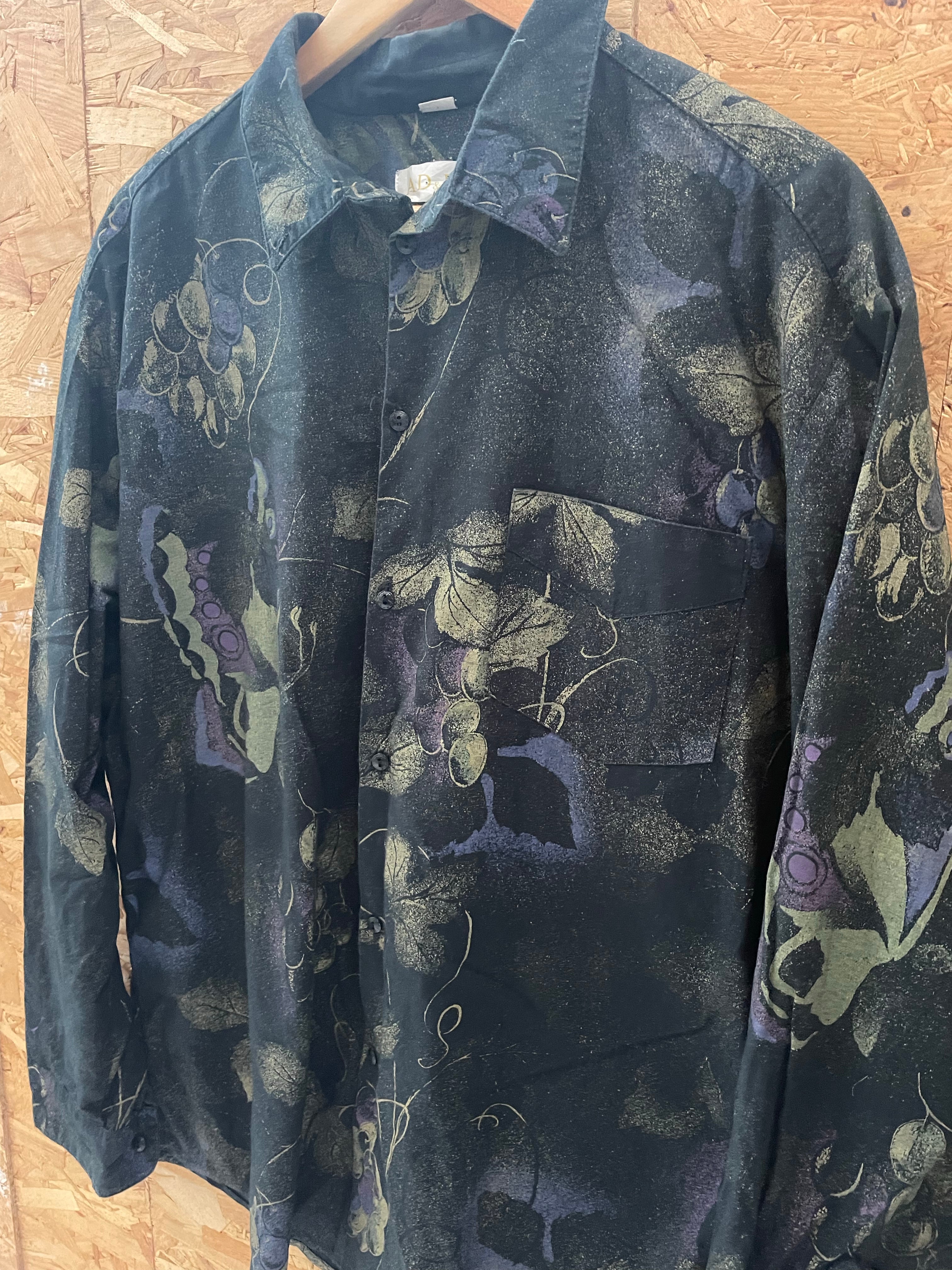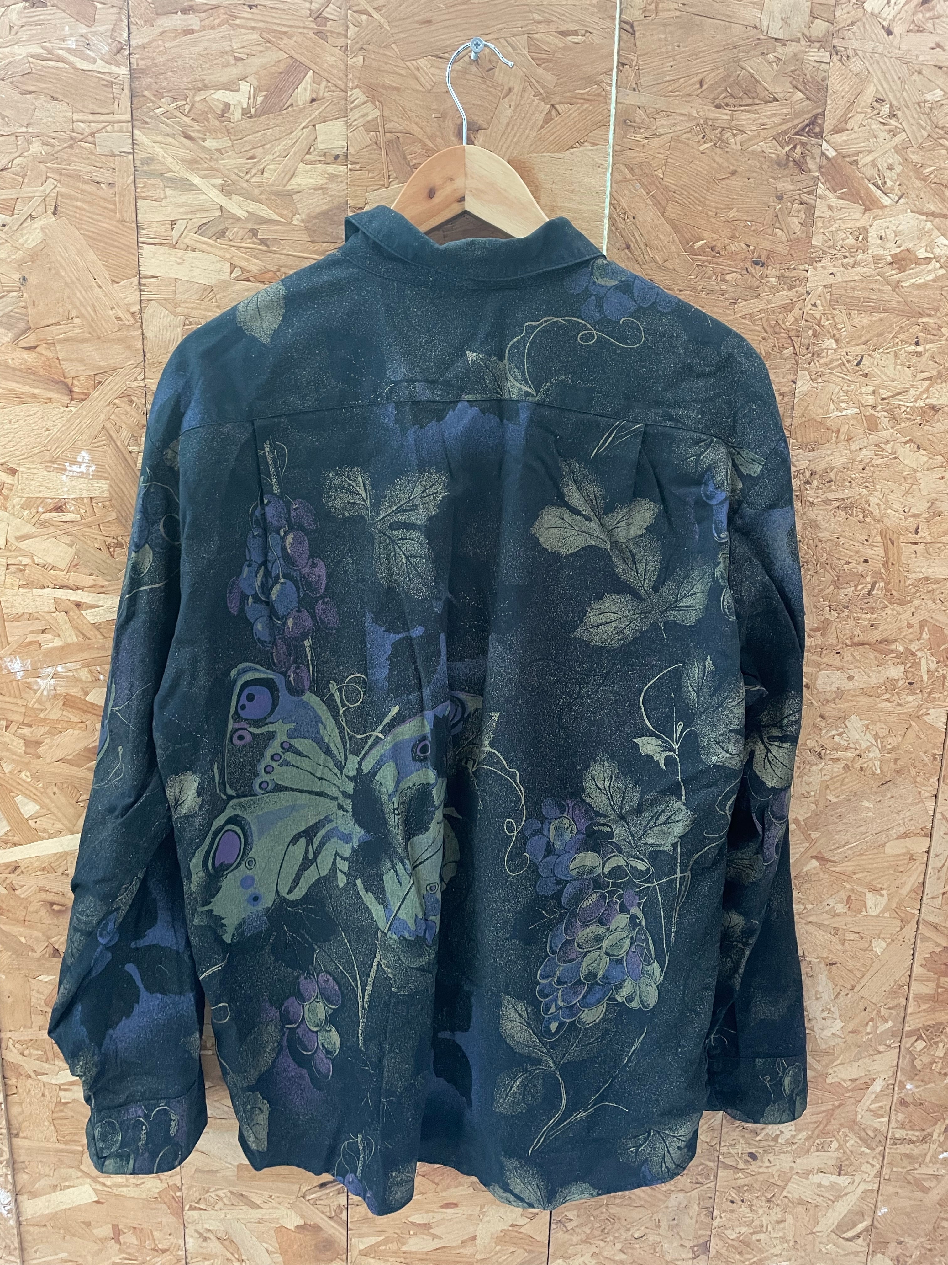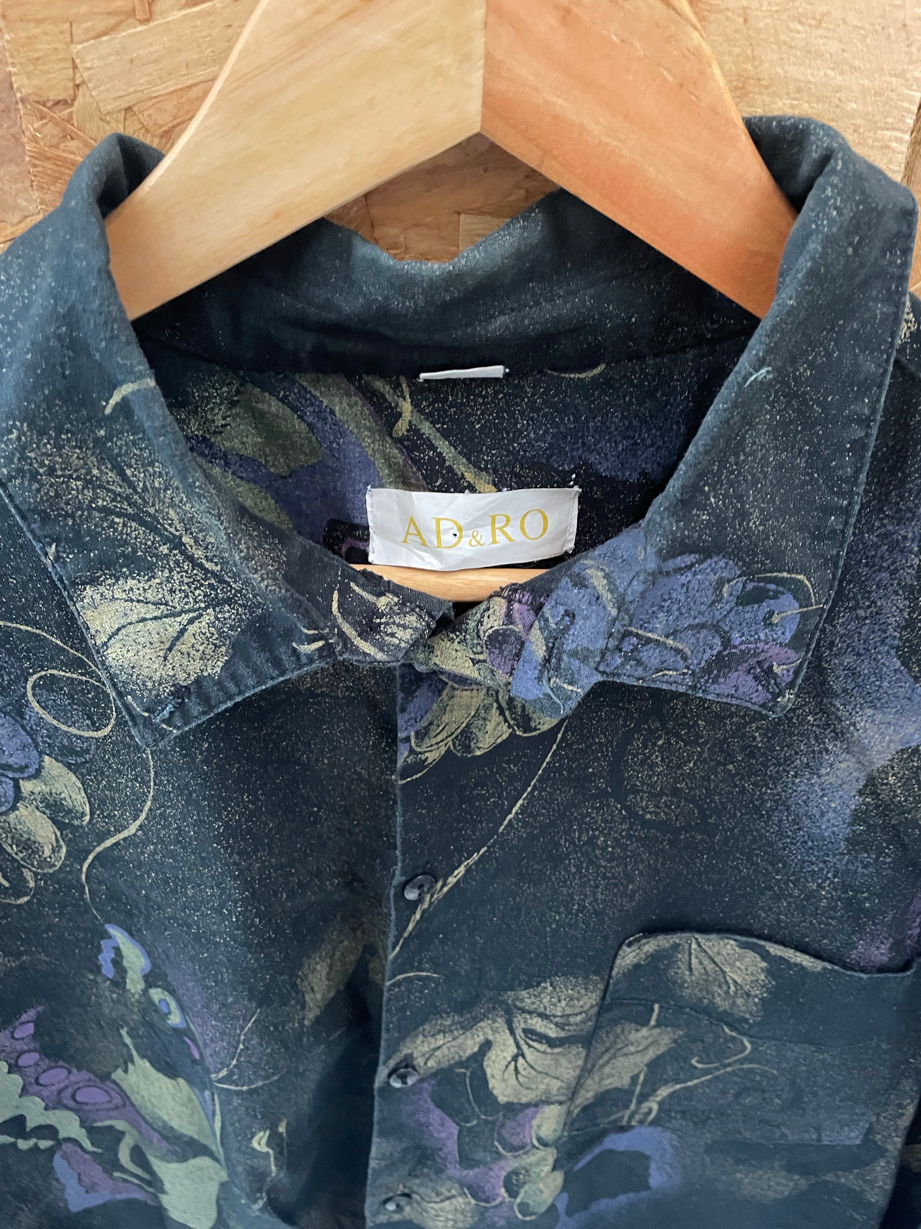 Vintage AD&RO button-up shirt featuring a unique black background with a striking butterfly and grape vine print. This long-sleeved shirt has a classic collar and button front. Perfect for adding a touch of retro flair to any outfit. Color: Black/Multi.