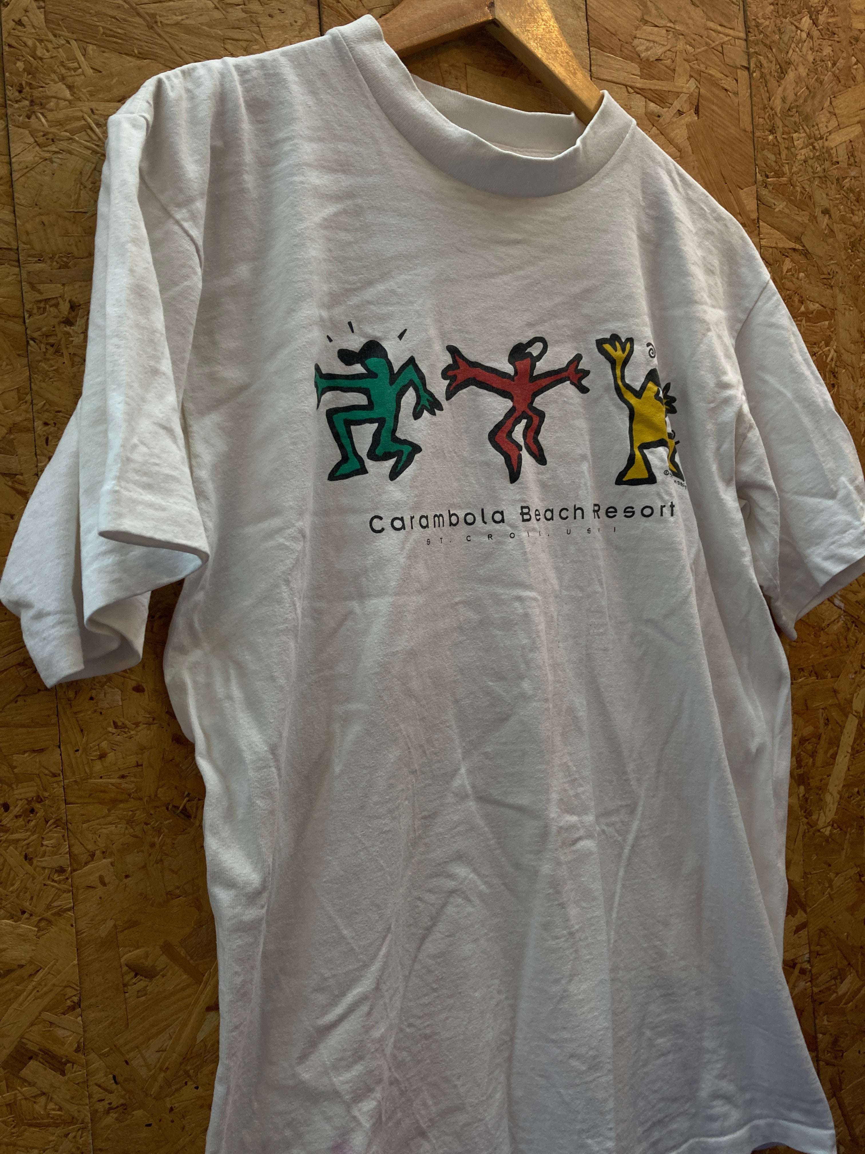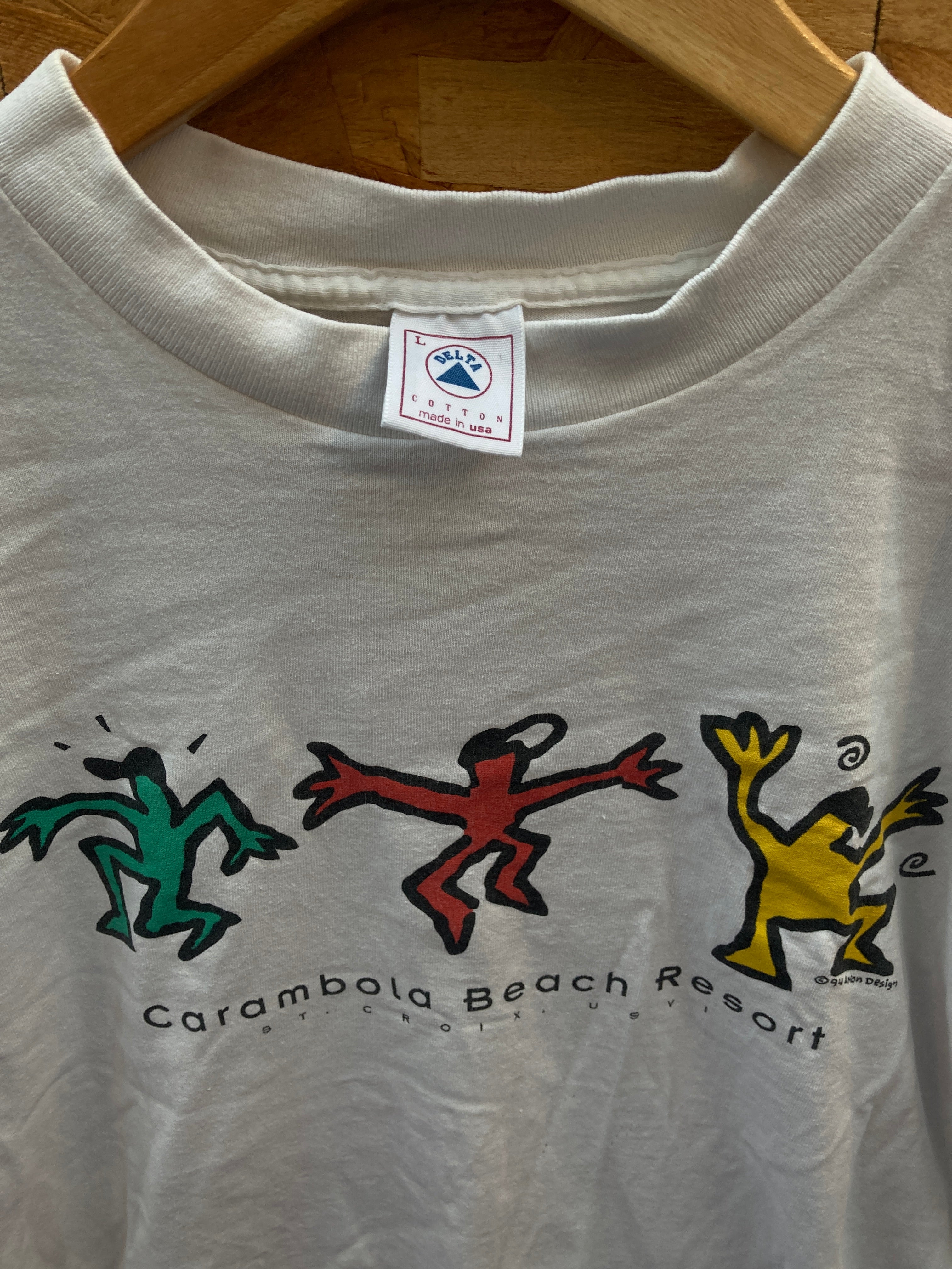 Vintage 90s Carambola beach stick man single stitch t-shirt size large grade B on Delta T-Shirt - minor colour runs on the hem unfortunately