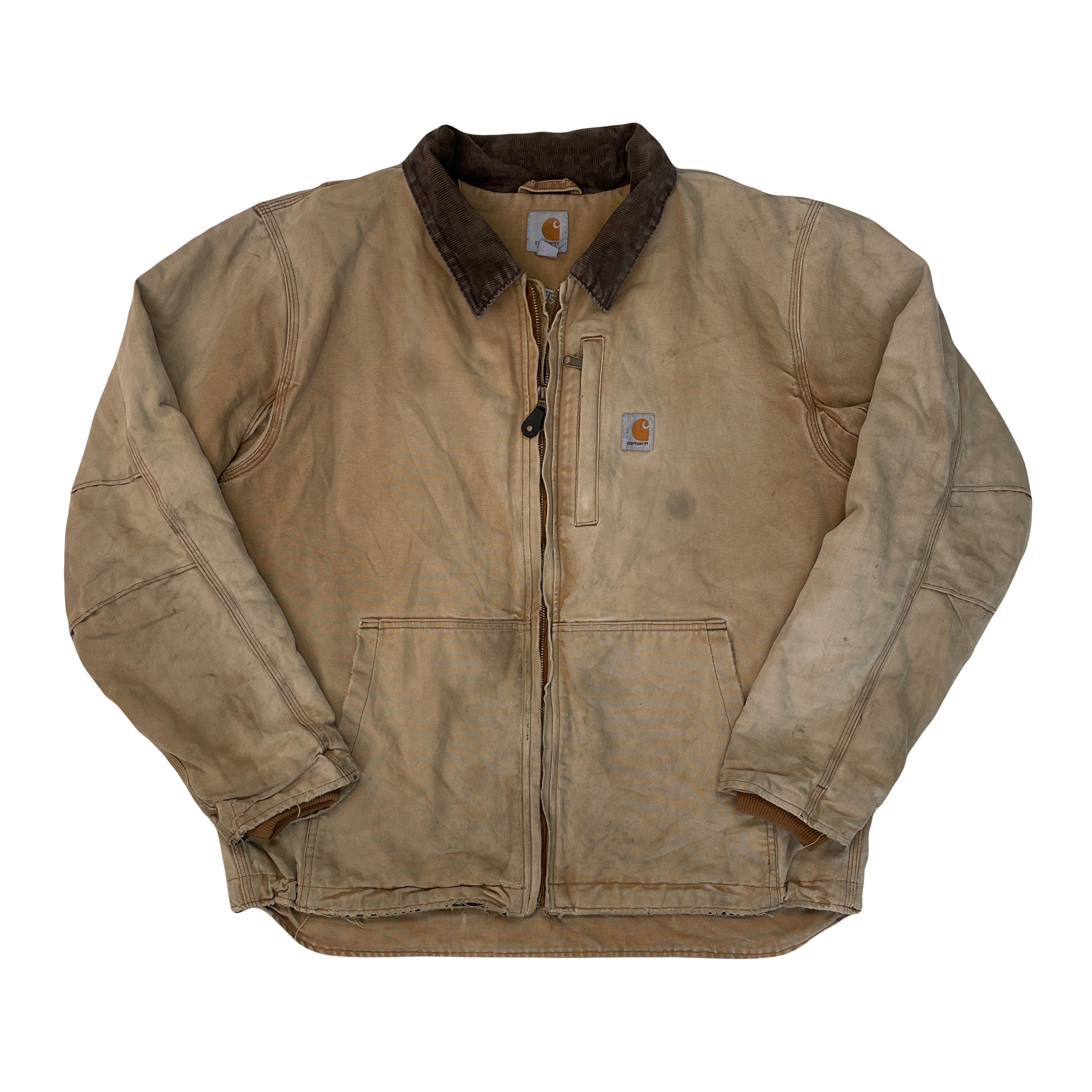 True Vintage Carhartt Full Swing jacket in tan. Size L. Shows significant wear and tear you can't fake without years of hard work, see photos for details. Heavyweight duck canvas. Brown corduroy collar.