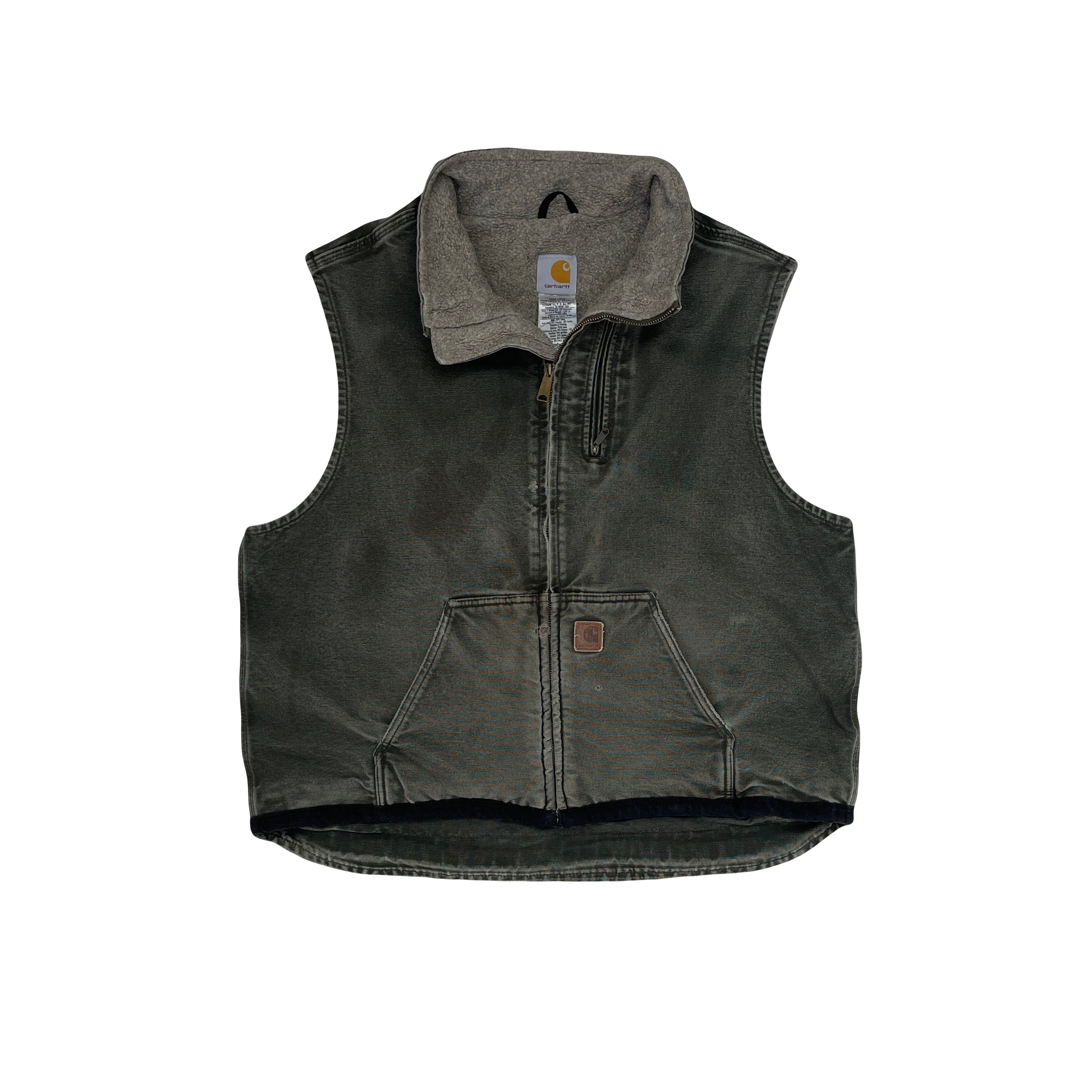 Carhartt Men's Size 2XL insulated vest. Dark olive green canvas exterior with a grey fleece lining. Full zip front closure. Good used condition. Some minor wear and fading for true vintage look. Color: Dark Olive Green.