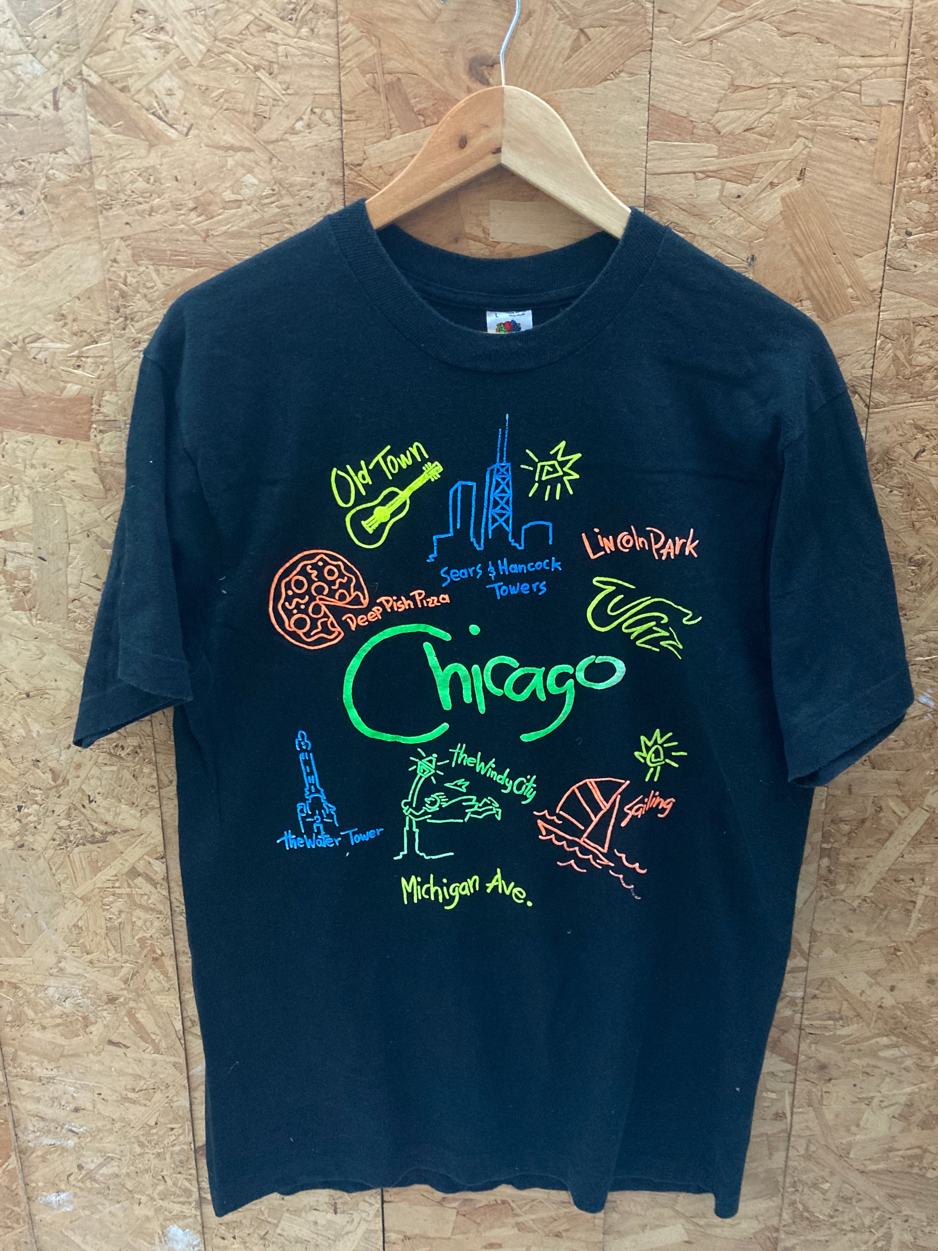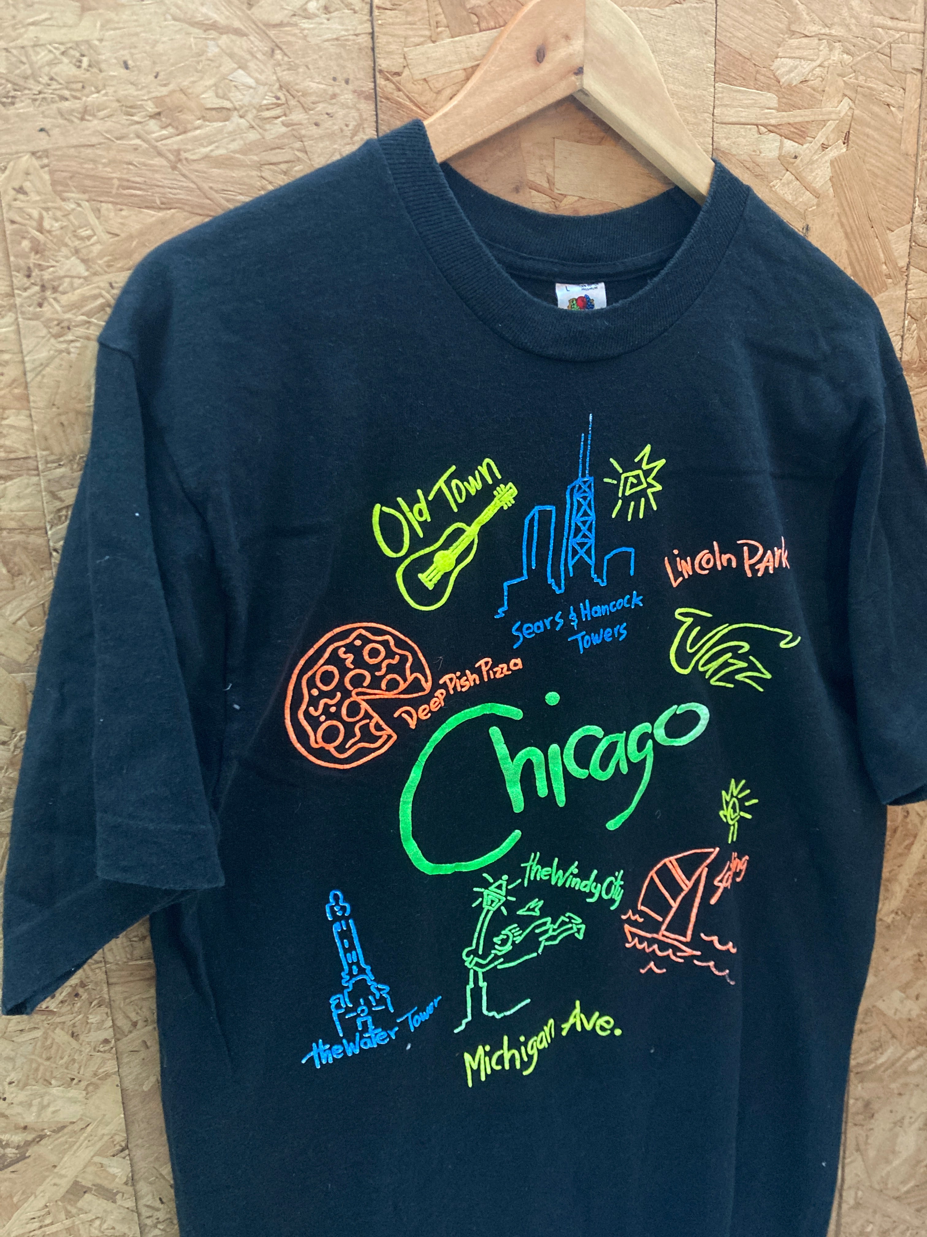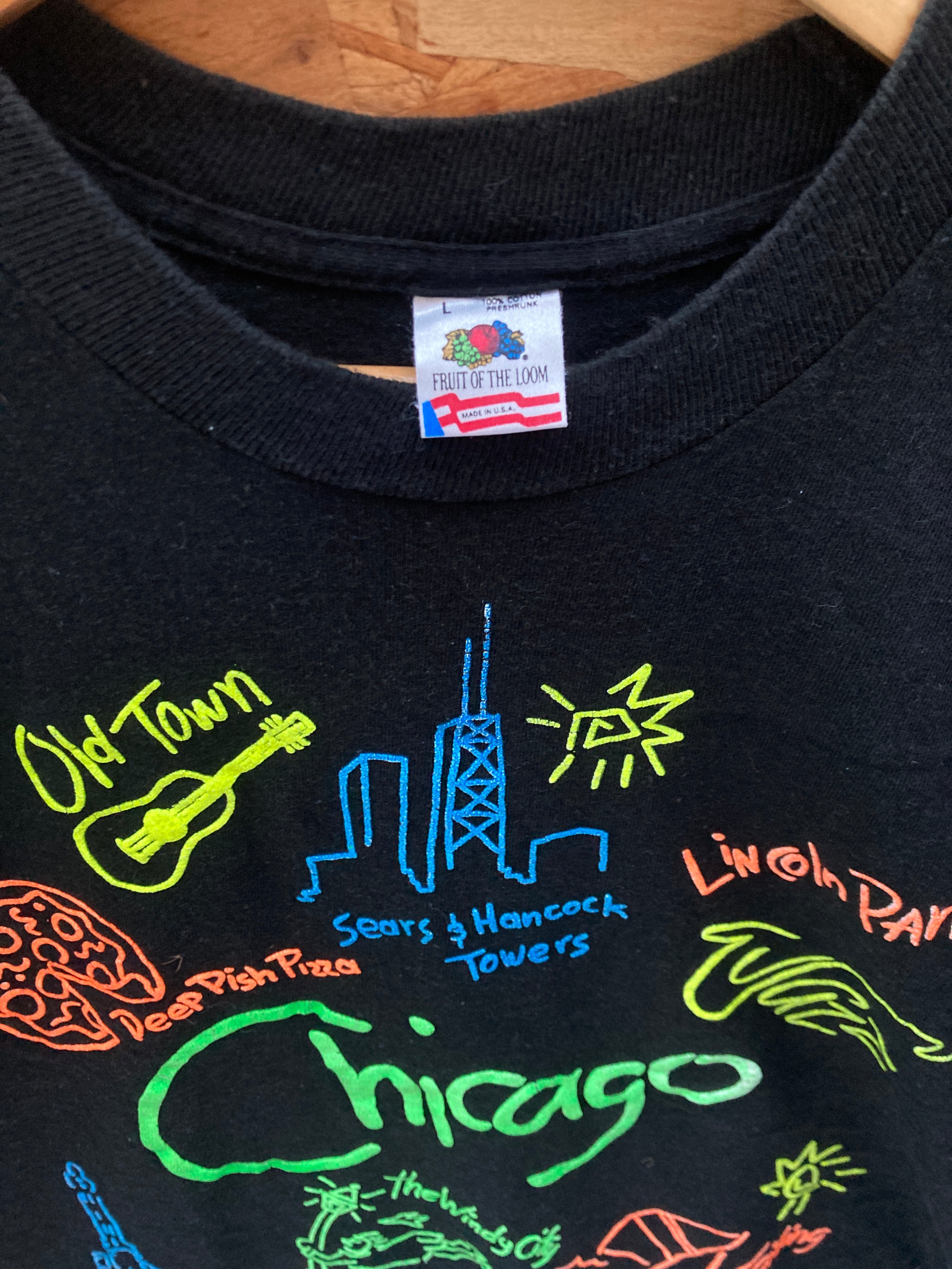Vintage 90s Chicago sights souvenir black neon single stitch t-shirt size large by Fruit of the loom