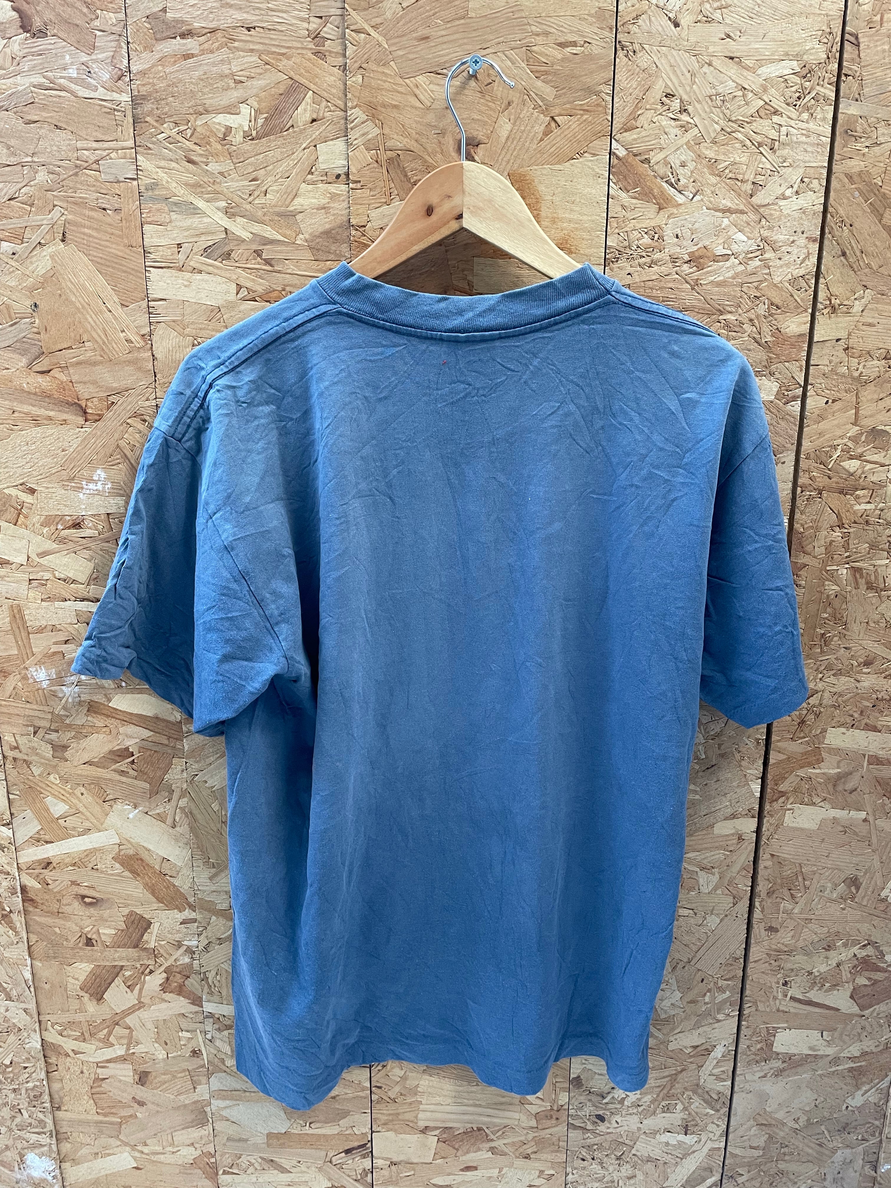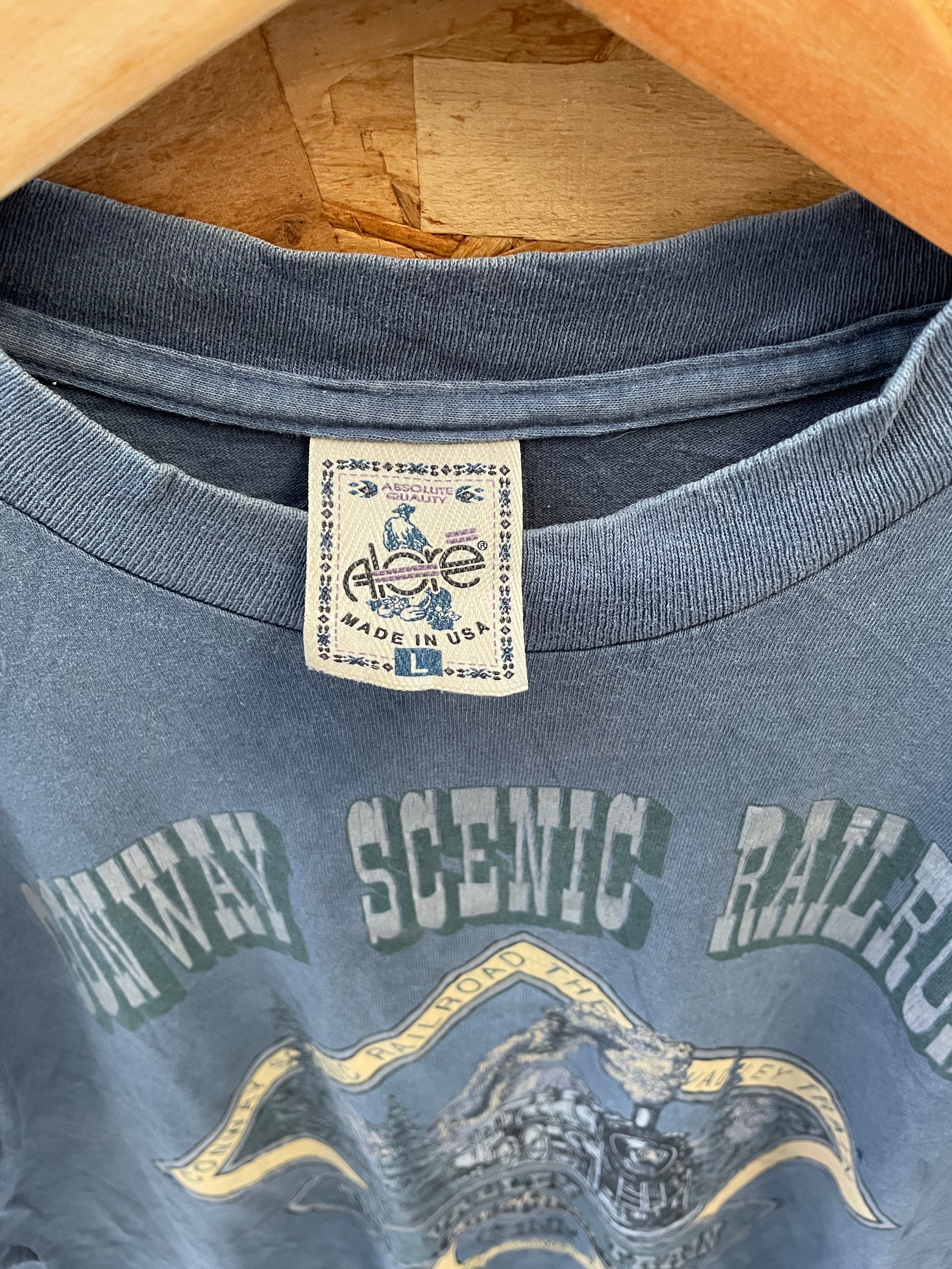 Vintage Conway Scenic Railroad graphic tee. Features a detailed train design. Made in the USA. patchy tie dye effect all over. tiny pinhole near motif. Size Large. Color: Blue.