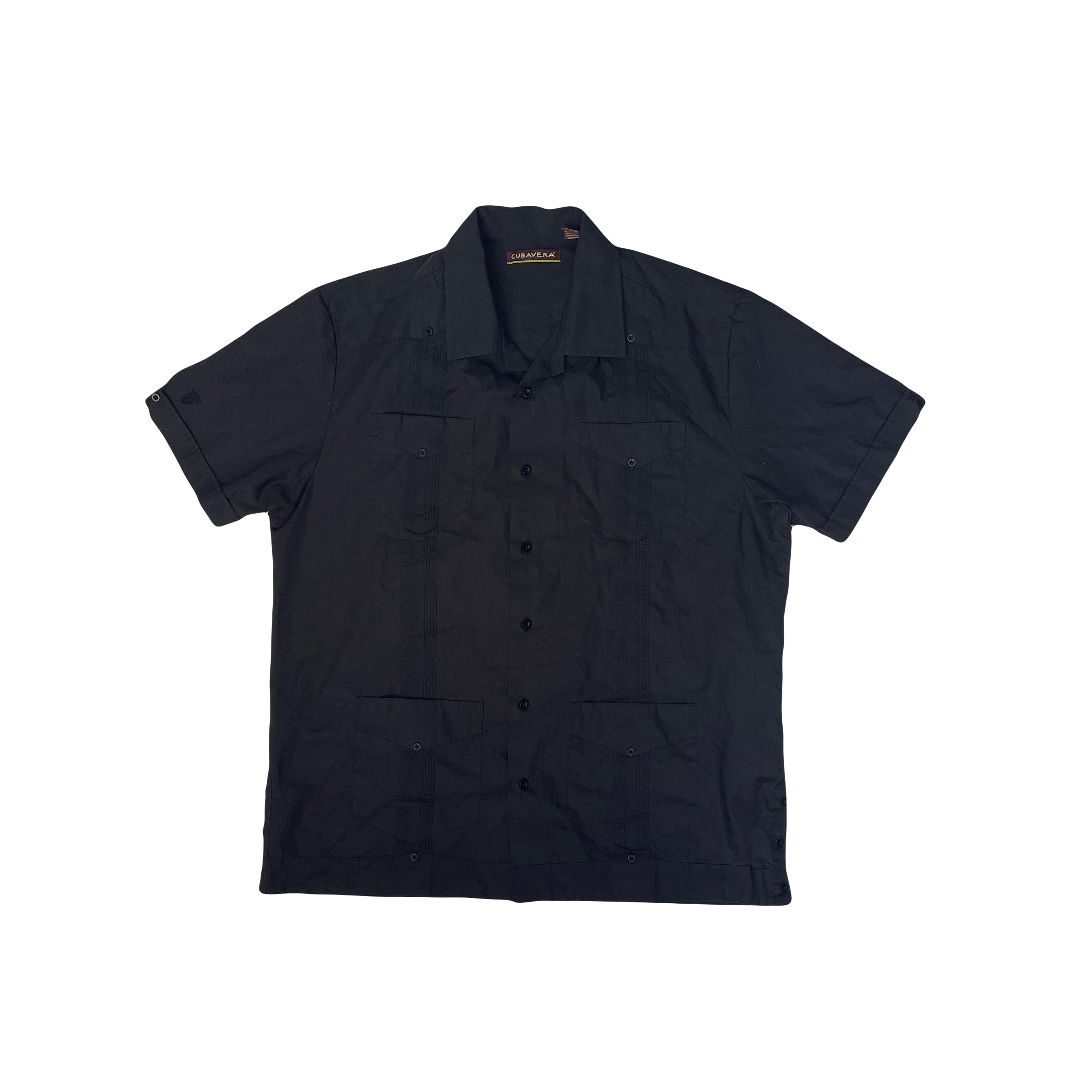 Cubayera men's size Large black guayabera. Short sleeve button-down with embroidered details and chest pockets. Excellent condition. Color: Black.