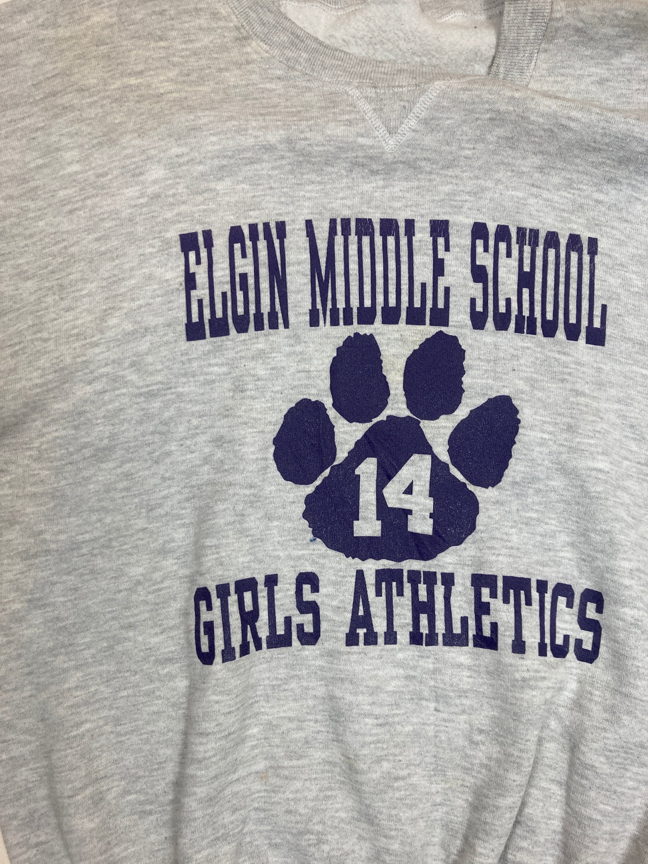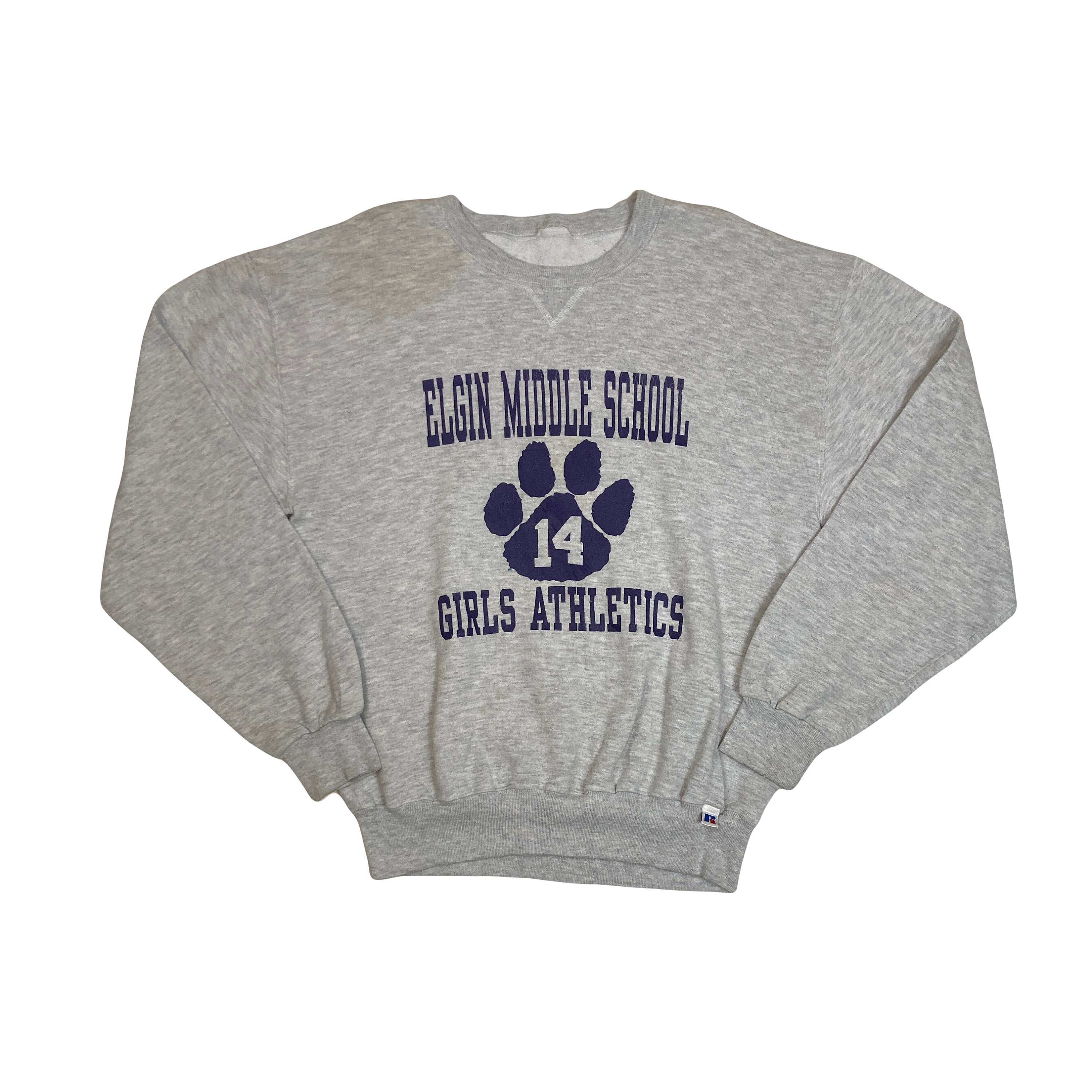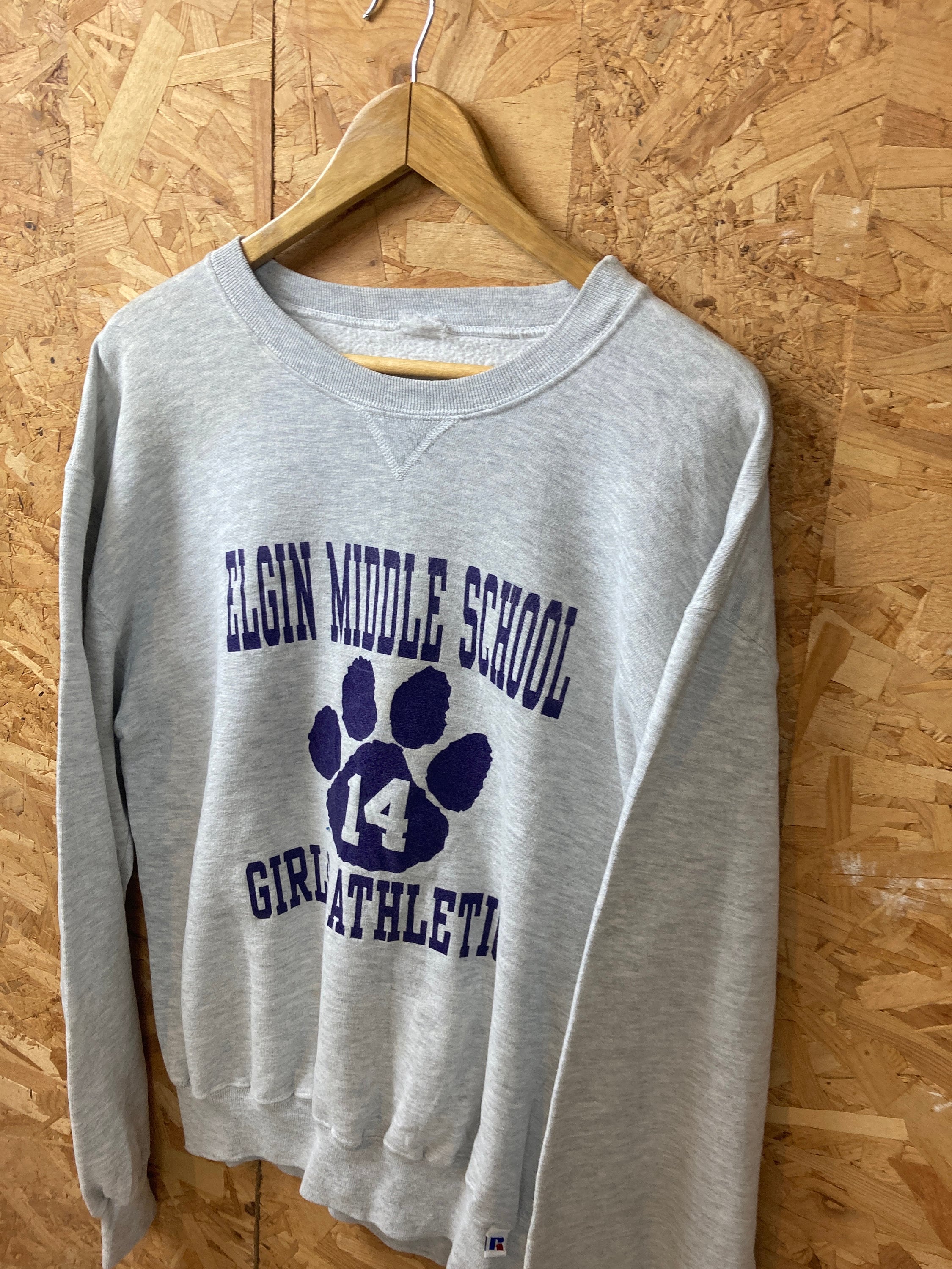 Vintage 90s Elgin Middle School Girls Athletics grey purple crew neck sweater size medium by Russel Athletic
