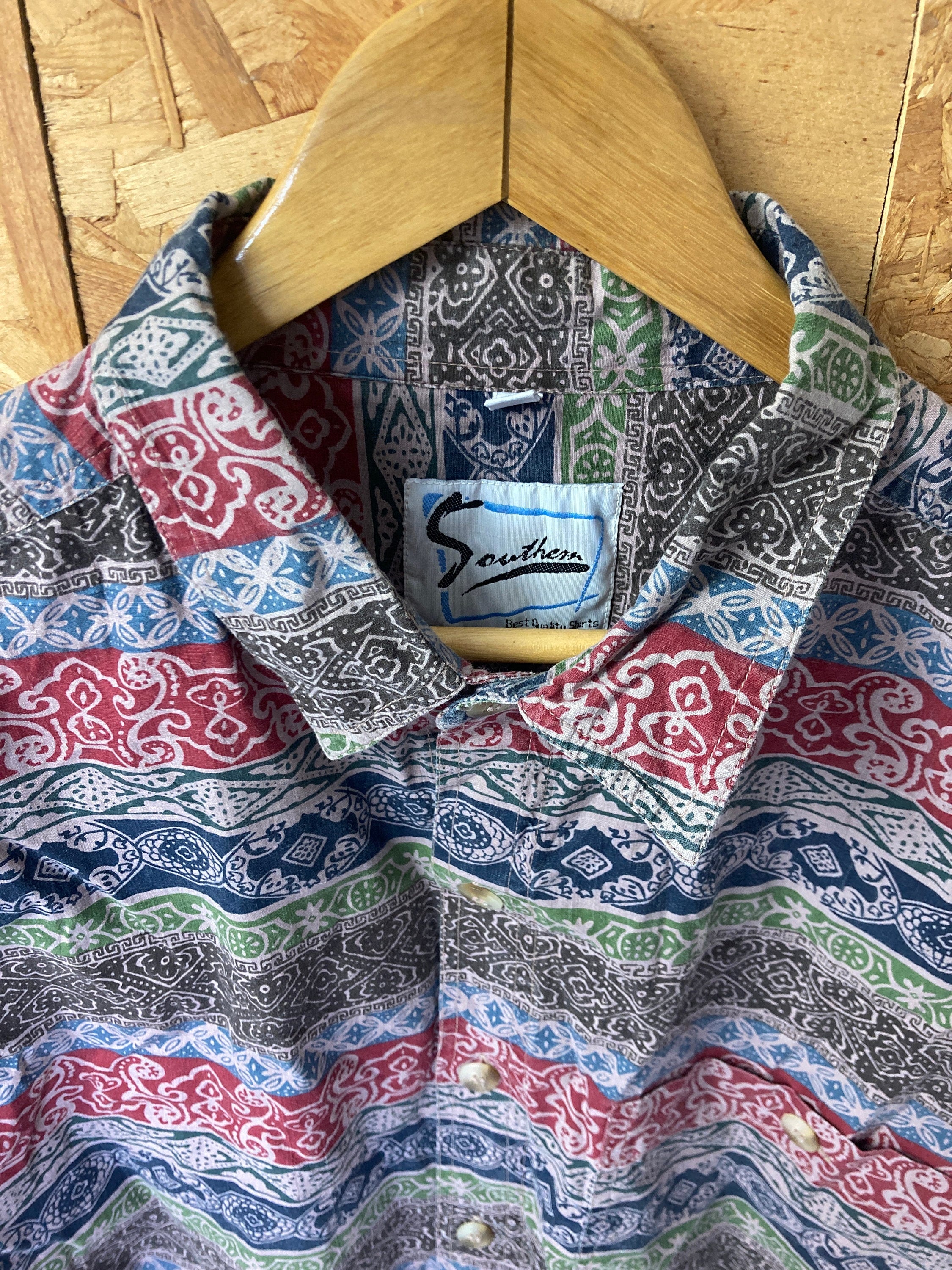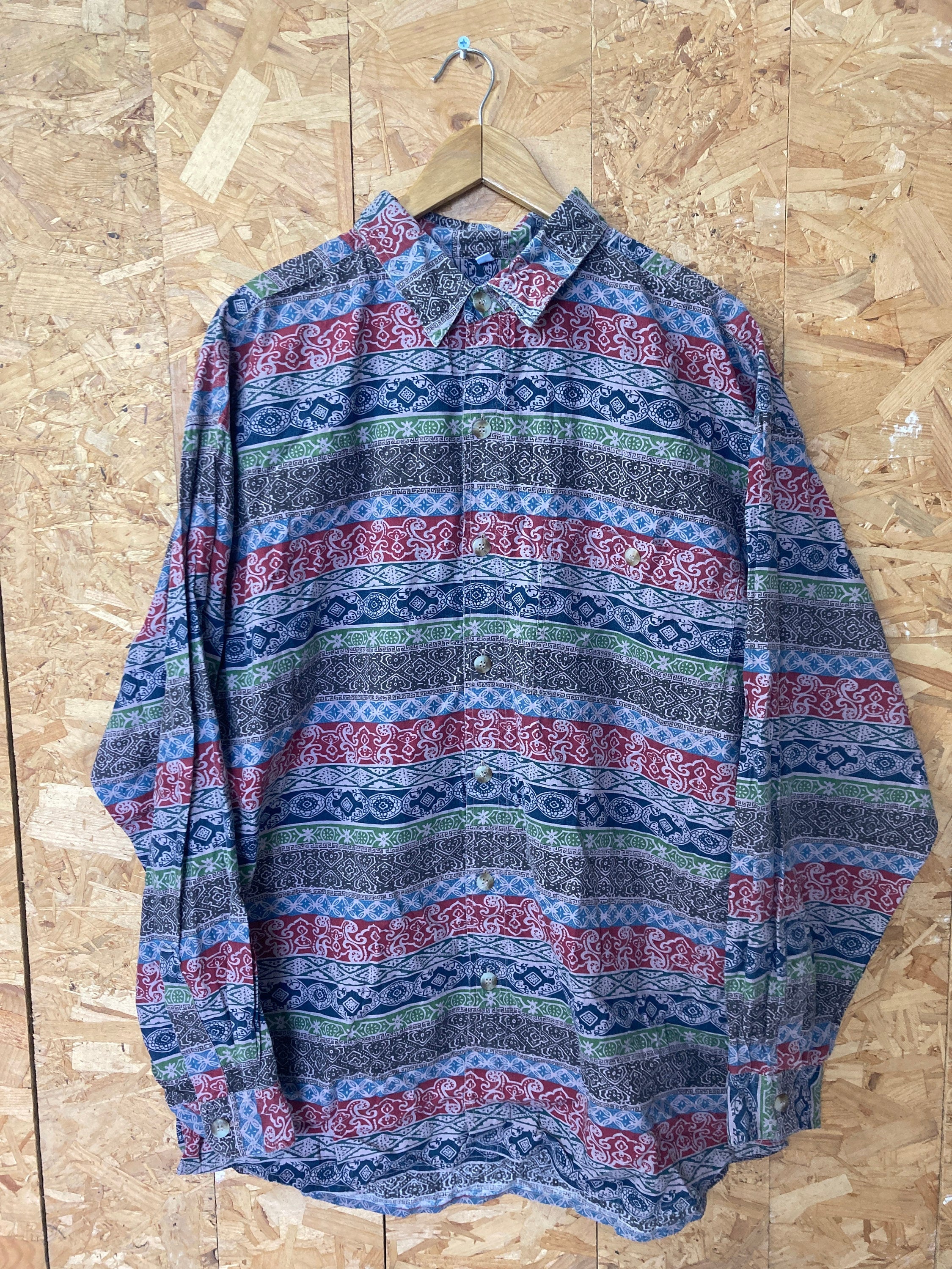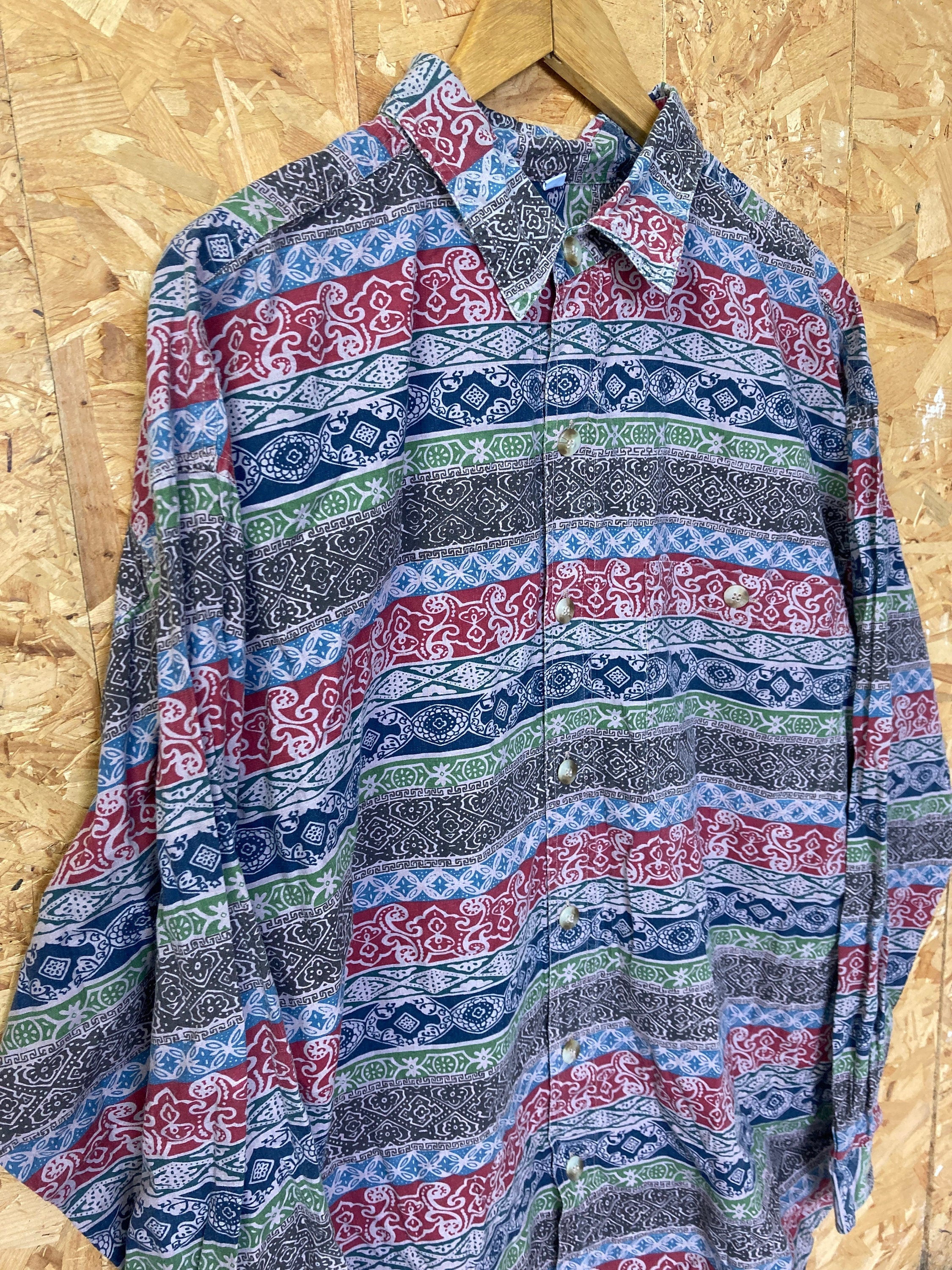 Vintage 90s ethnic tribal batik wax print style pattern grungy grey red brown long sleeve ugly eccentric shirt size X-large by Southern