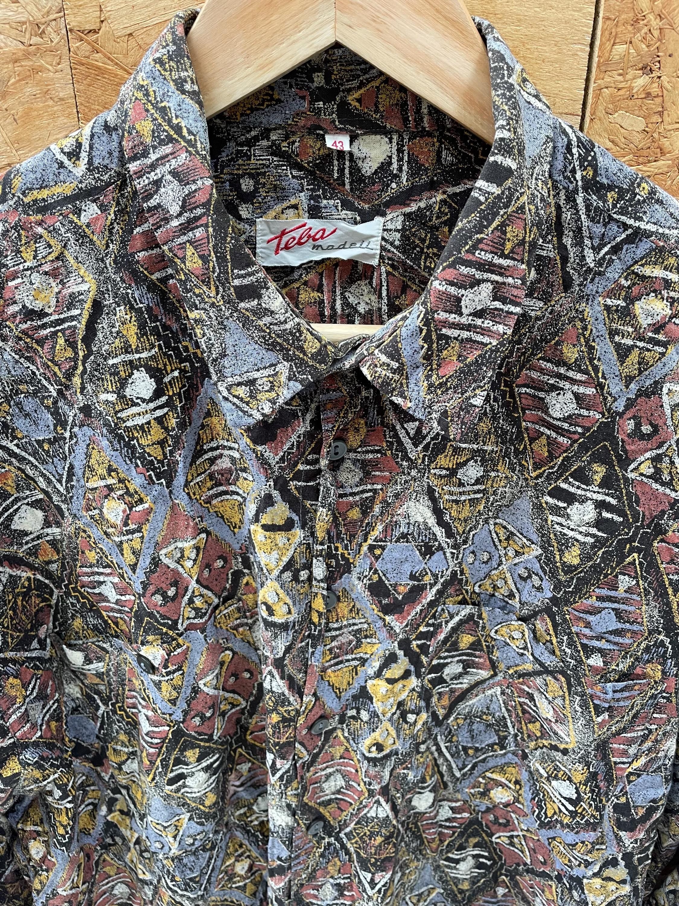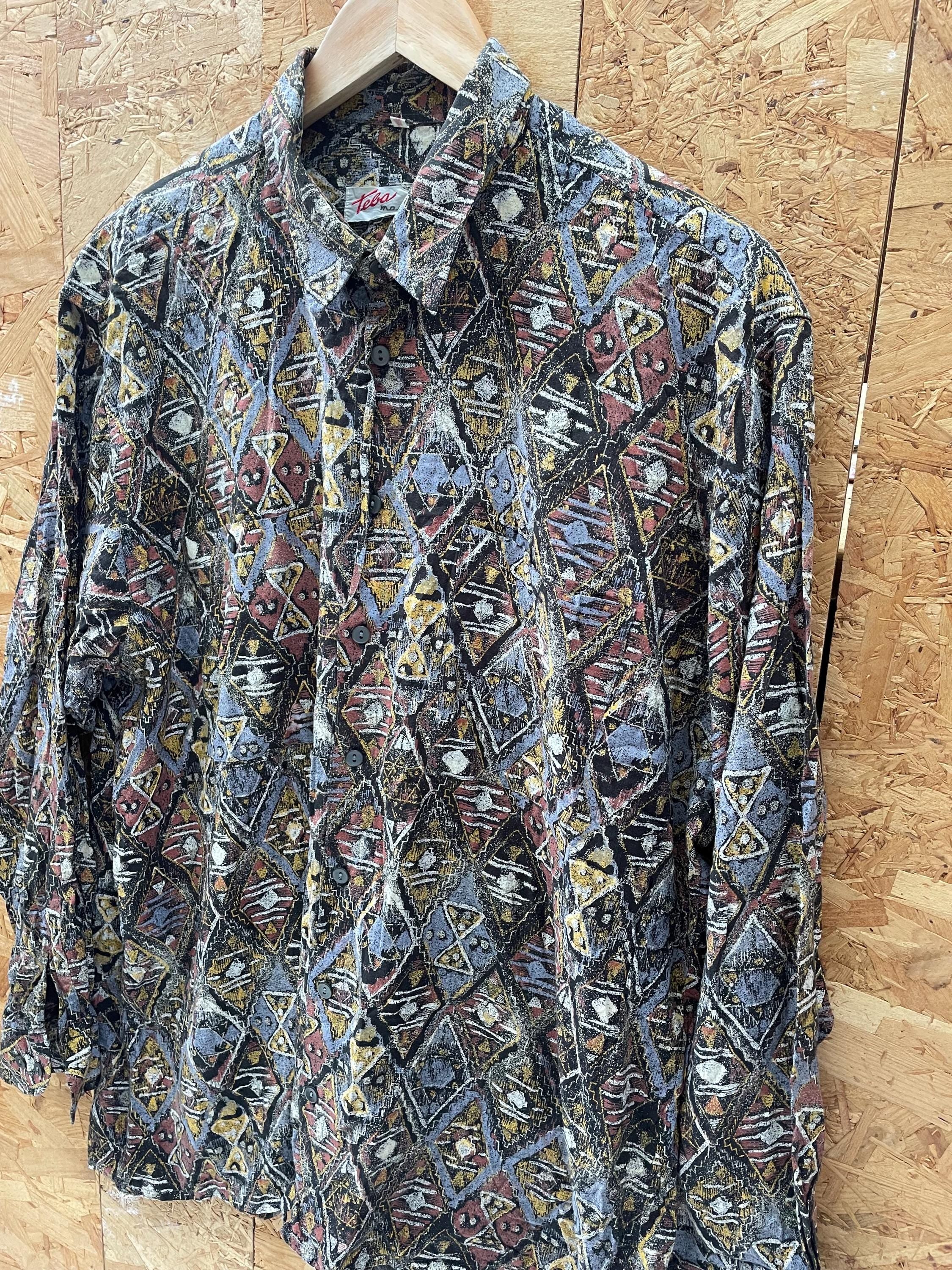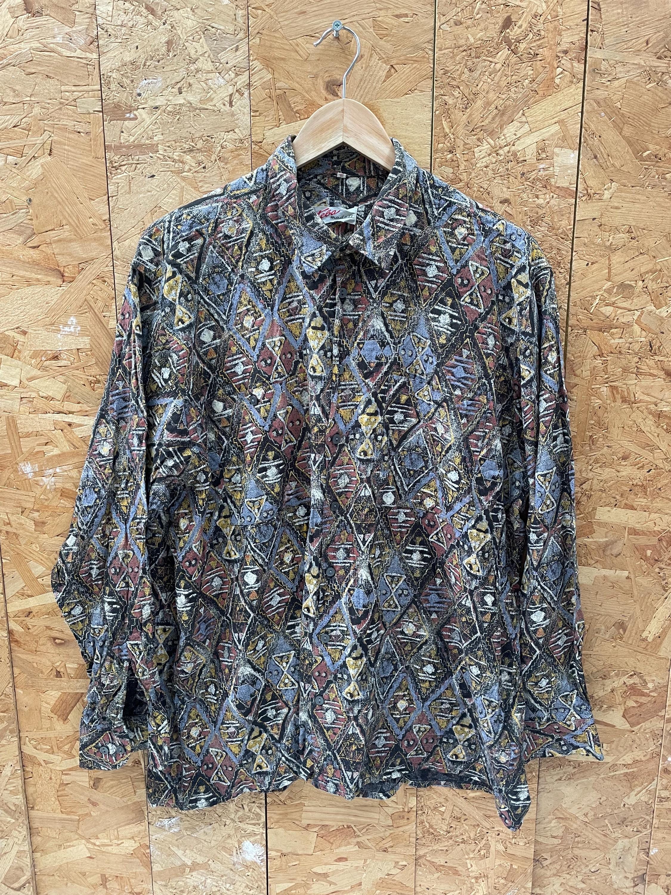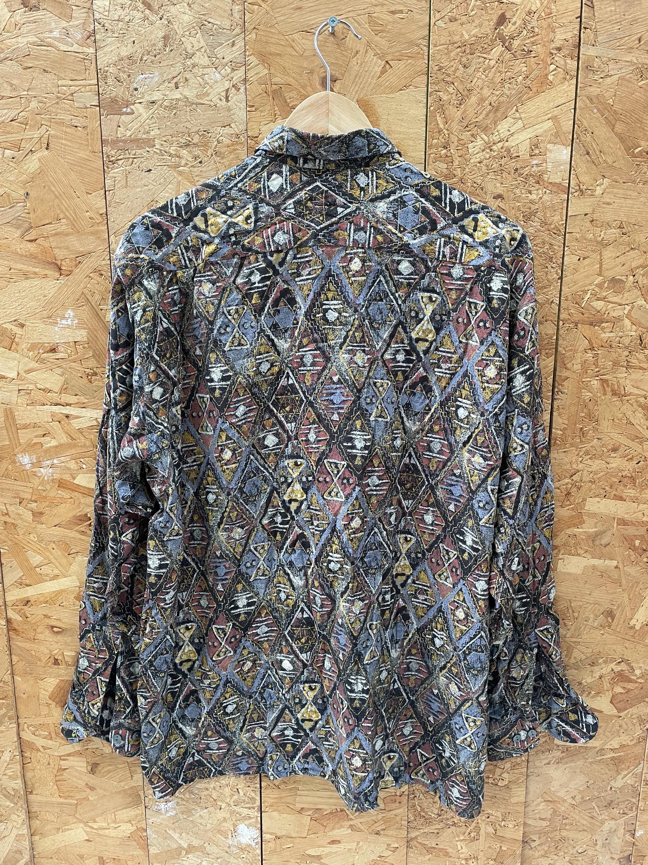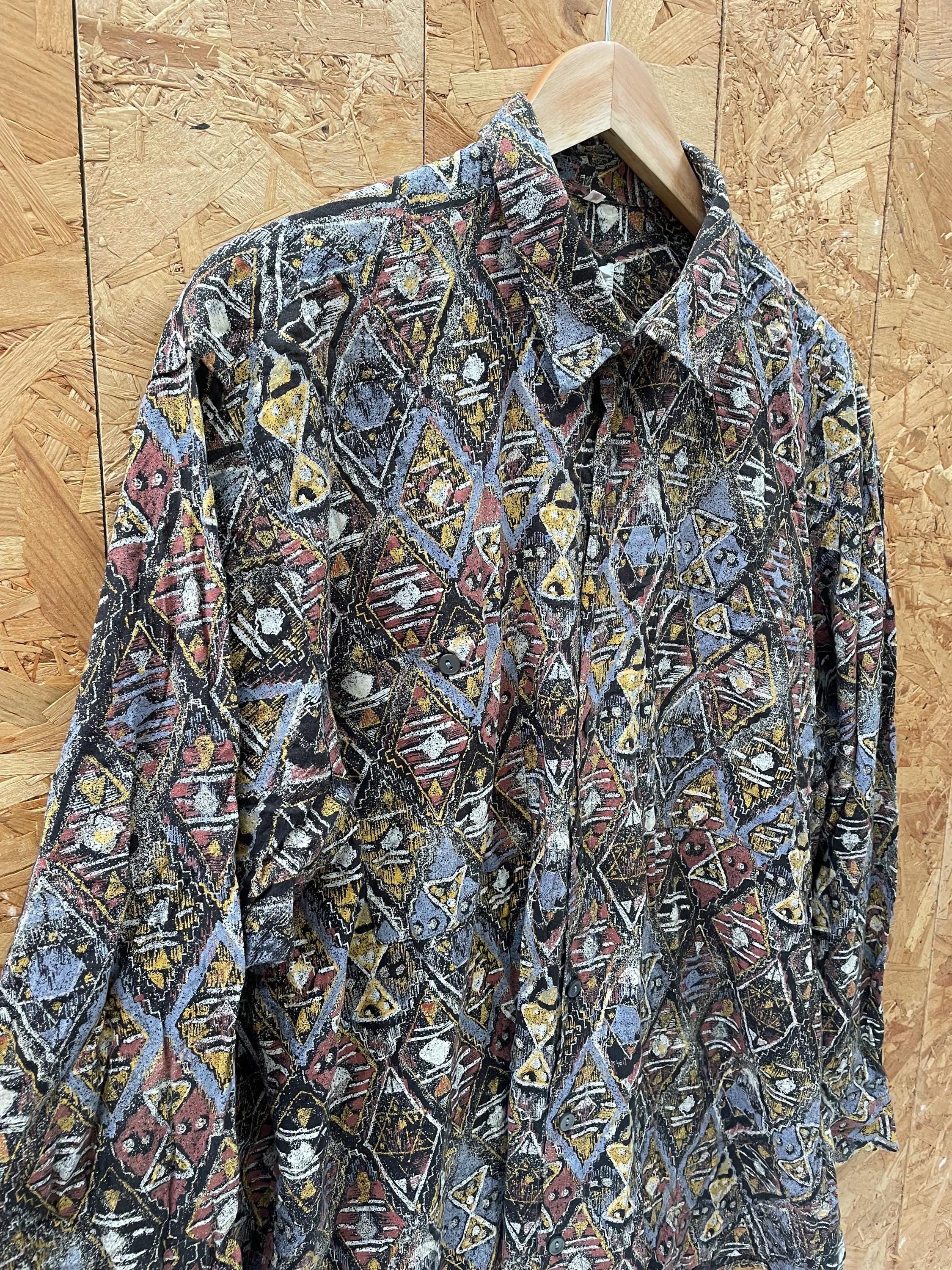 Vintage 90s grey brown yellow abstract Aztec pattern long sleeve viscose shirt size large by Tela Model