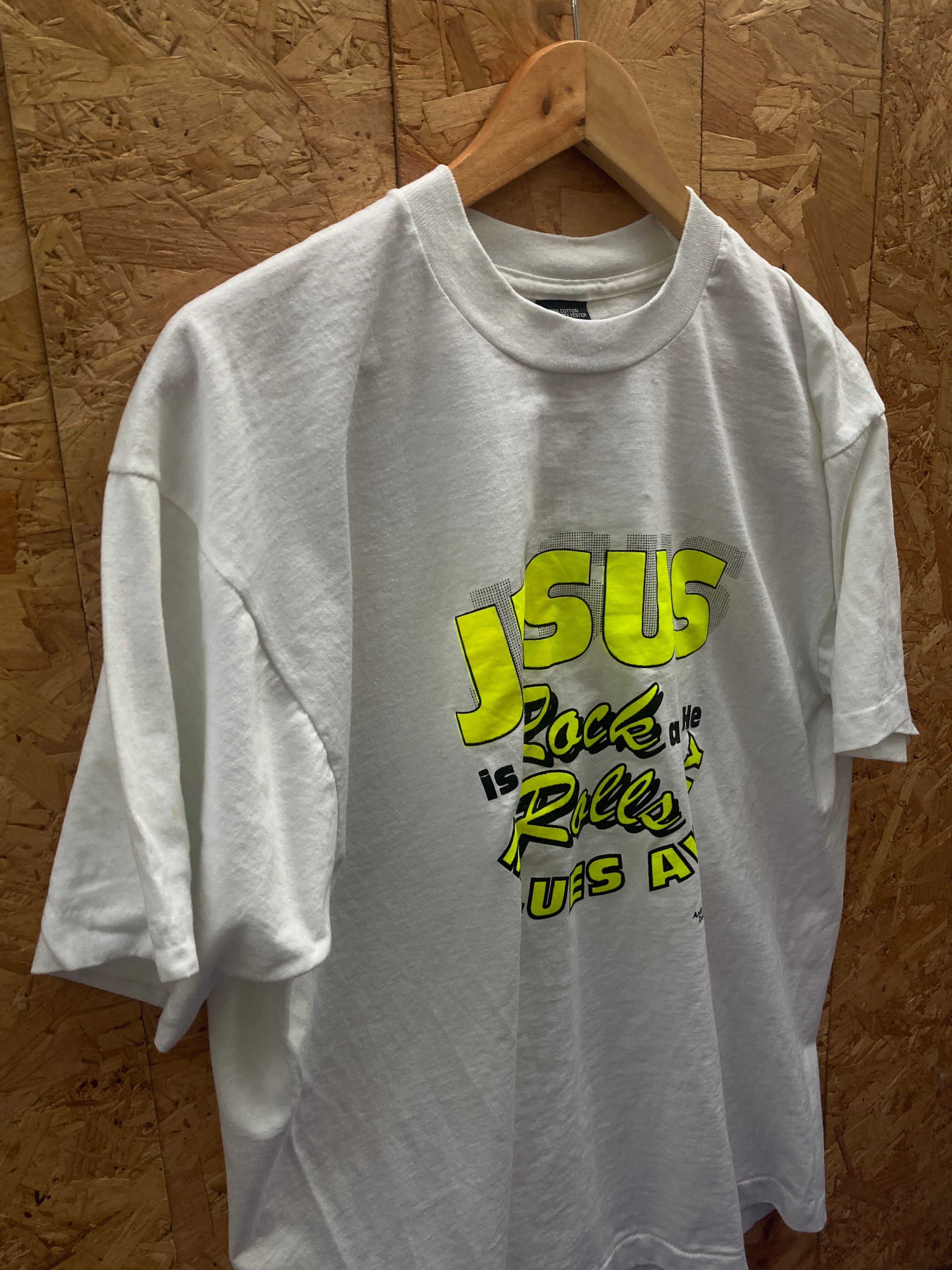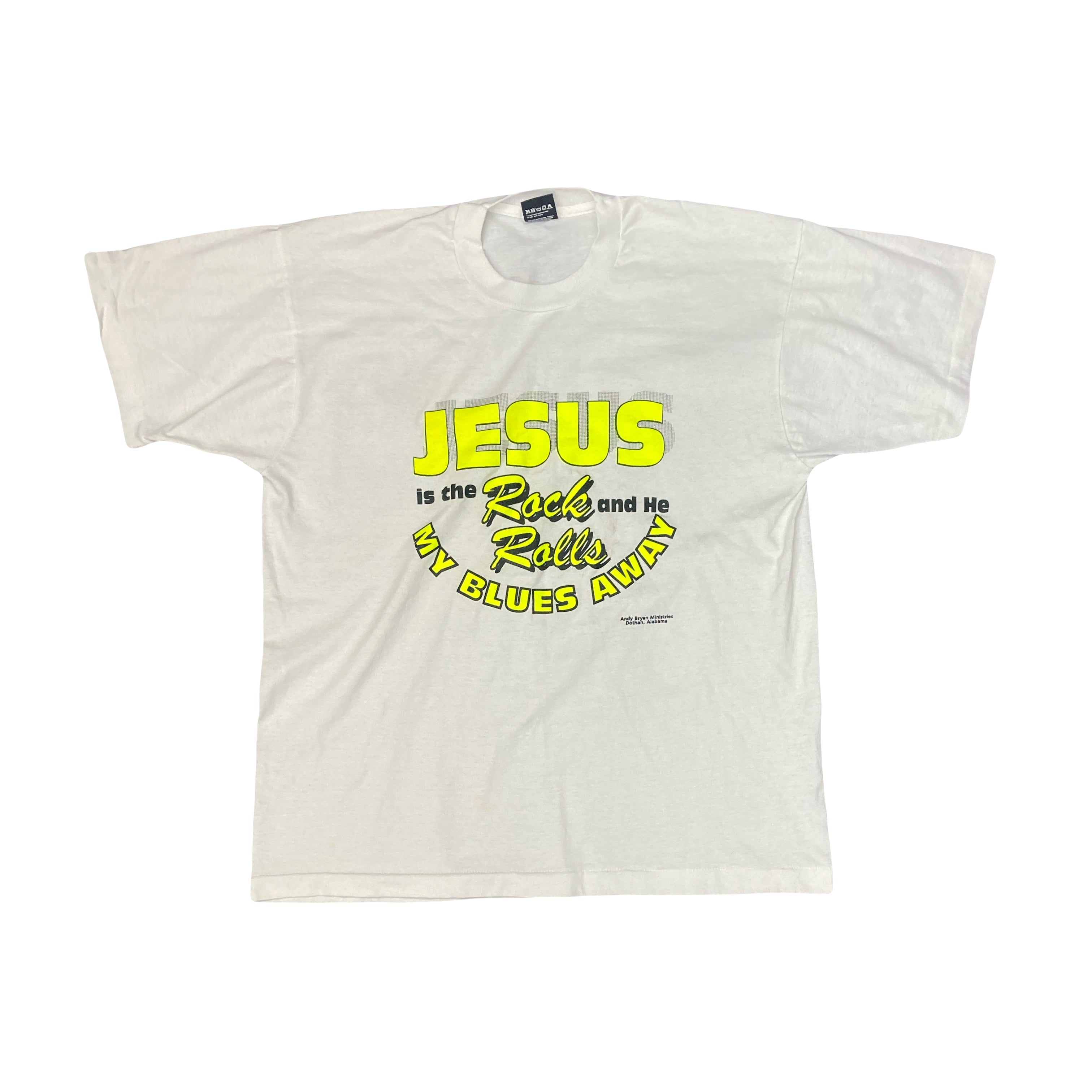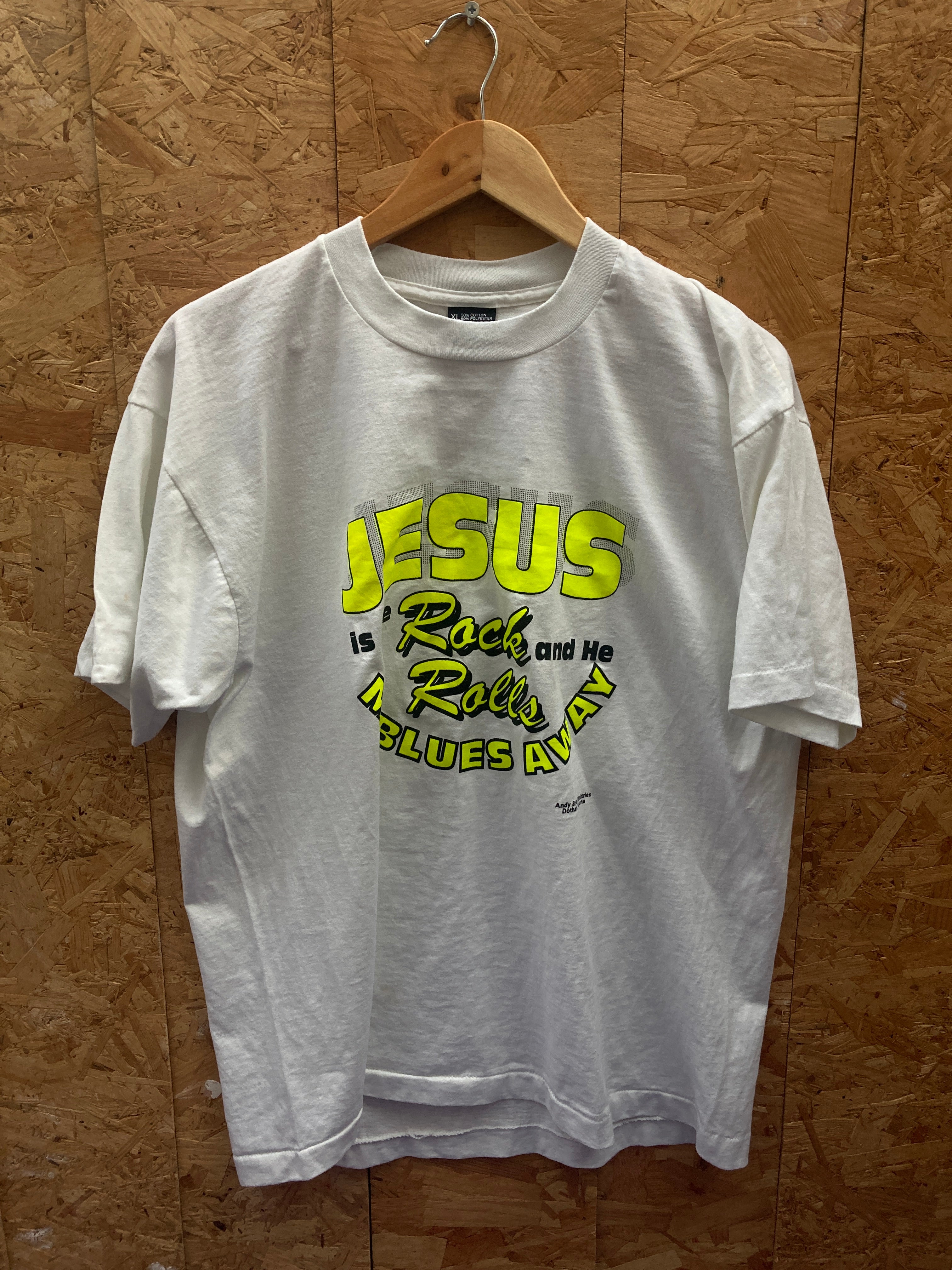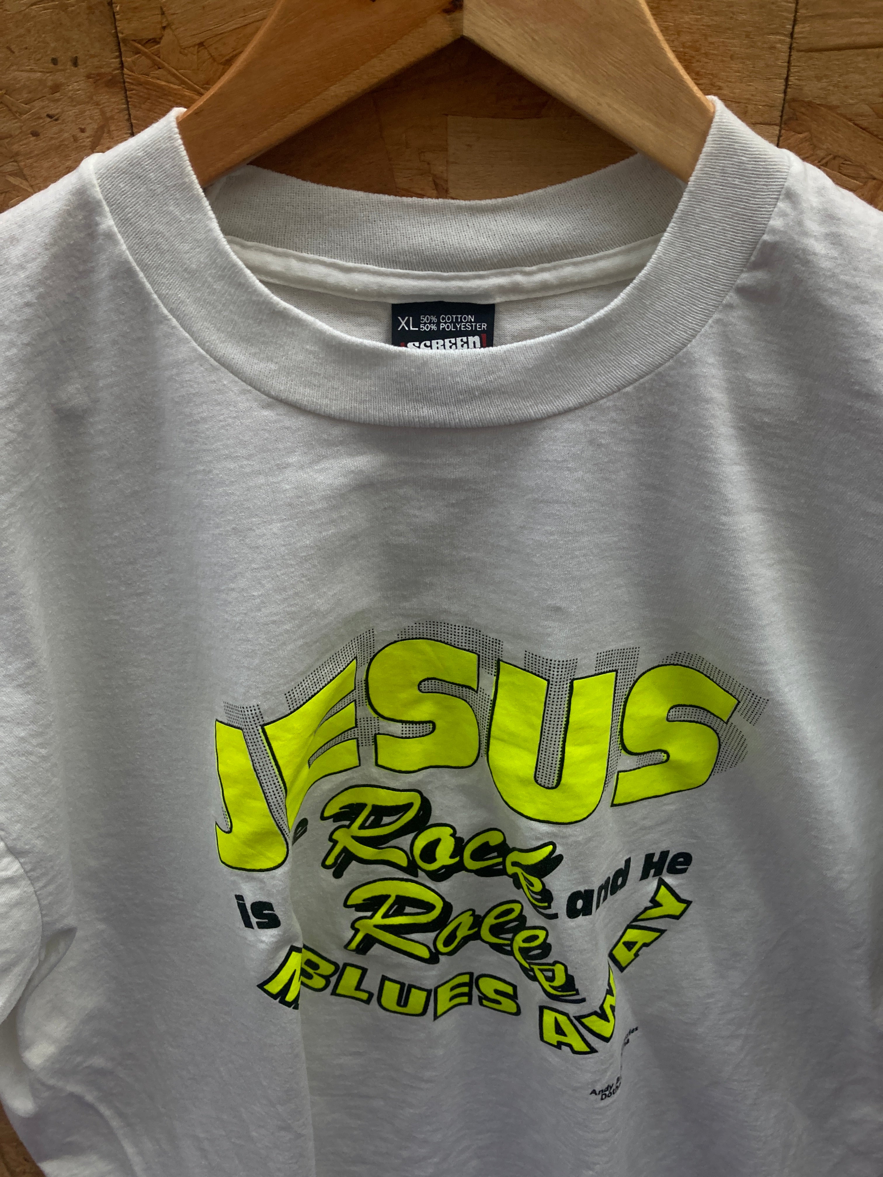 Vintage 90s Jesus Rock & rolls the blues away quirky single stitch white t-shirt size XL by screenstars