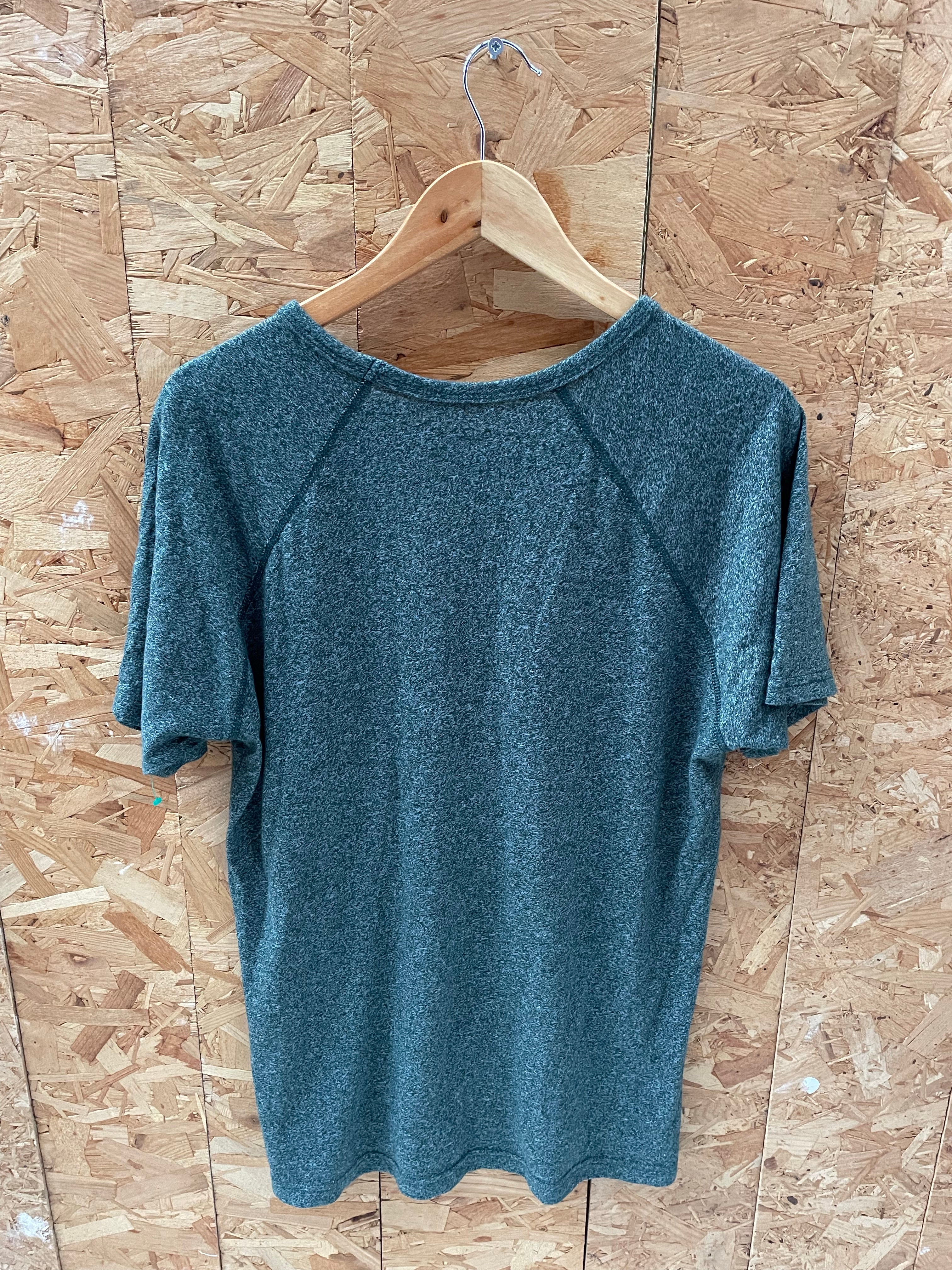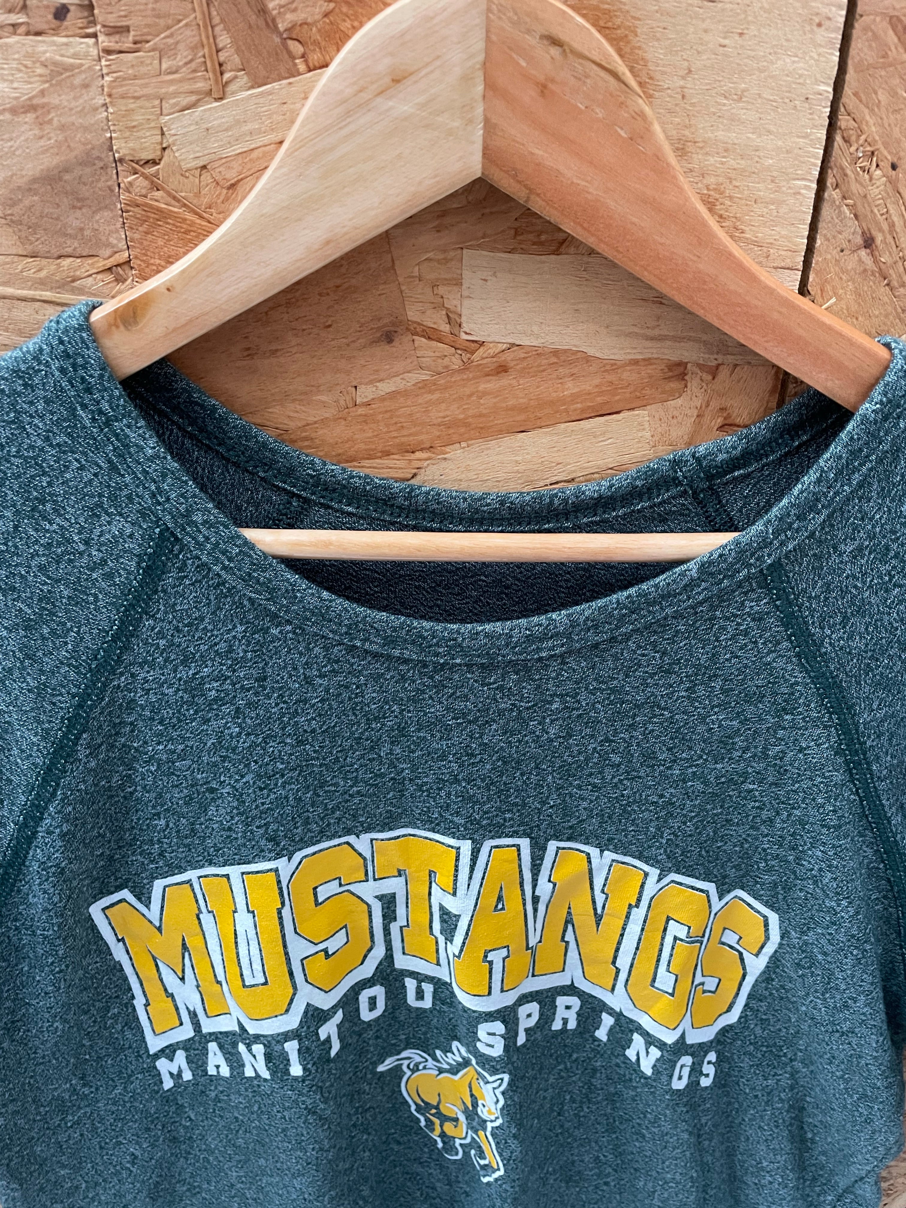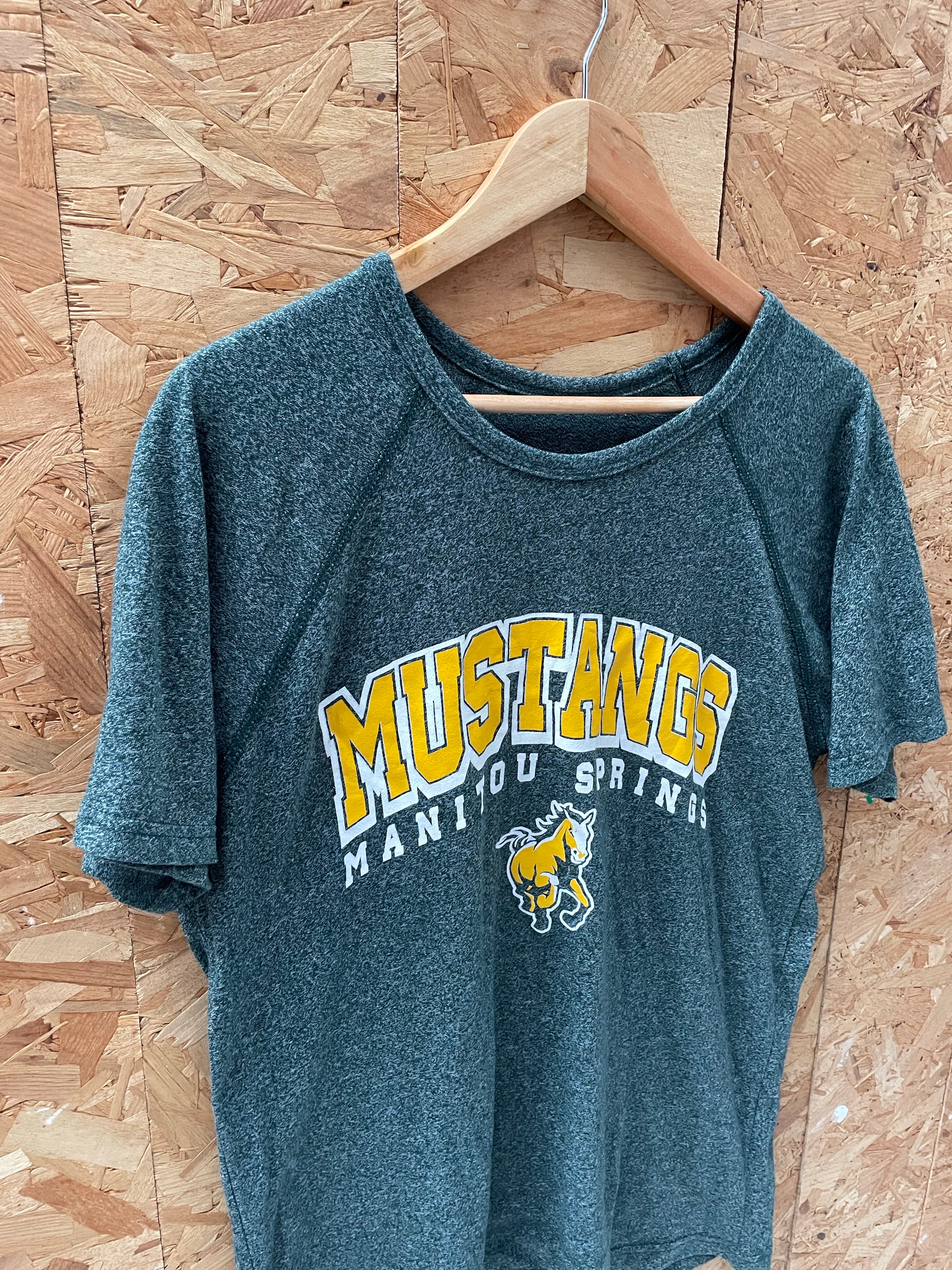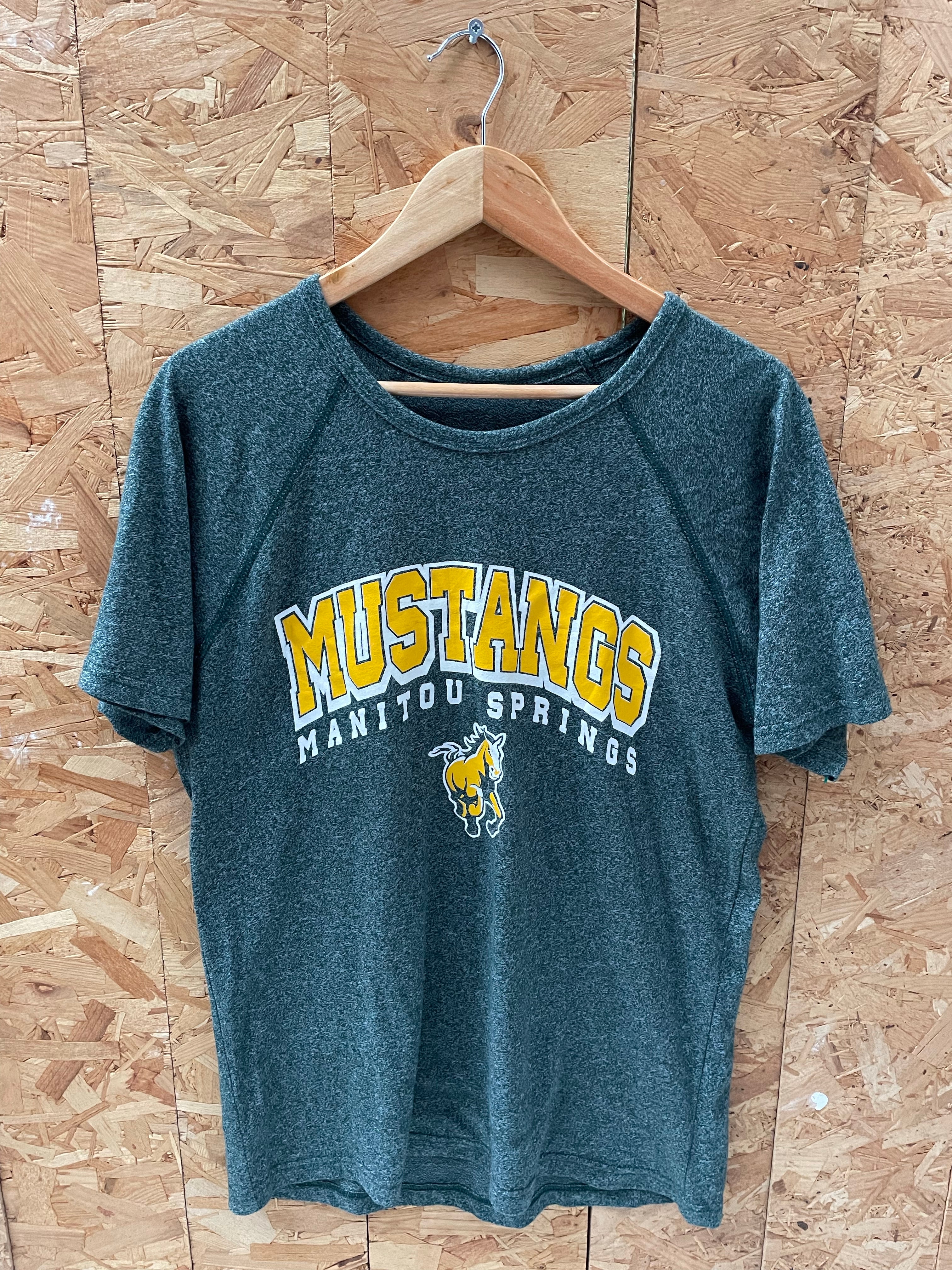 Manitou Springs Mustangs t-shirt in dark green/ heather grey blend. Features a large school logo print. Short sleeves, raglan style. Great condition. no size label fits as L Color: Dark Green.