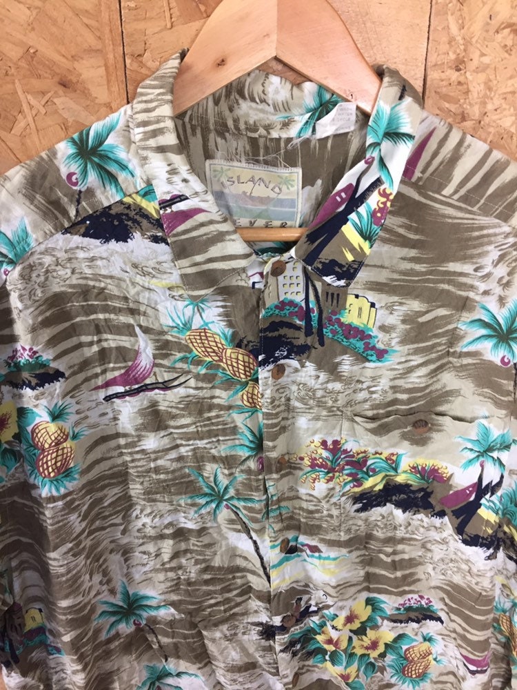 Vintage 90s mens beige green hibiscus palm trees pineapple fruit print Hawaiian eccentric statement quirky party festival shirt size XL