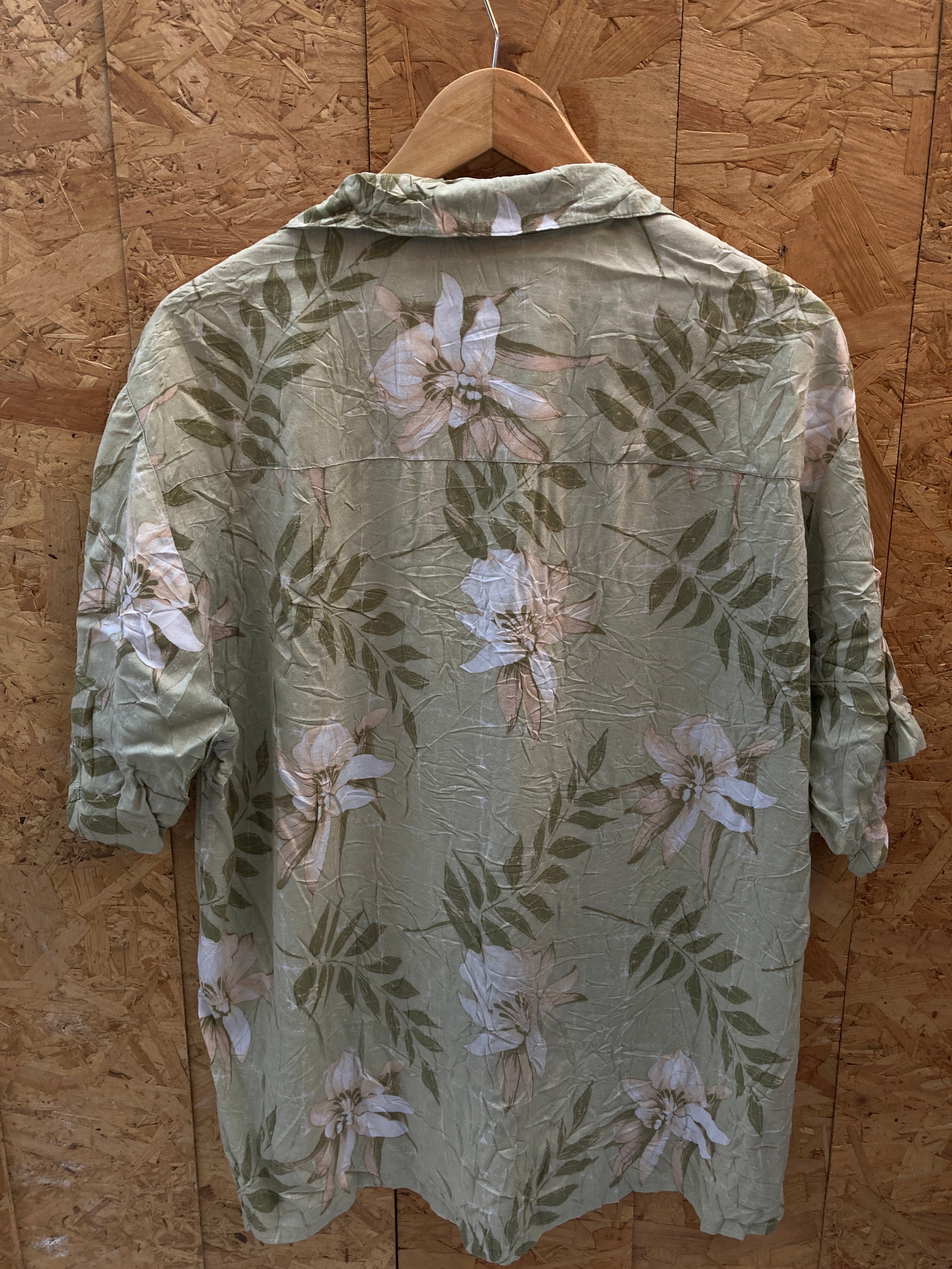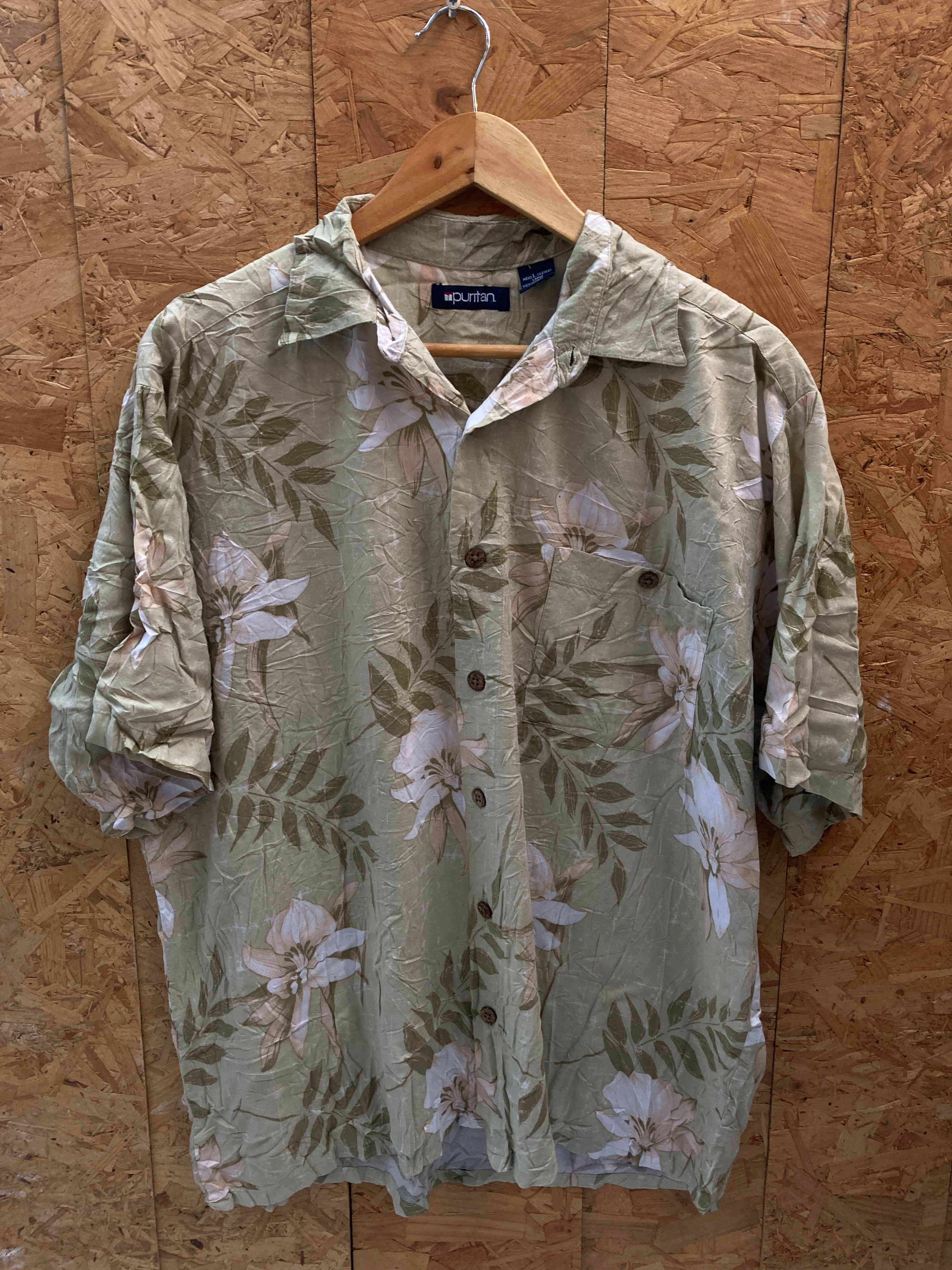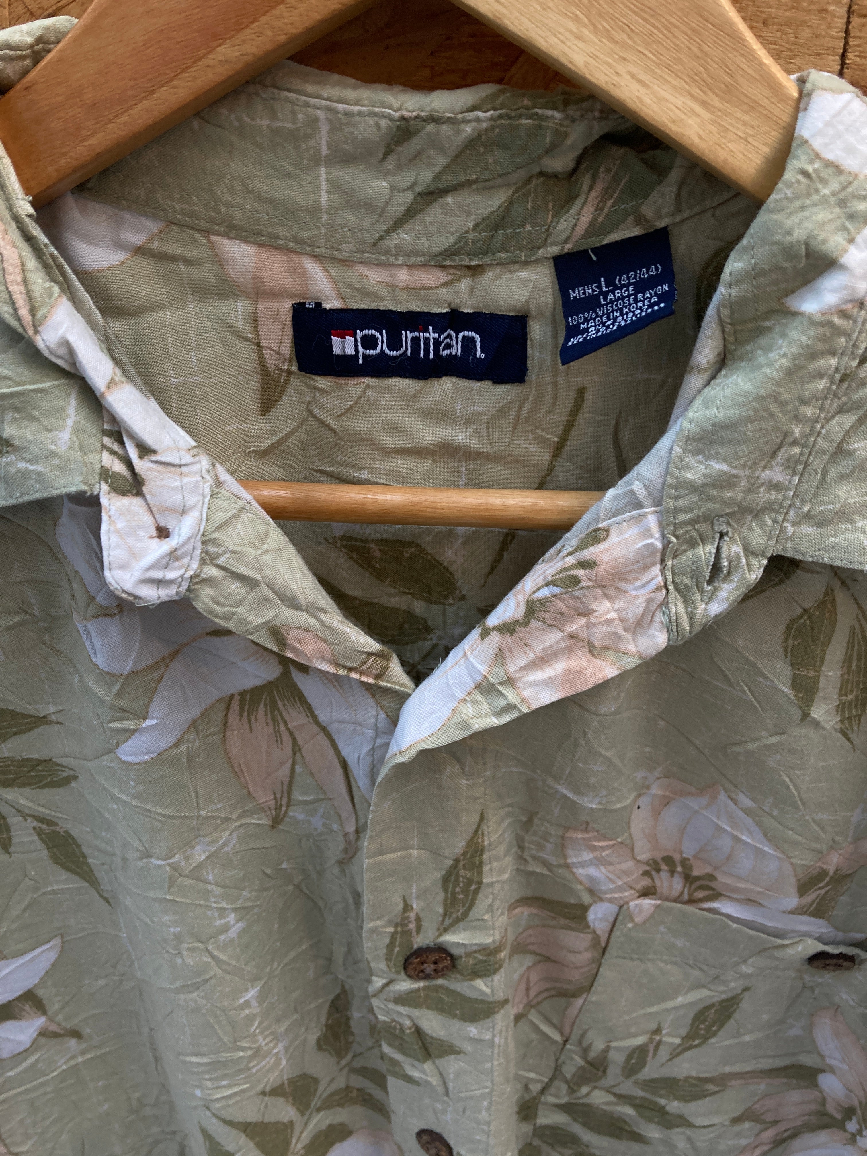 Vintage 90s pastel green beige viscose hibiscus pattern Hawaiian shirt size large by Puritan