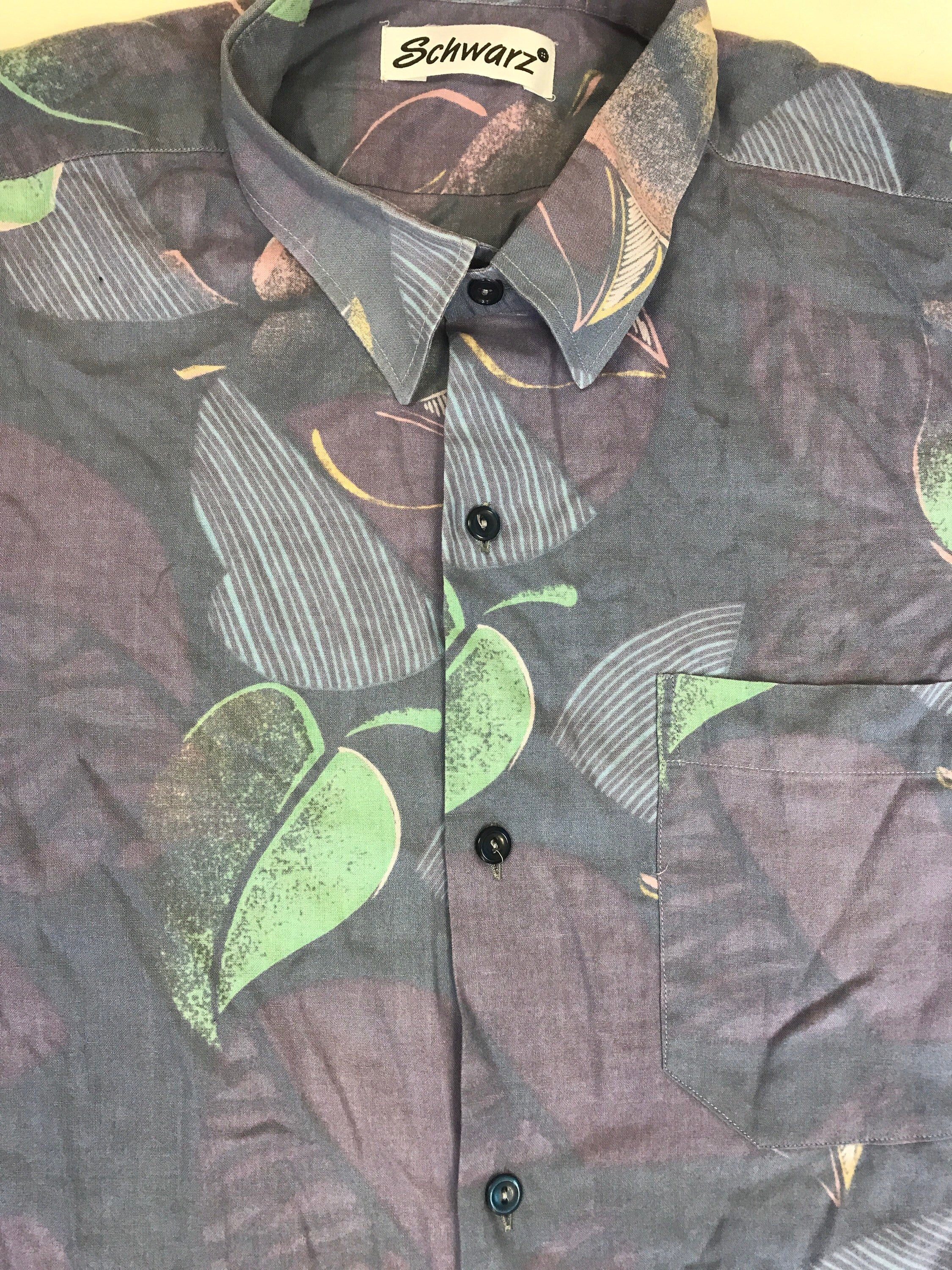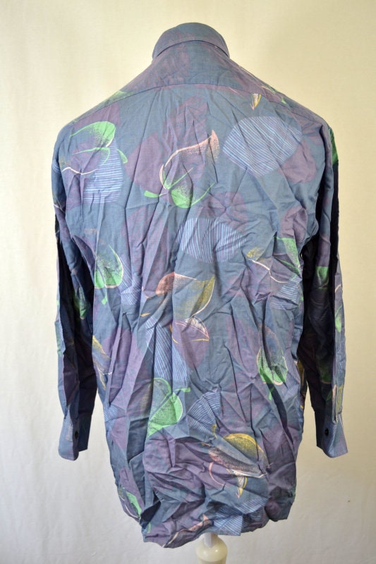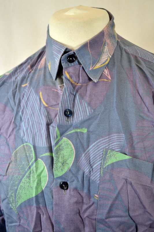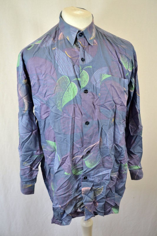 Vintage 90s purple neon green pink leaf abstract wavy Pattern Shirt size XL