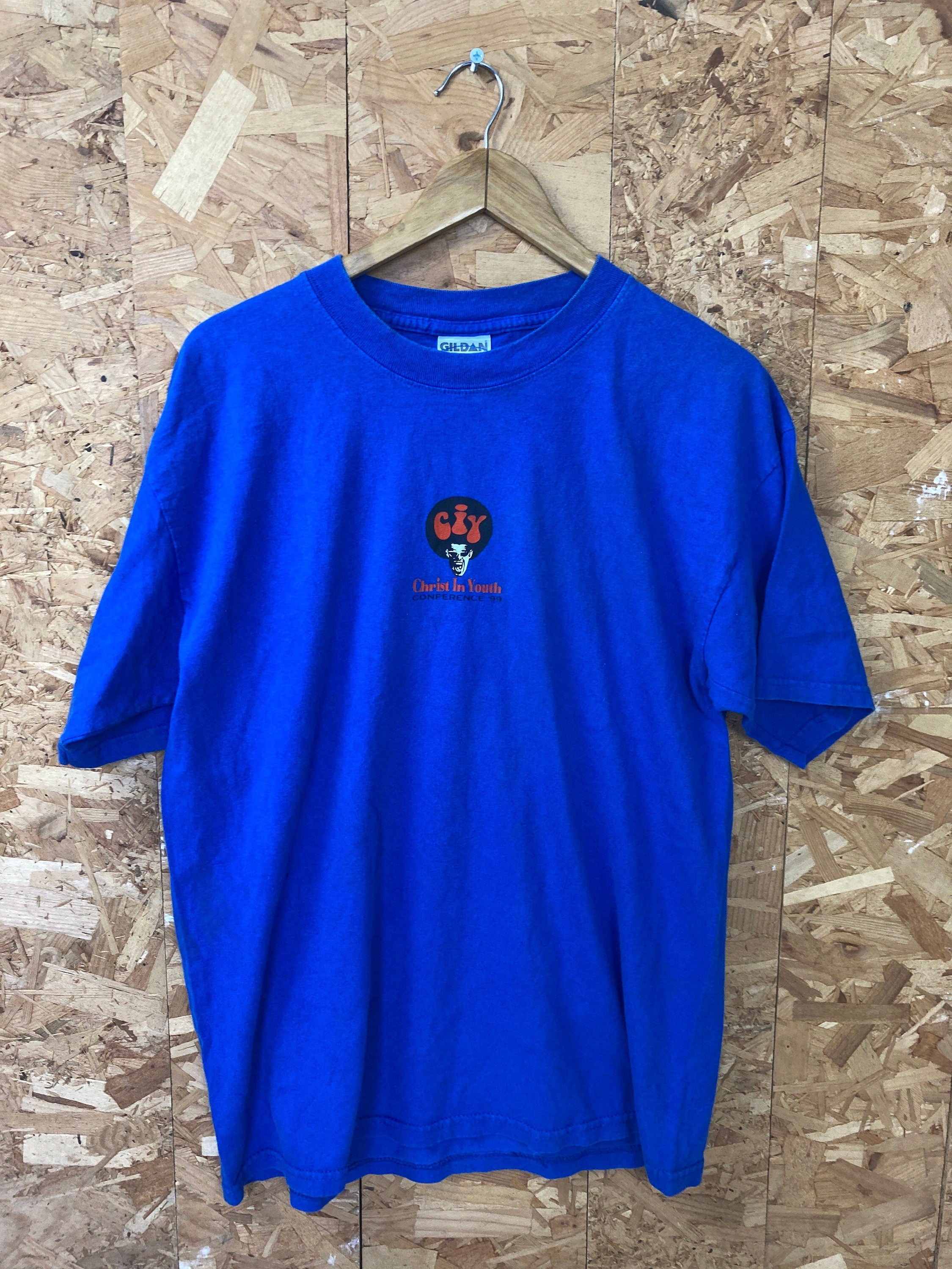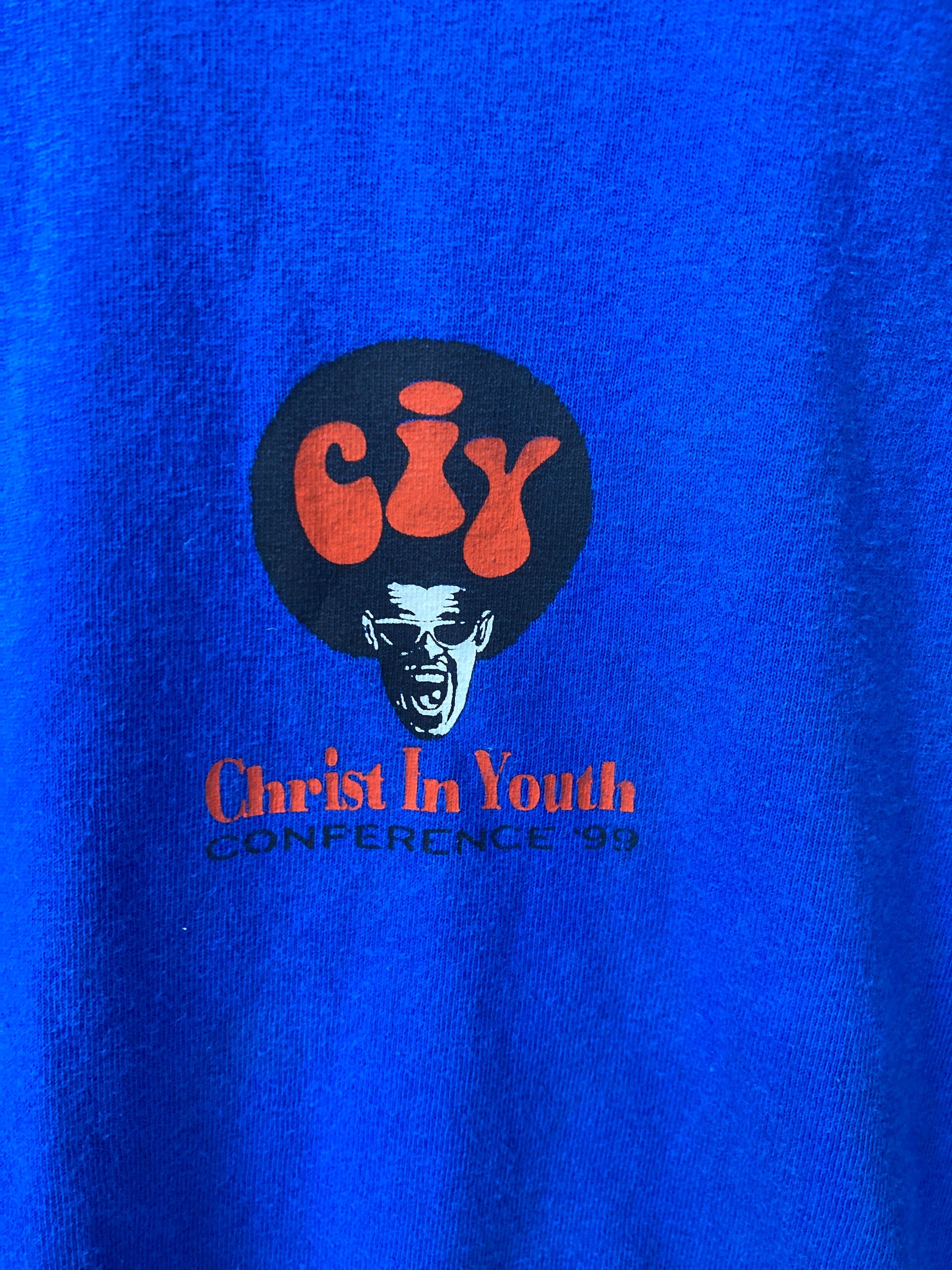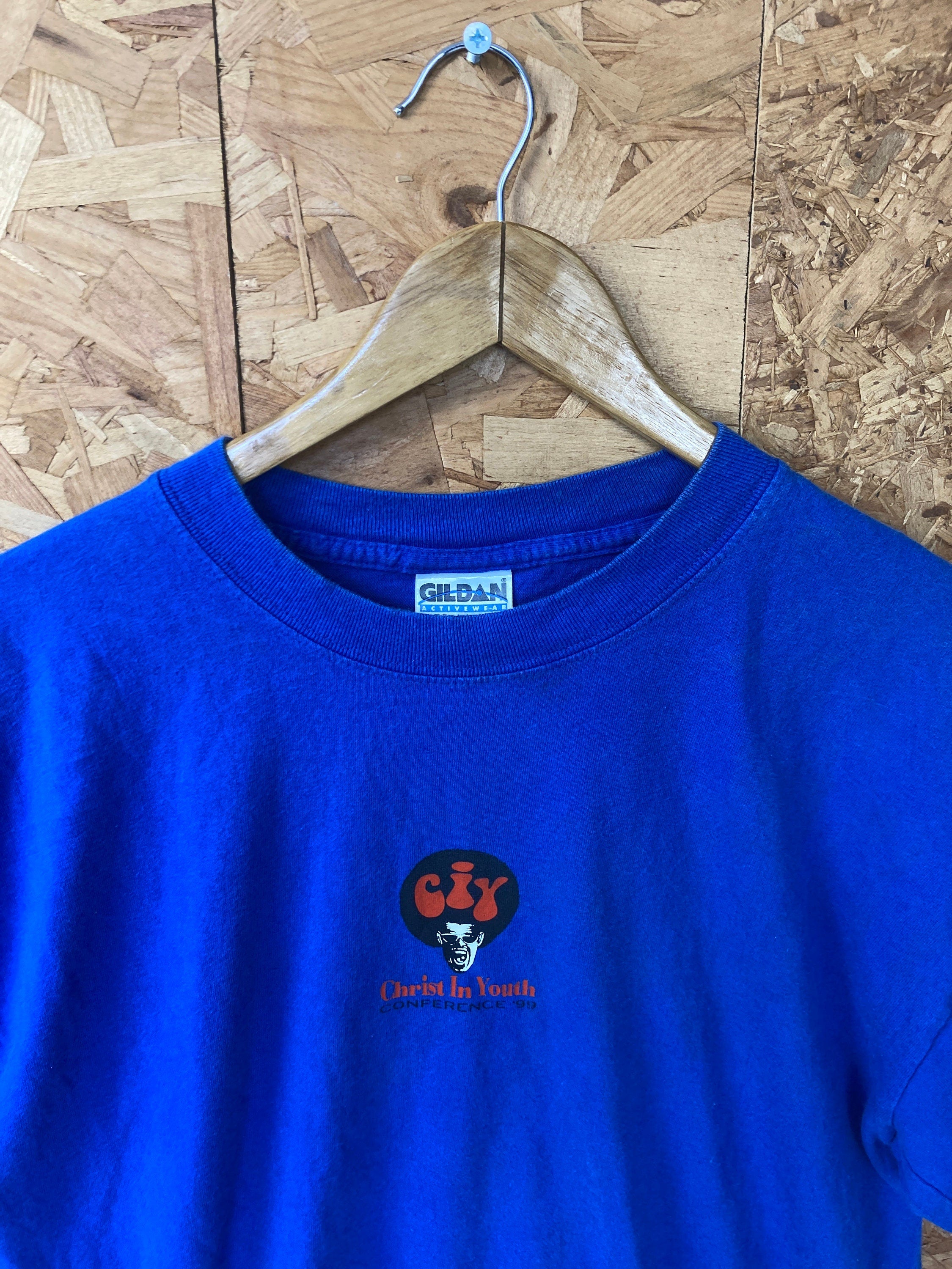 Vintage 90s Quirky Awestruck Christ In Youth religious souvenir USA blue t-shirt size large