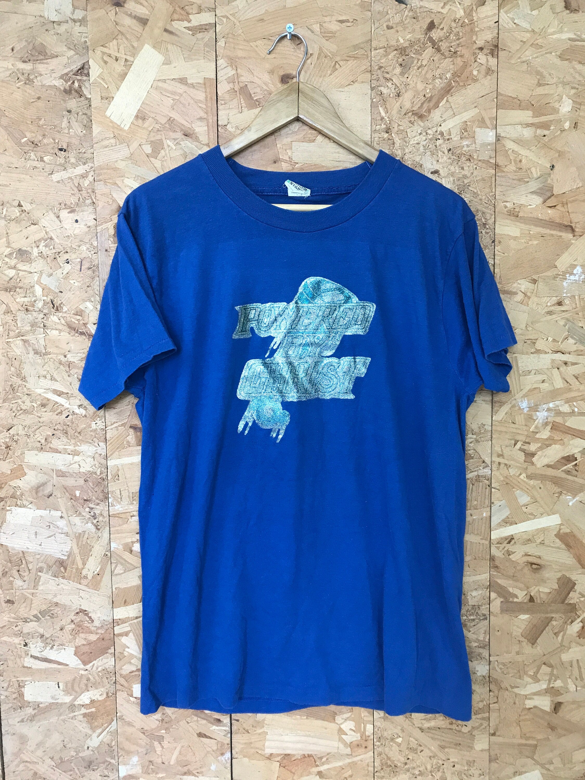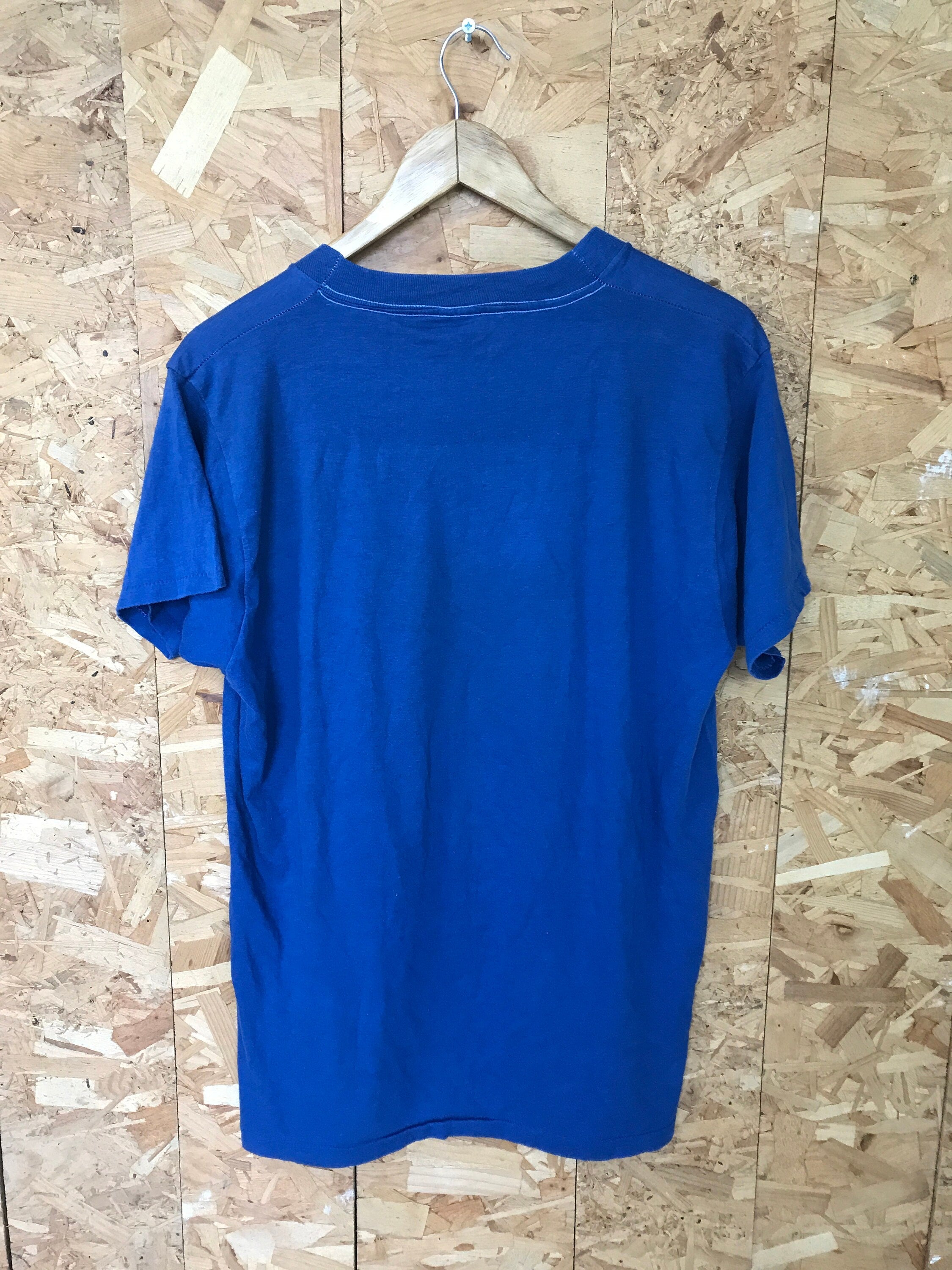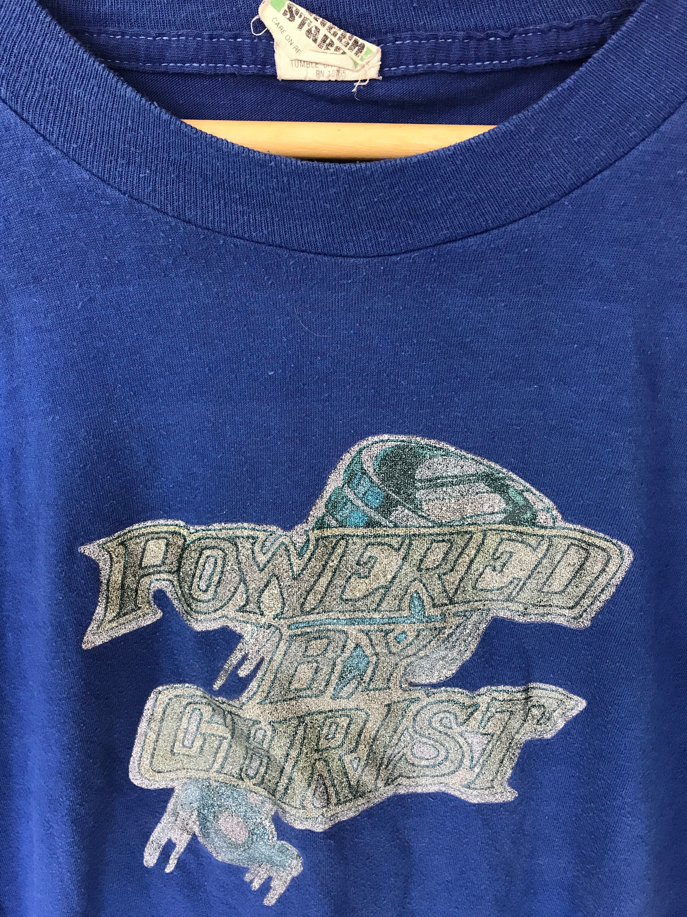 Vintage 90s Quirky Powered By Christ sparkly religious quote souvenir USA blue t-shirt size X-large