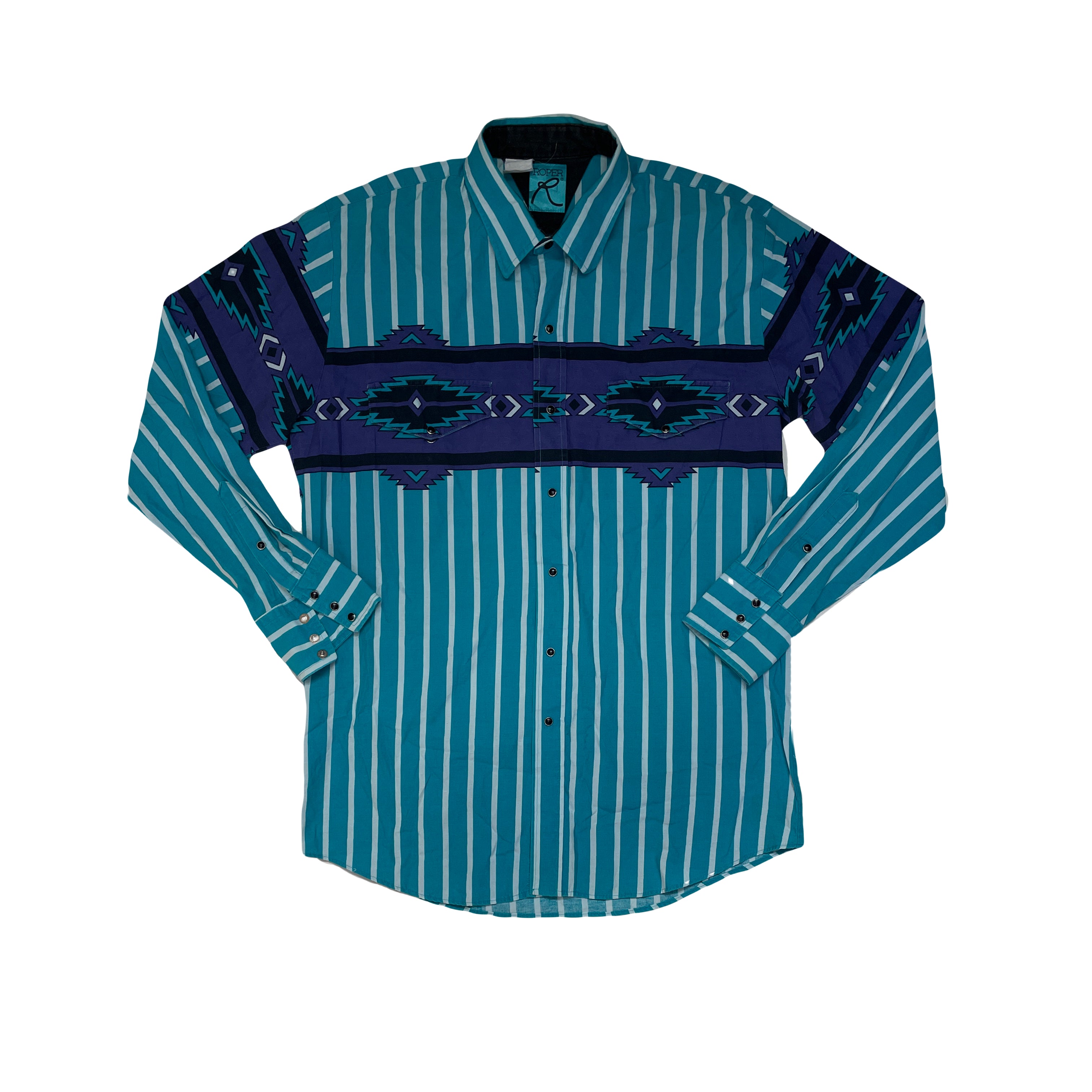 Vintage Roper long sleeve western shirt. Turquoise and purple striped pattern with southwestern design accents. Excellent condition. Color: Turquoise, Purple.