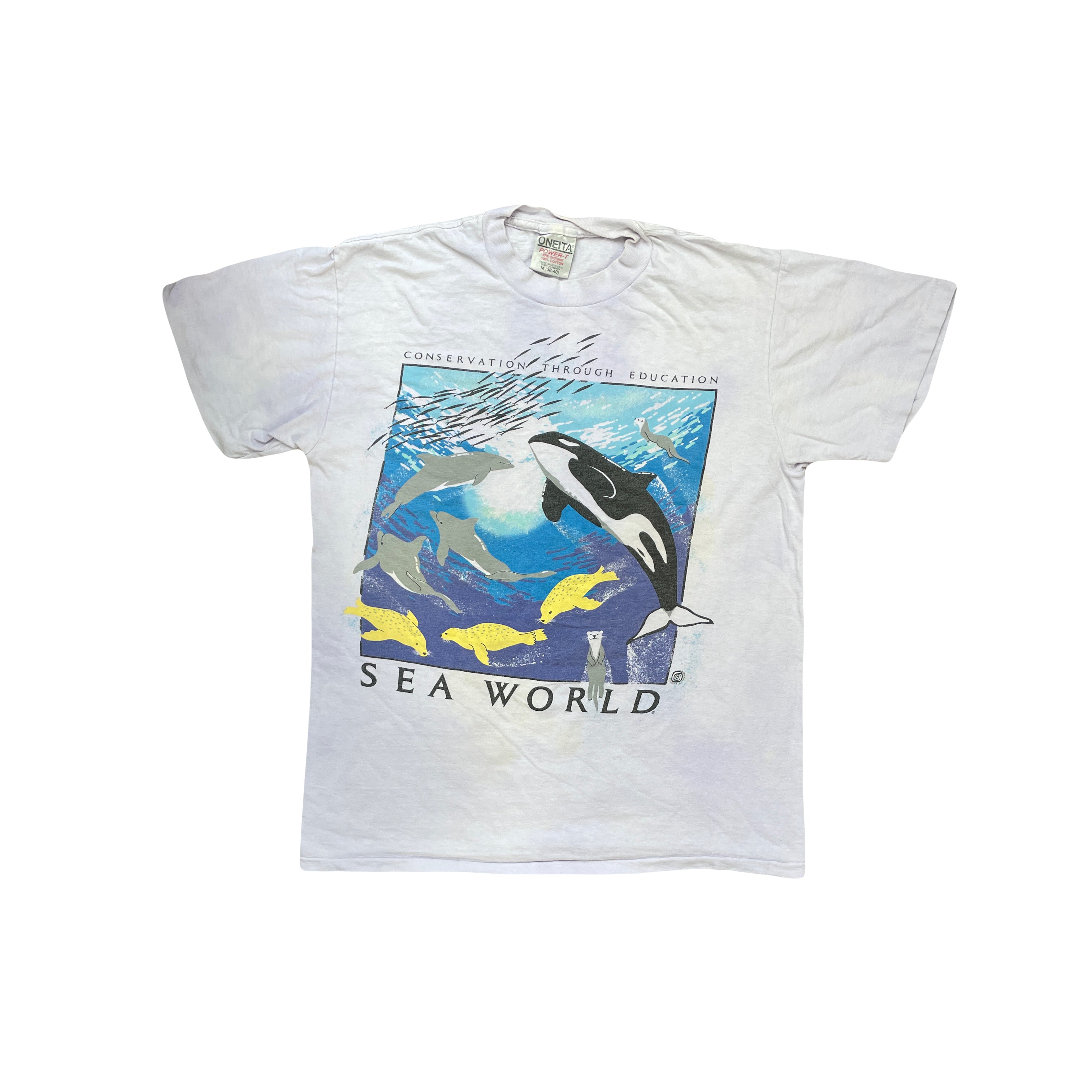 Vintage SeaWorld graphic tee. Lavender color. Features an ocean scene with orcas, dolphins, and seals. Grungy looking with color run and patchy off white lavender look. Made by Oneita. Color: Lavender.