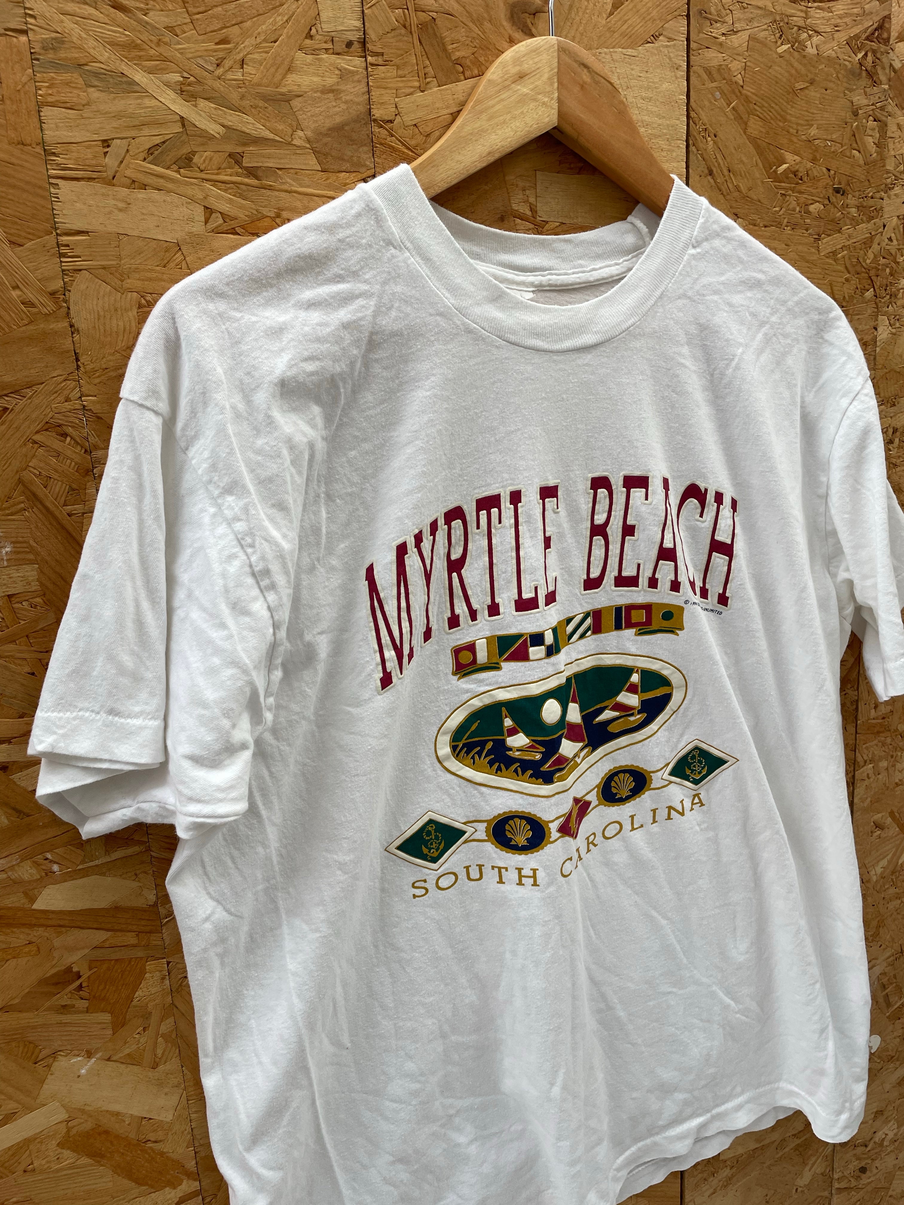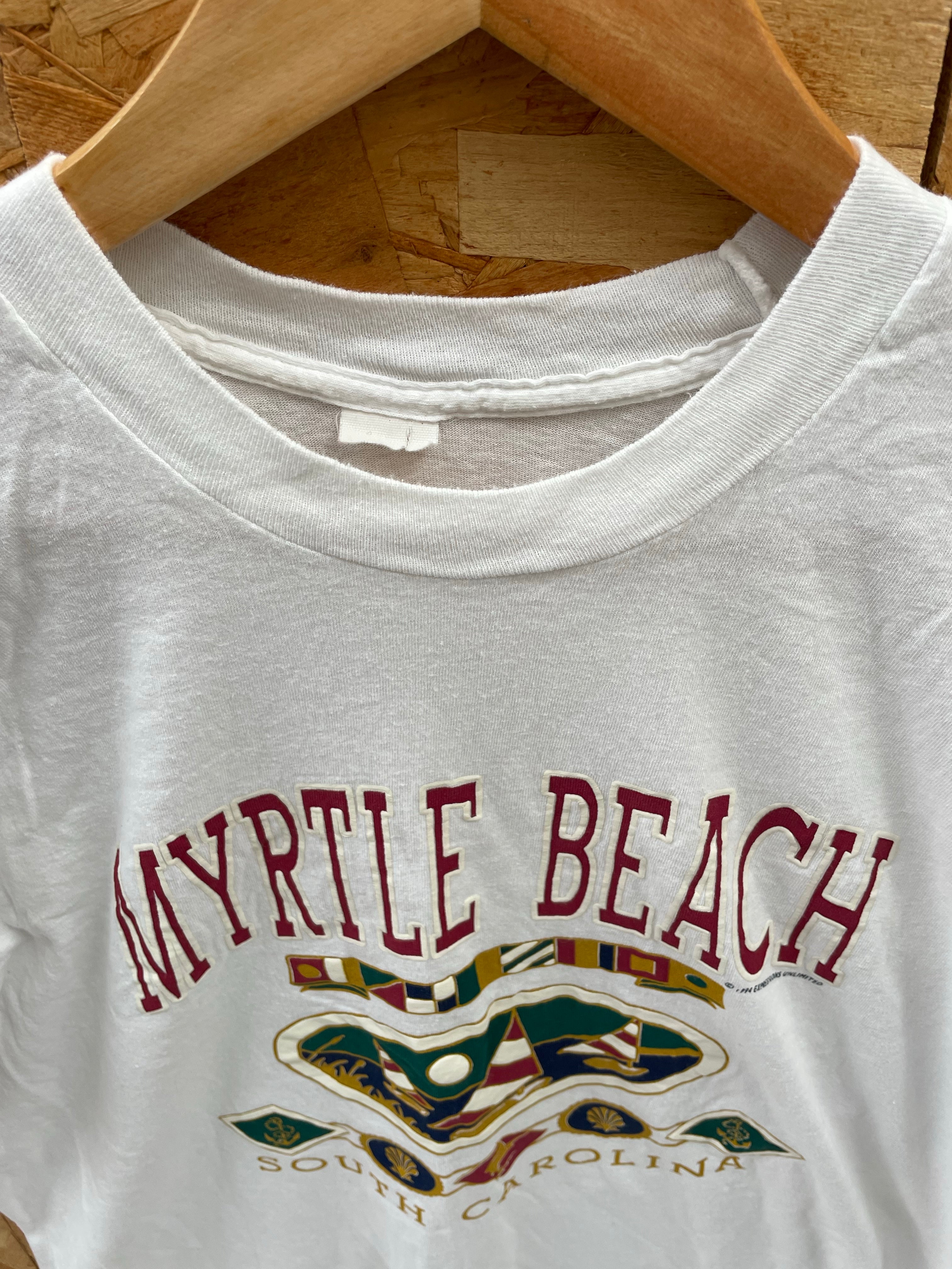 Vintage Myrtle Beach, South Carolina graphic tee. White cotton short sleeve shirt with a colorful design. Size not visible. Fits as a L or XL Color: White.