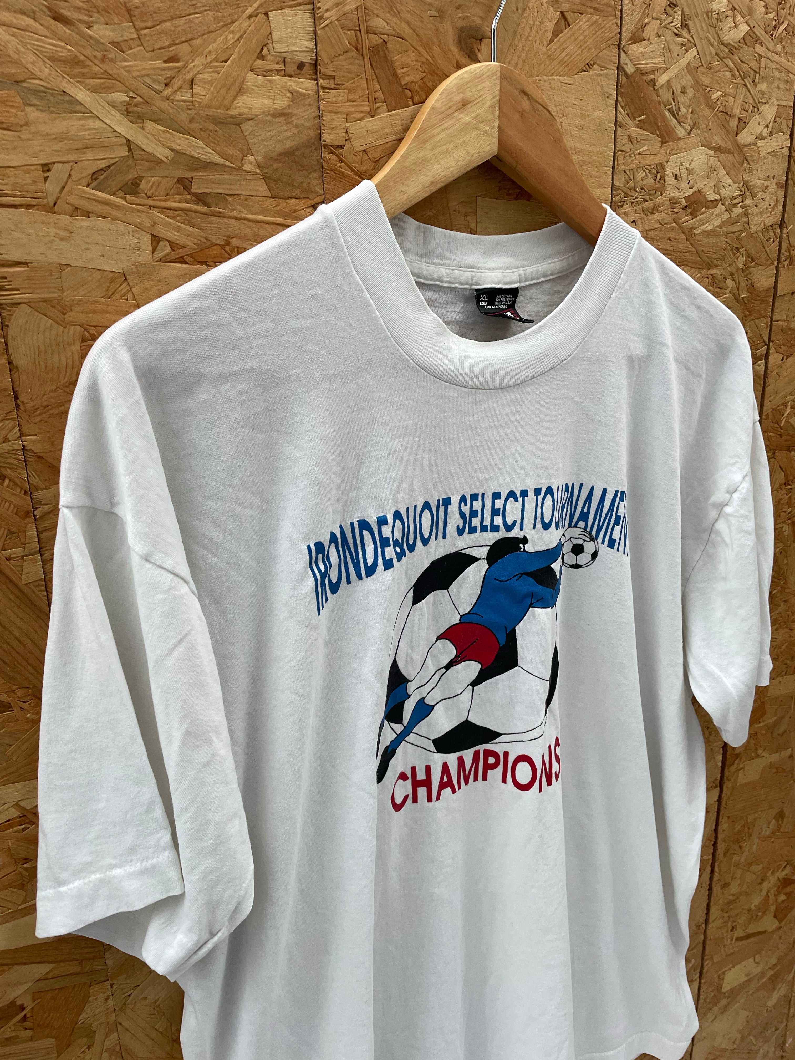 Vintage BEST brand t-shirt from the Irondequoit Select Tournament. Features a graphic of a soccer player and the word 'CHAMPIONS'. Made in USA. Excellent condition, appears unworn.