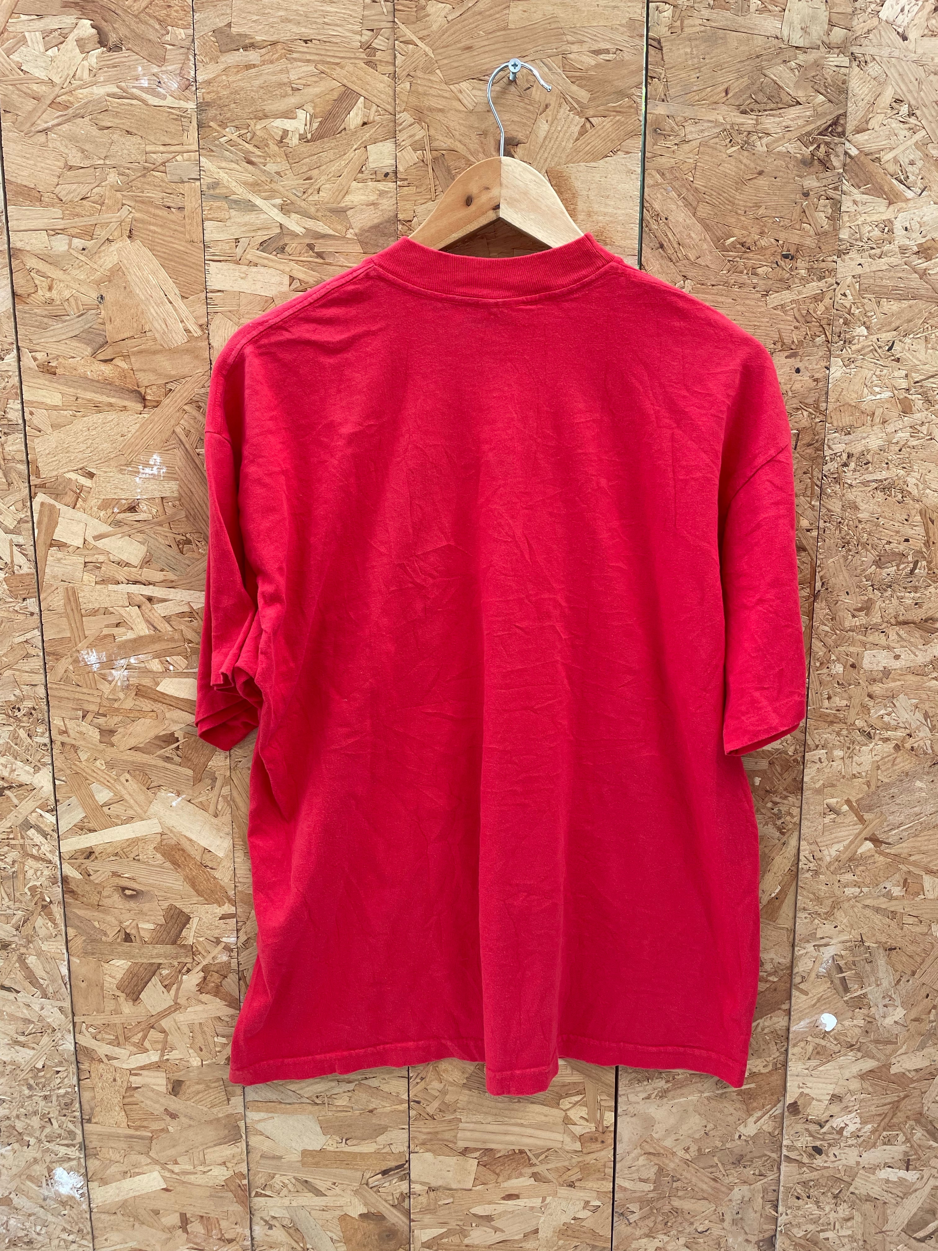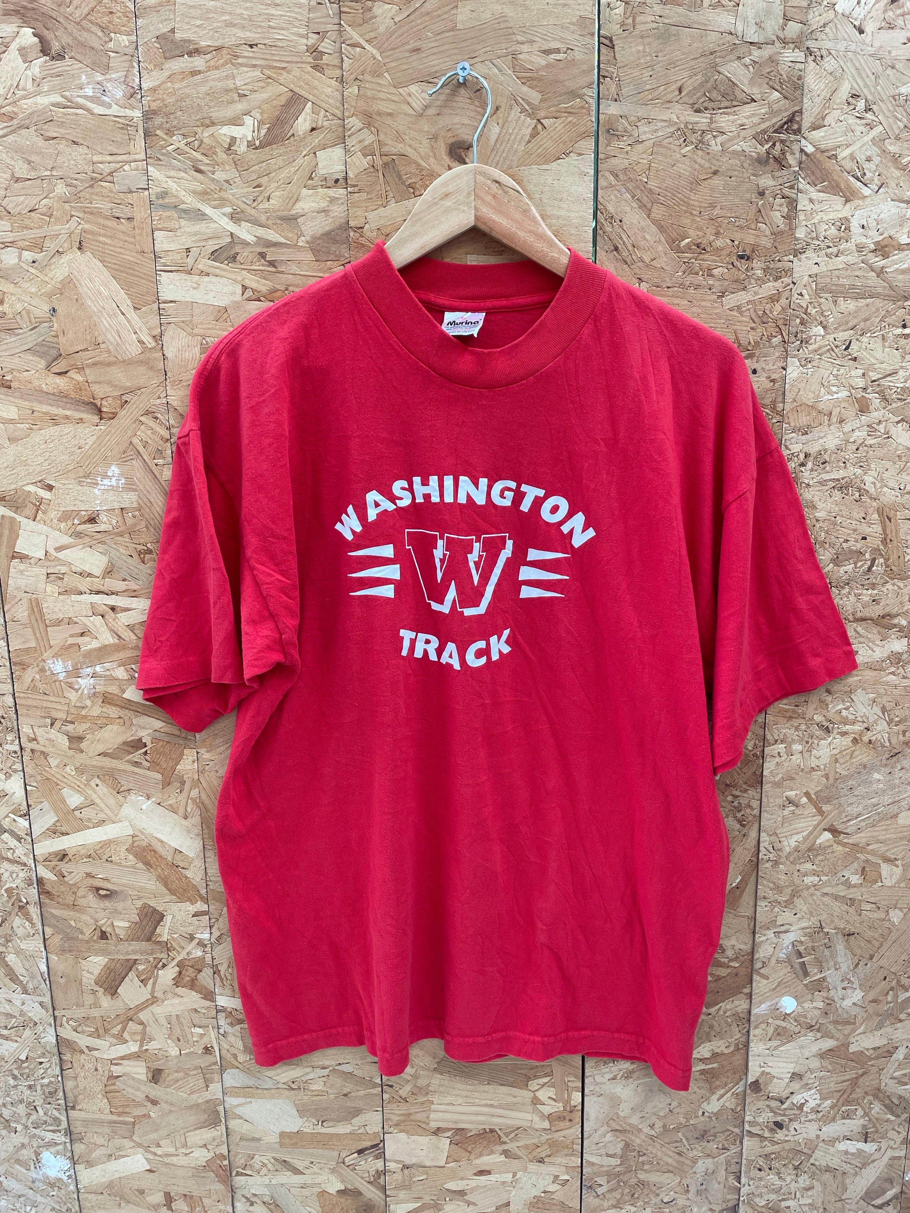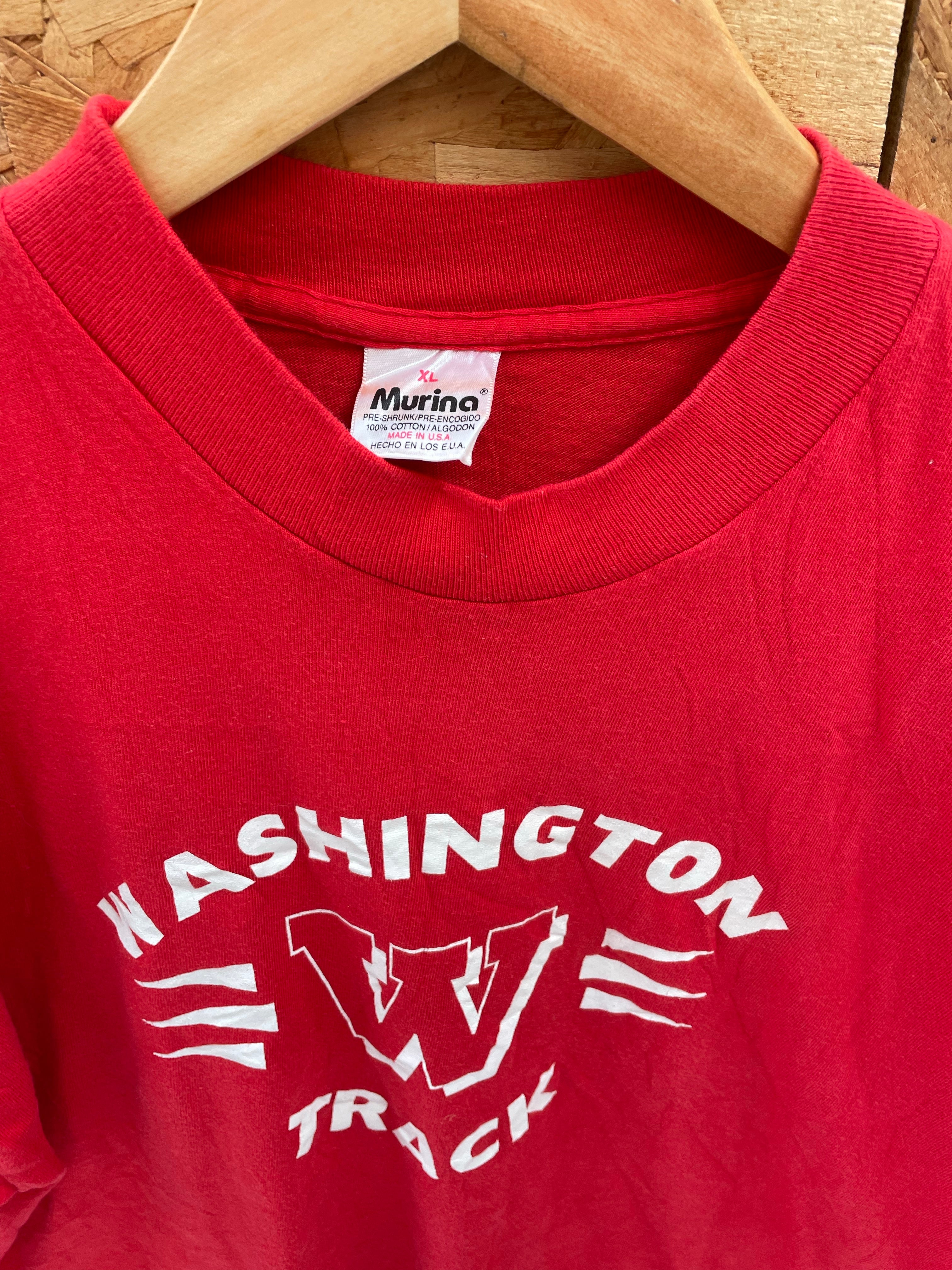 Vintage red Washington Track t-shirt. Features a large white graphic on the front. Great condition for its age. Made of soft cotton. Color: Red.