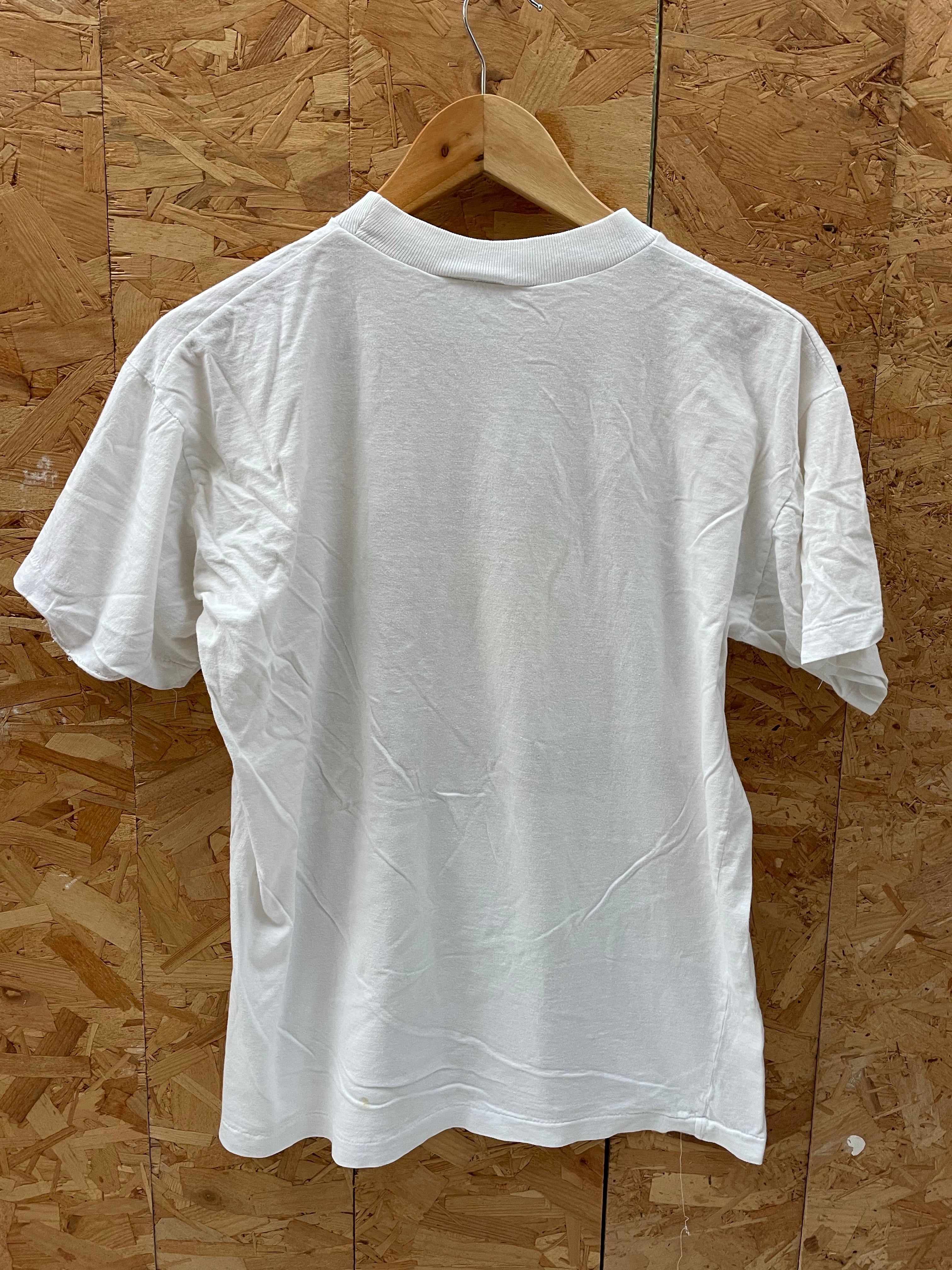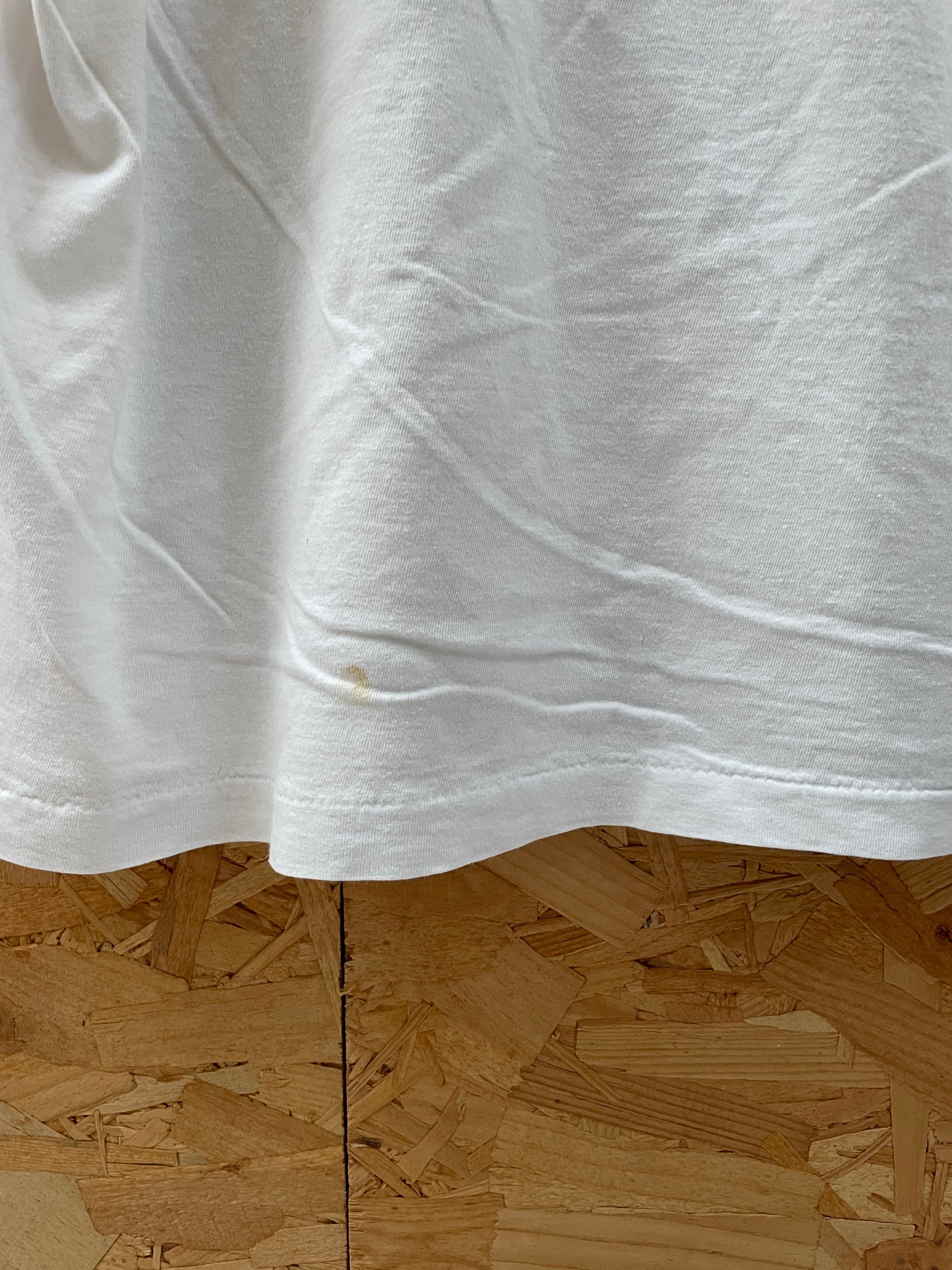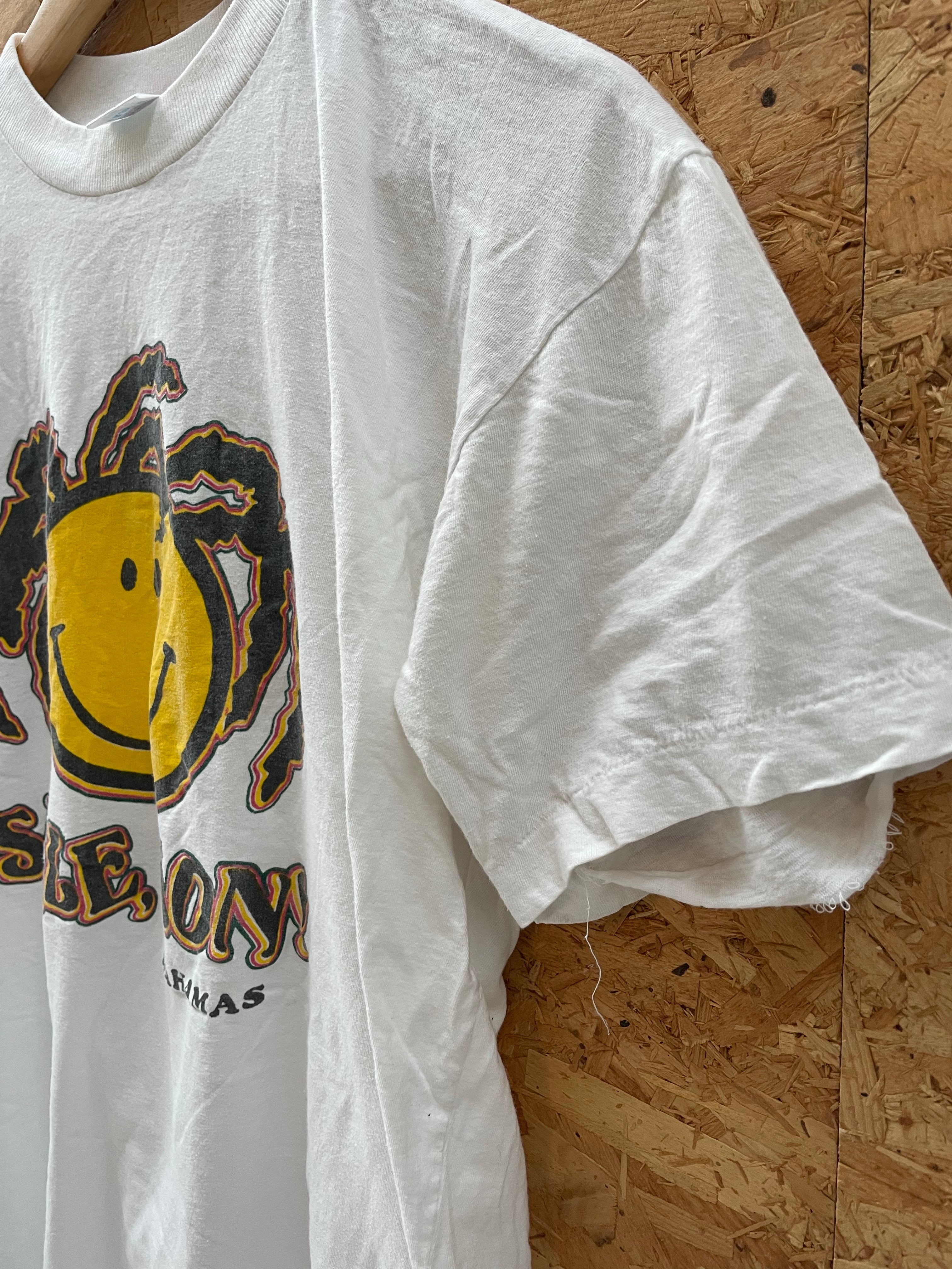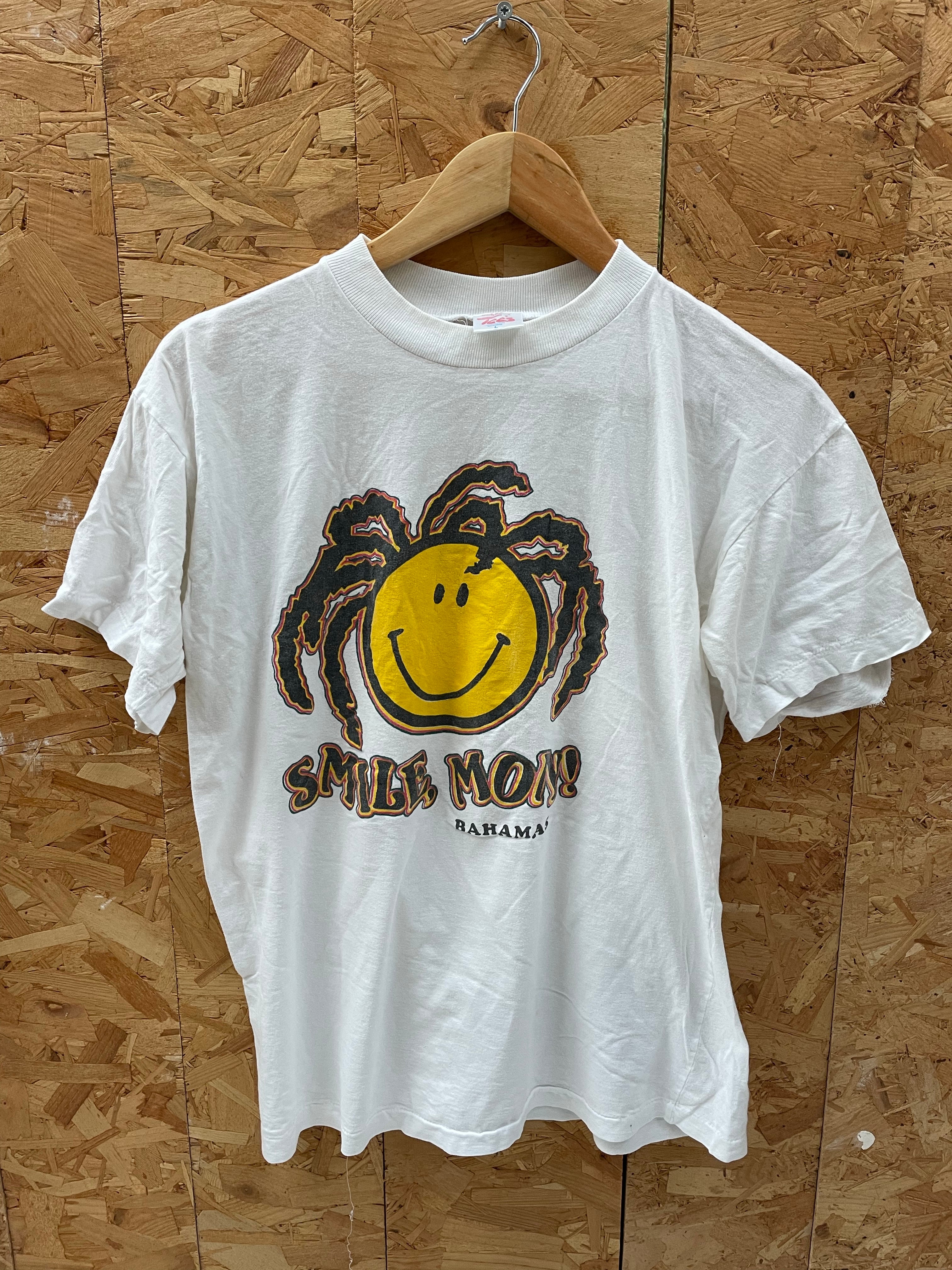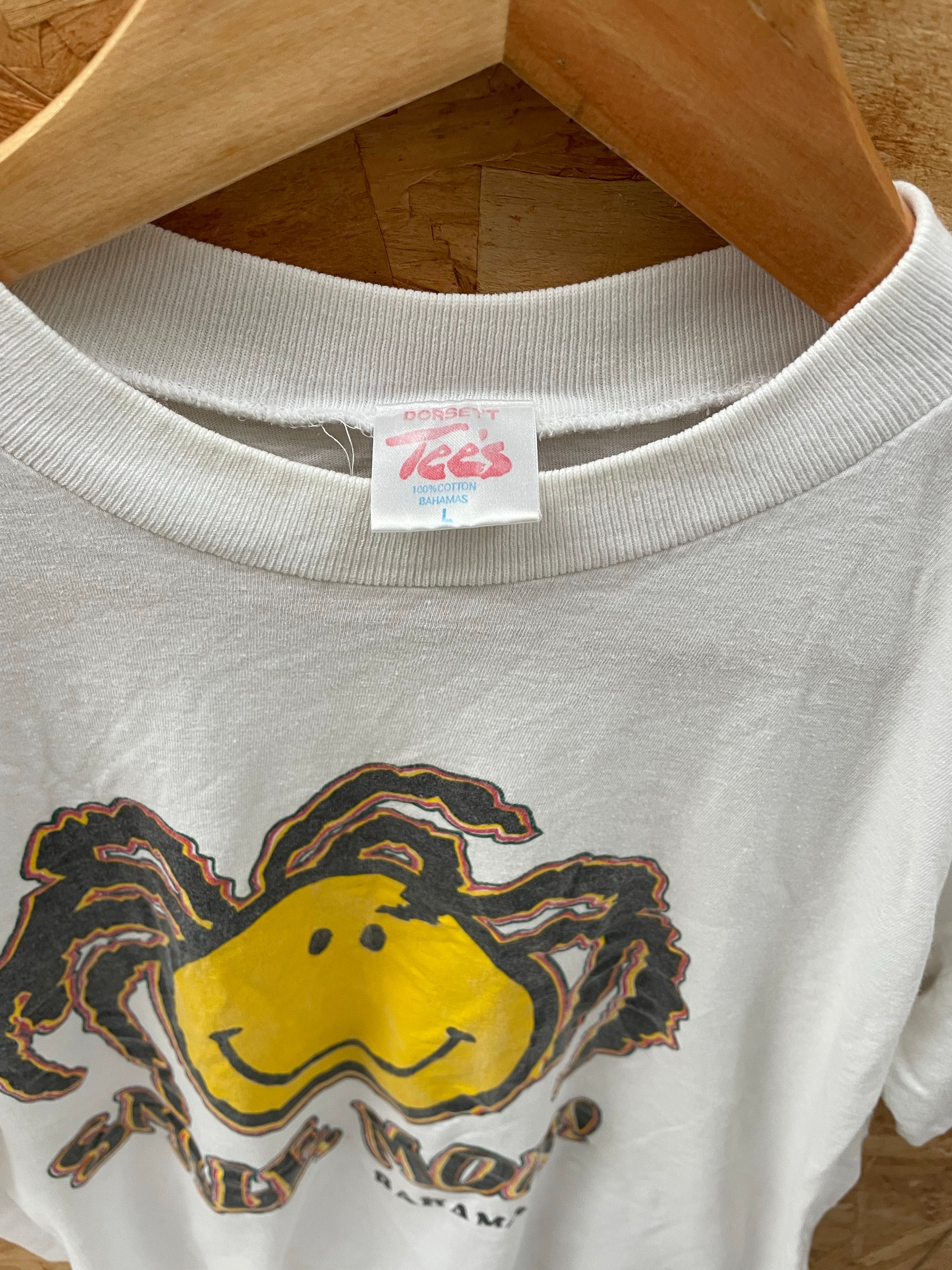 Vintage Smile Now Bahamas graphic t-shirt. White, large size. Features a smiley face with crab-like claws graphic. Pre-owned, good condition with minor wear. Fits a boxy medium. Color: White.