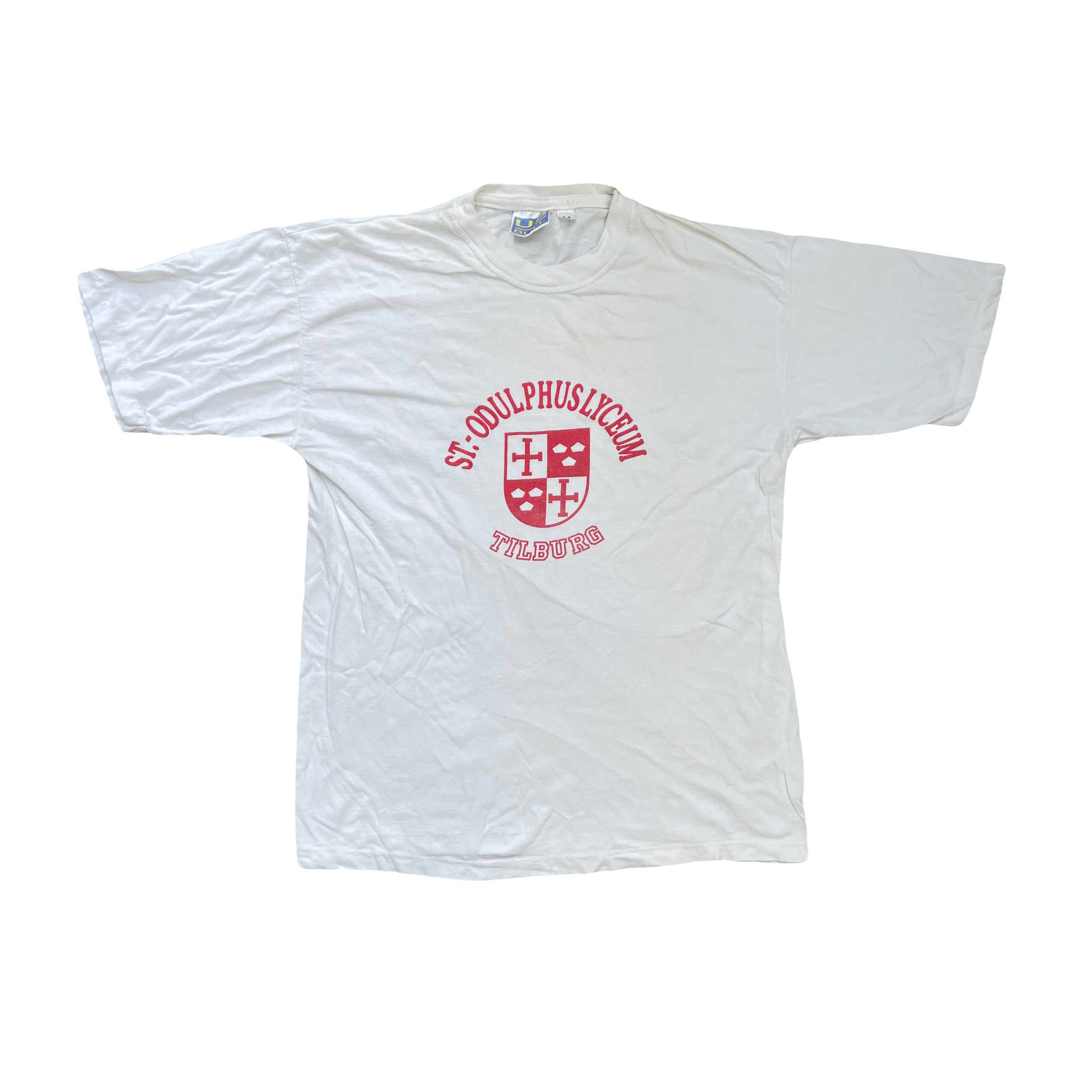Vintage single stitch USA College white t-shirt with red St. Odulphus Lyceum Tilburg crest graphic. Size M. A classic piece for any vintage enthusiast.