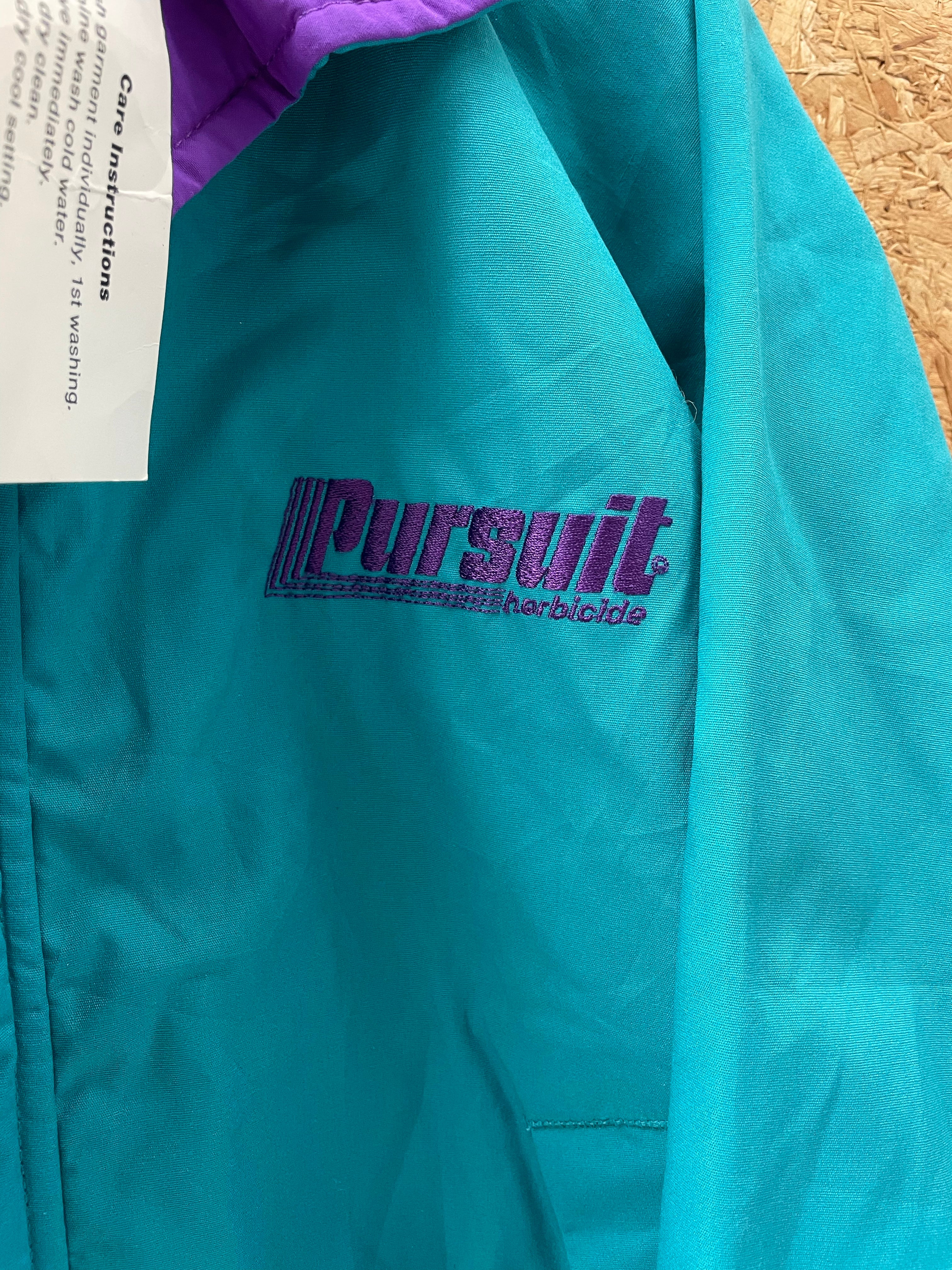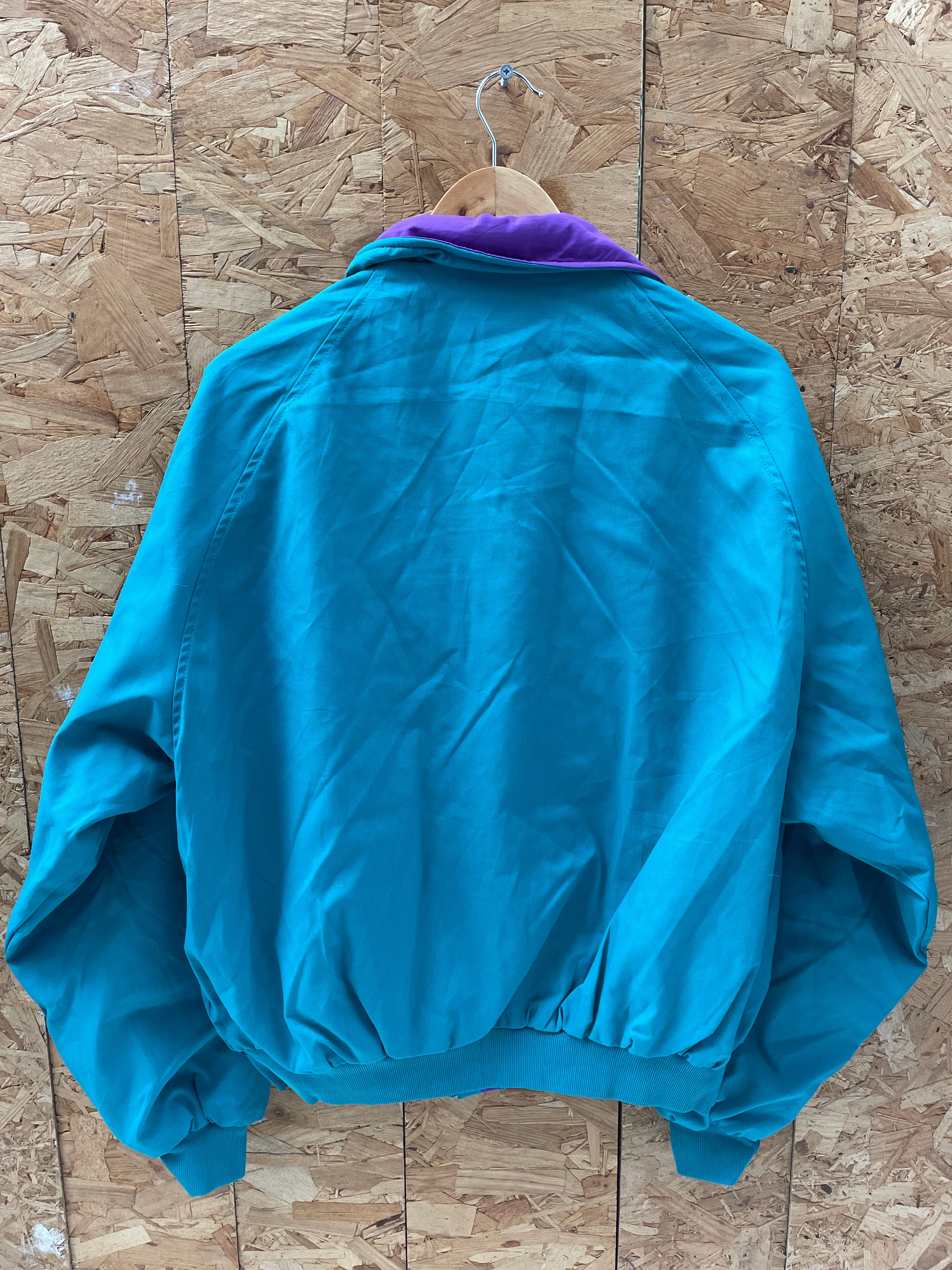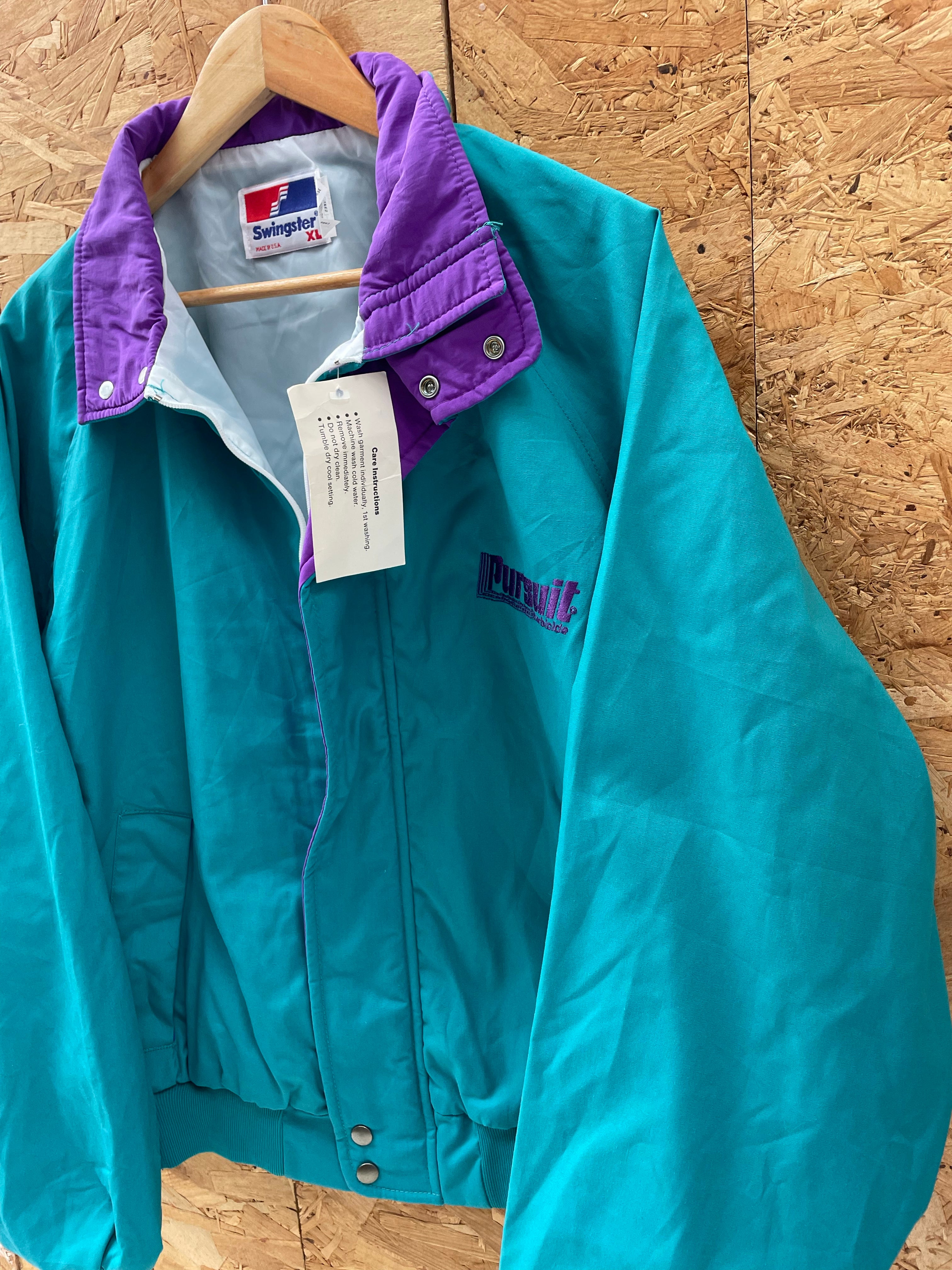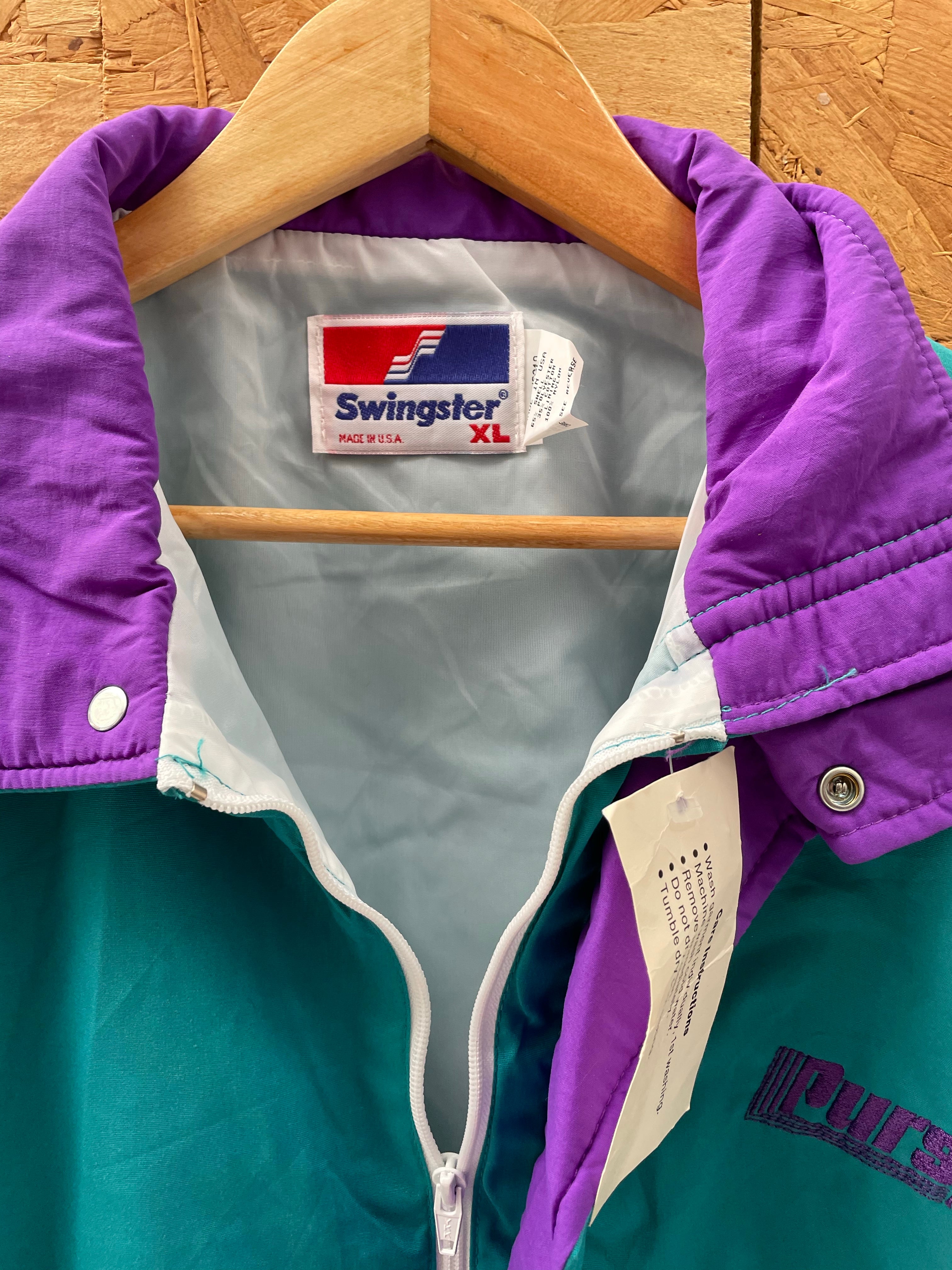 Vintage Swingster Pursuit jacket in teal and purple. Size XL. Excellent condition. Features a full zip closure and snap buttons. A retro 90s style windbreaker. Color: Teal, Purple.