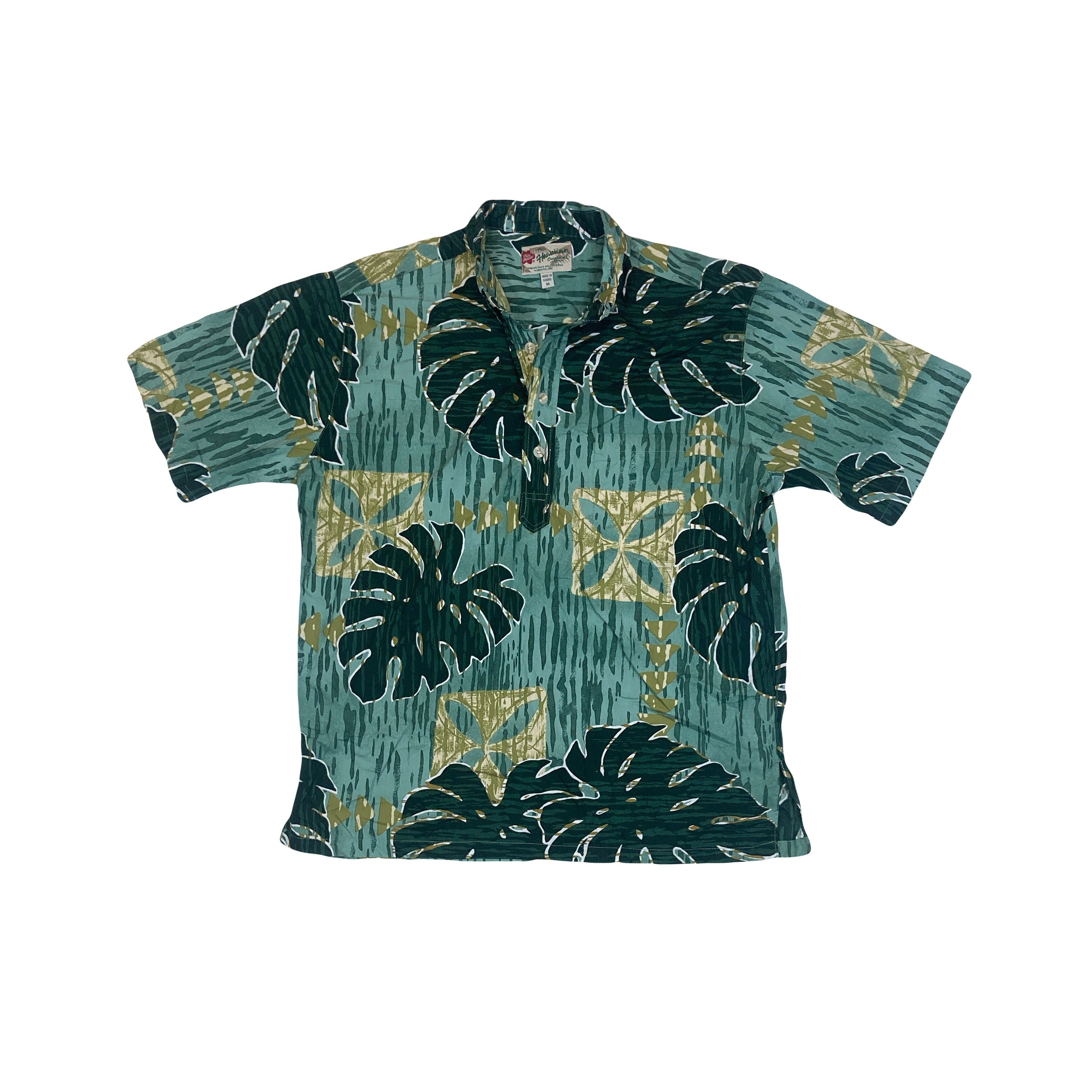 Vintage 90s teal olive green bold leaf pattern hawaiian ugly party shirt sleeve shirt by Hilo Hattie size medium