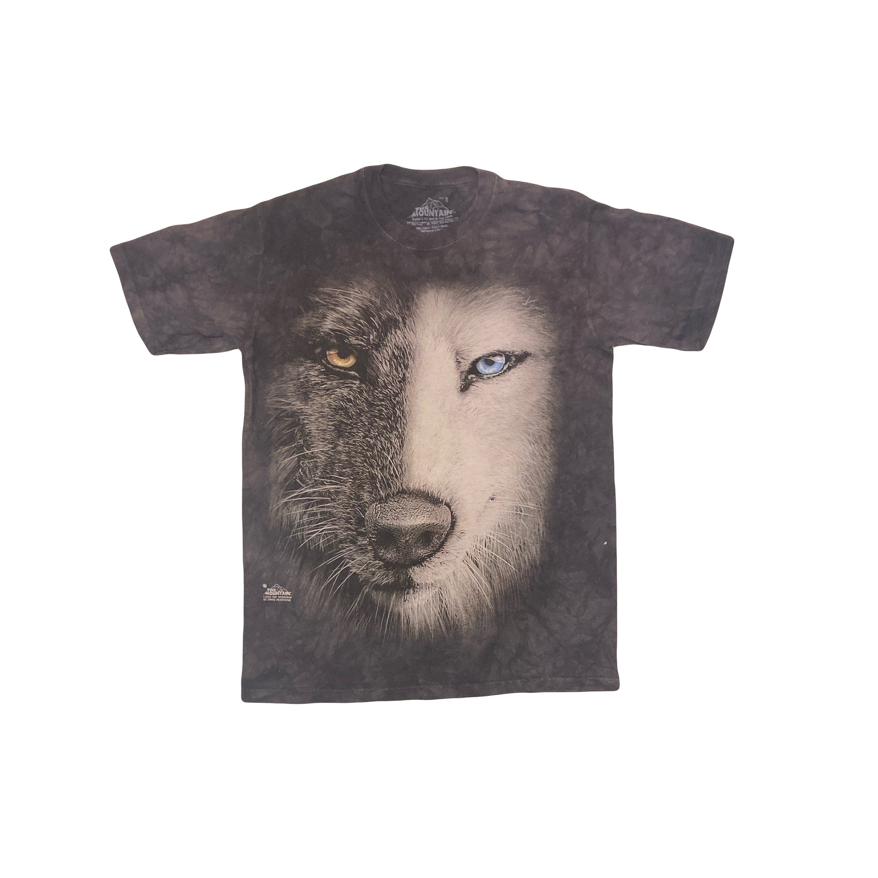 Vintage 90s The Mountain USA animal printed tie dye grey black wolf nature t shirt size small.