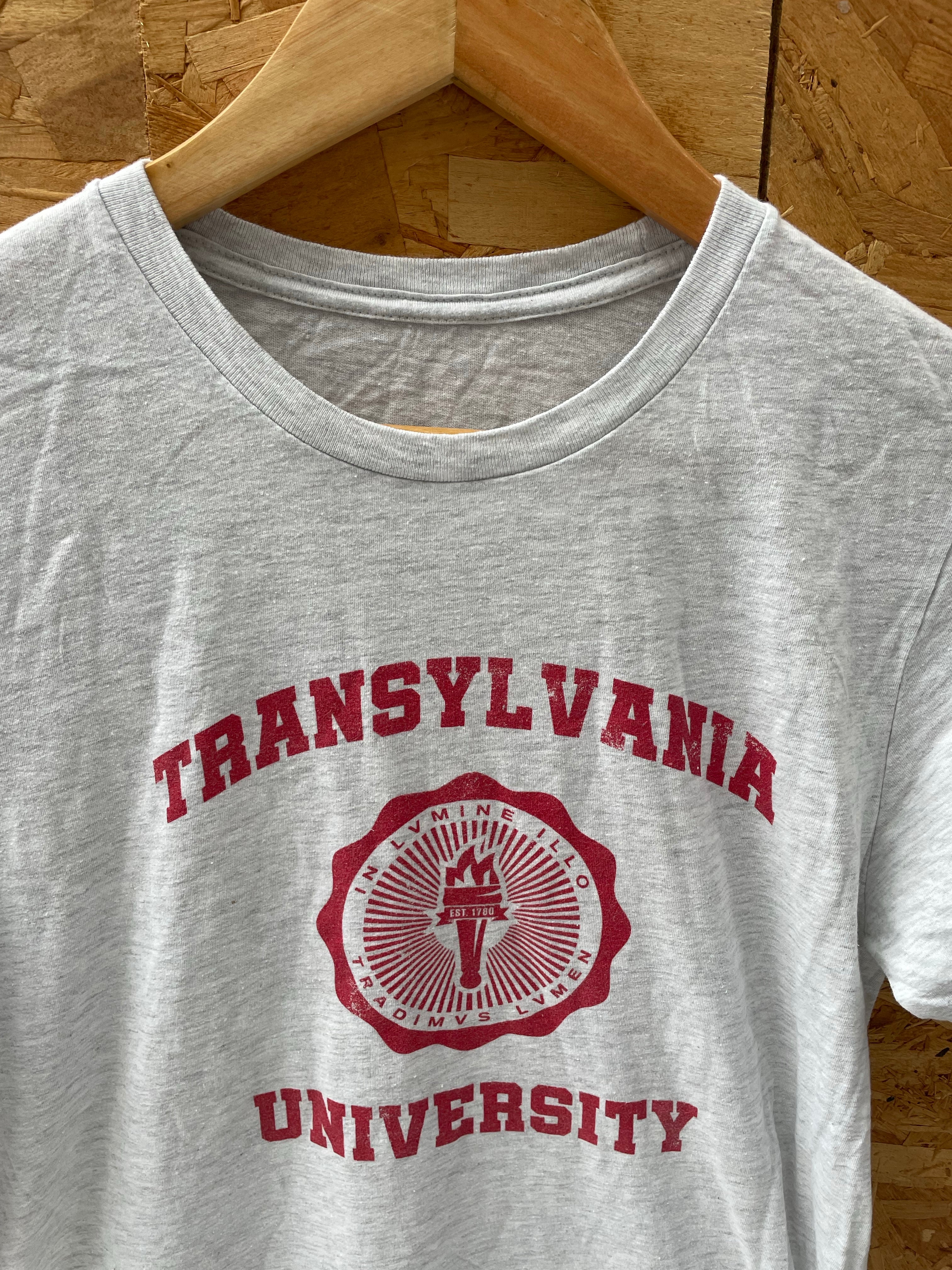 Transylvania University gray t-shirt. Features a maroon university logo print. Short sleeves, crew neck. Good condition. Color: Gray.