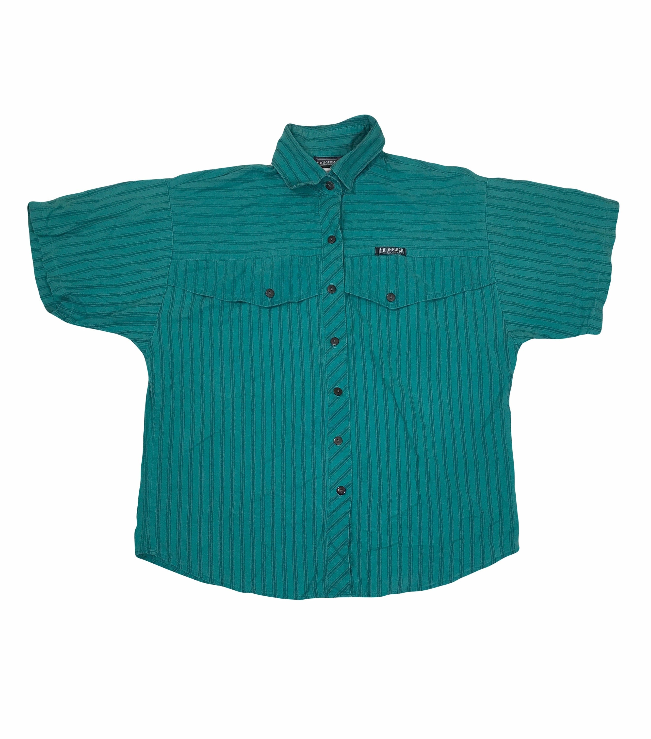 Vintage 90s turquoise blue stripe twin pocket cowboy western short sleeve shirt by Roughrider size medium